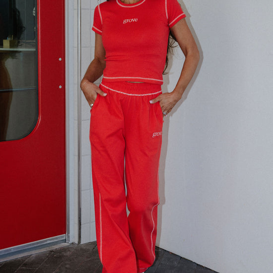 wide leg lounge pants featuring exposed stitching along the trim, stretchy waistband allows for fold over