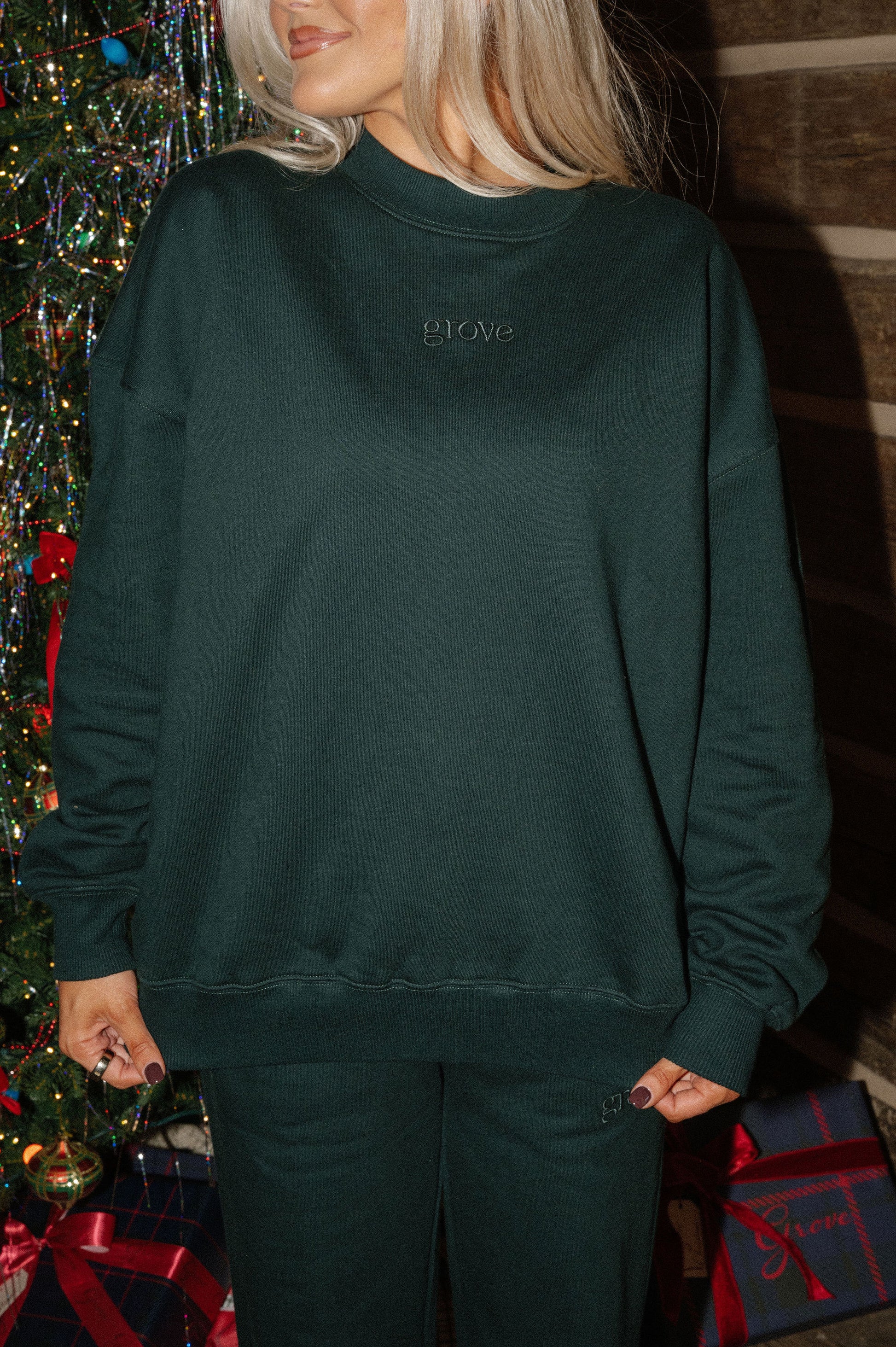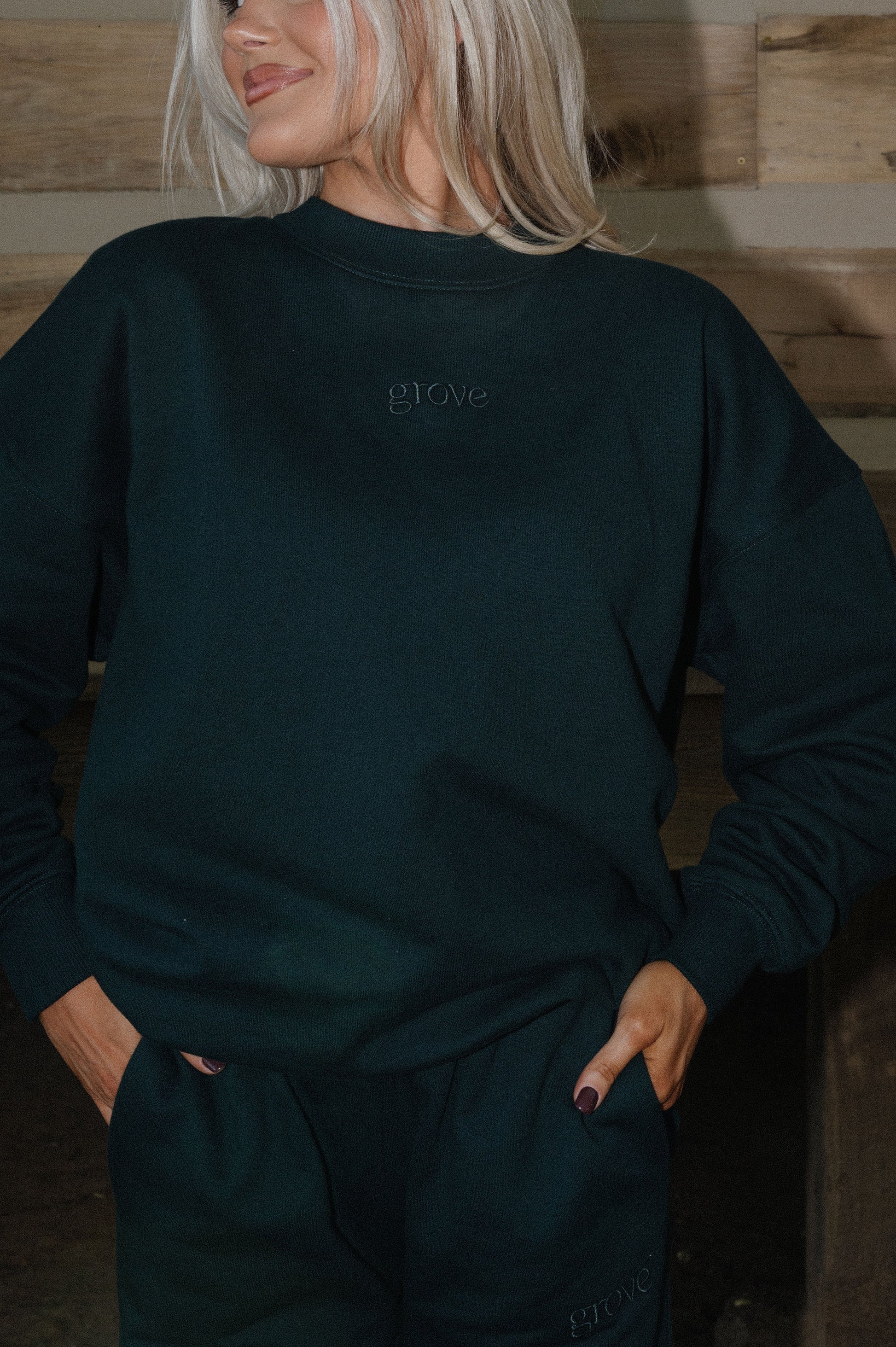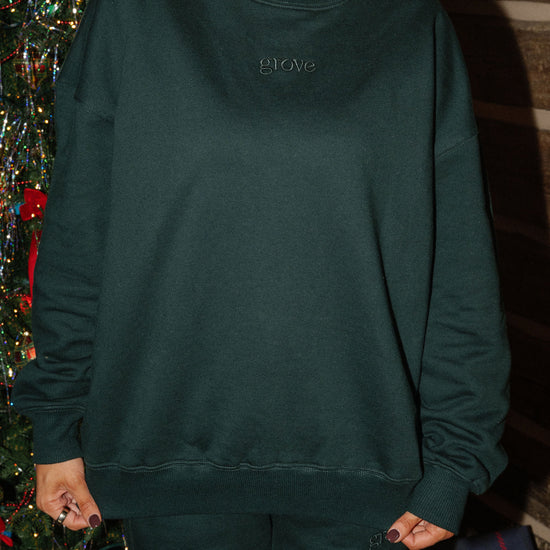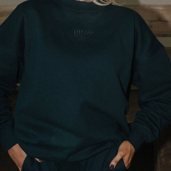 crewneck sweatshirt featuring a tonal embroidered grove on the front