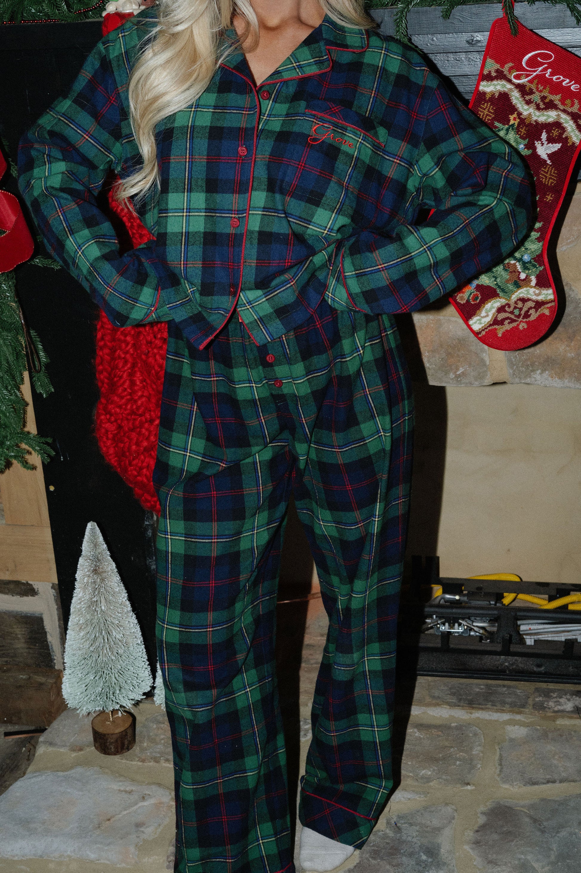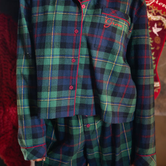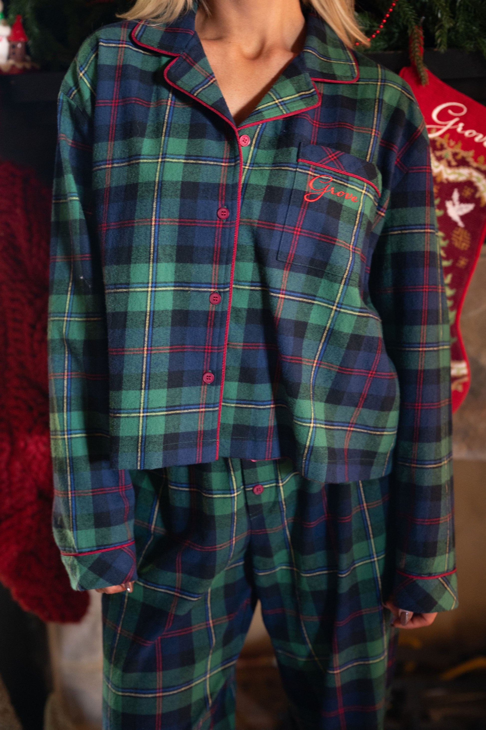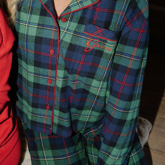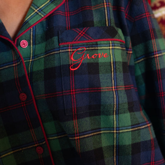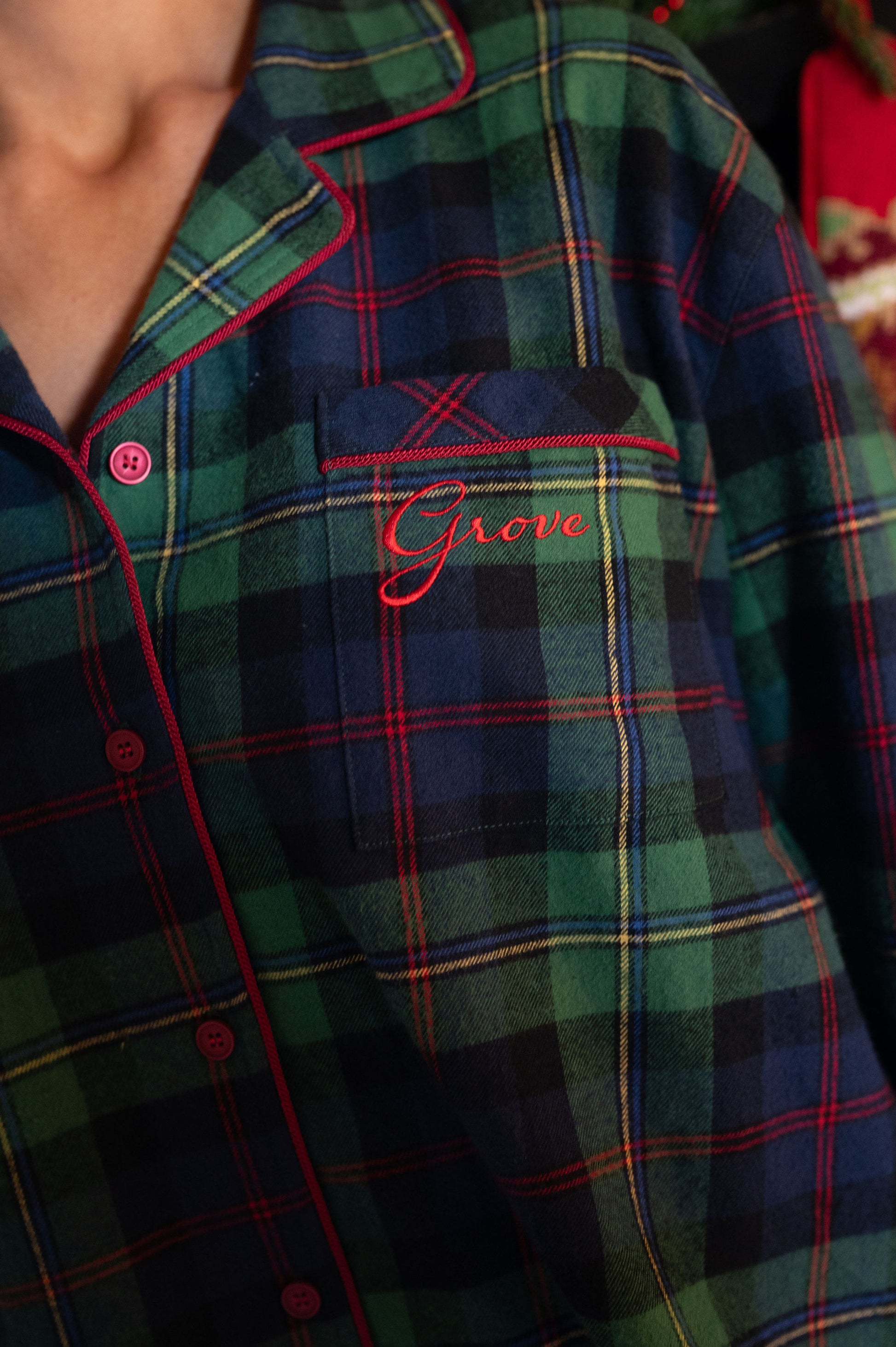 features a button up front, collared neckline, a boxy fit, red piping, and a cursive embroidered Grove on the front pocket