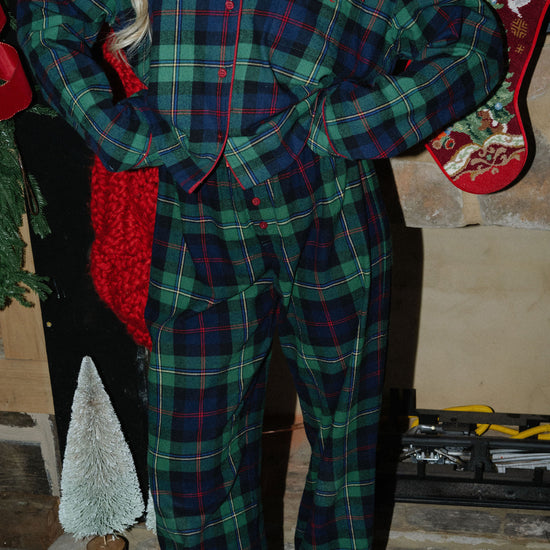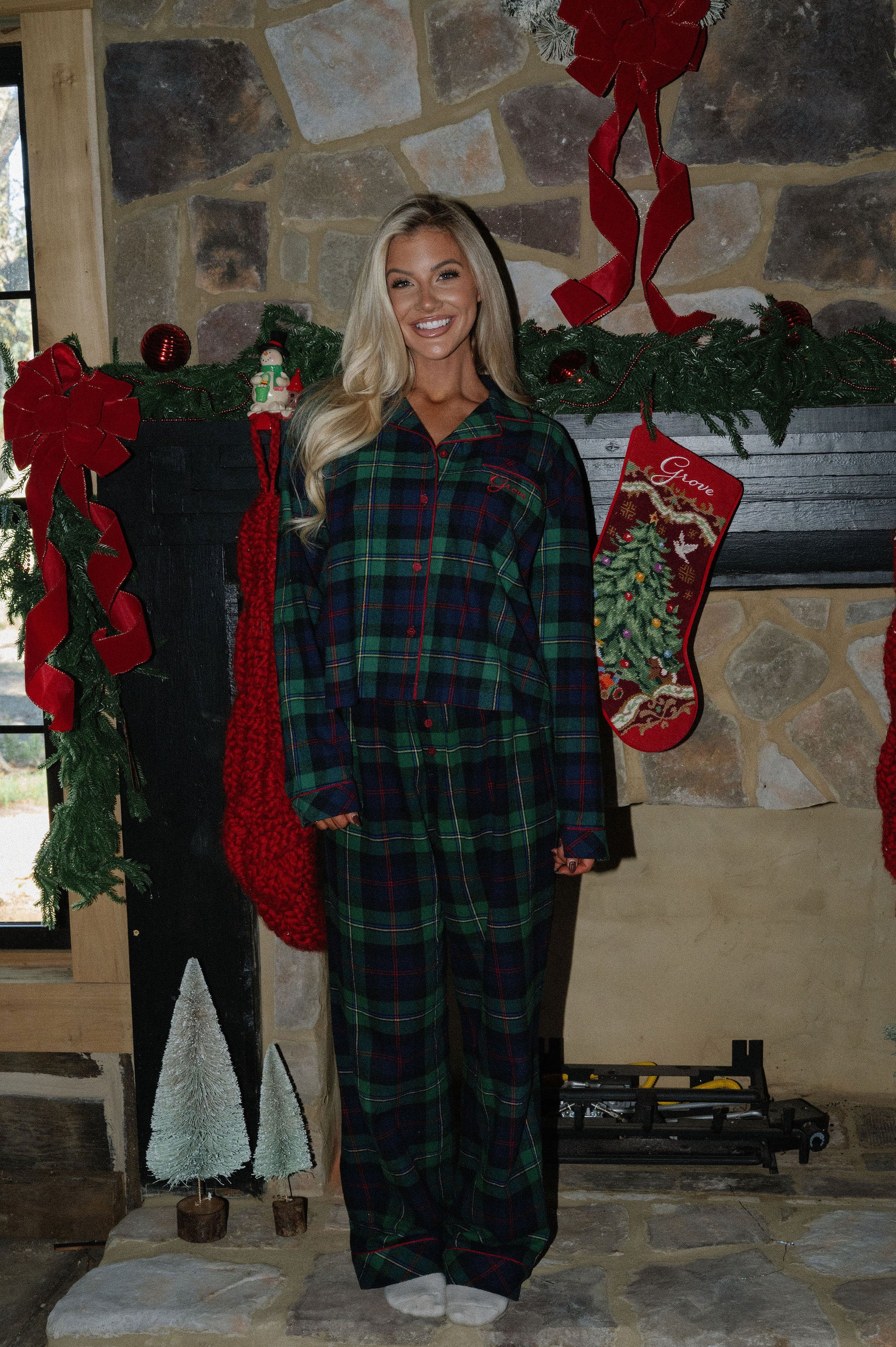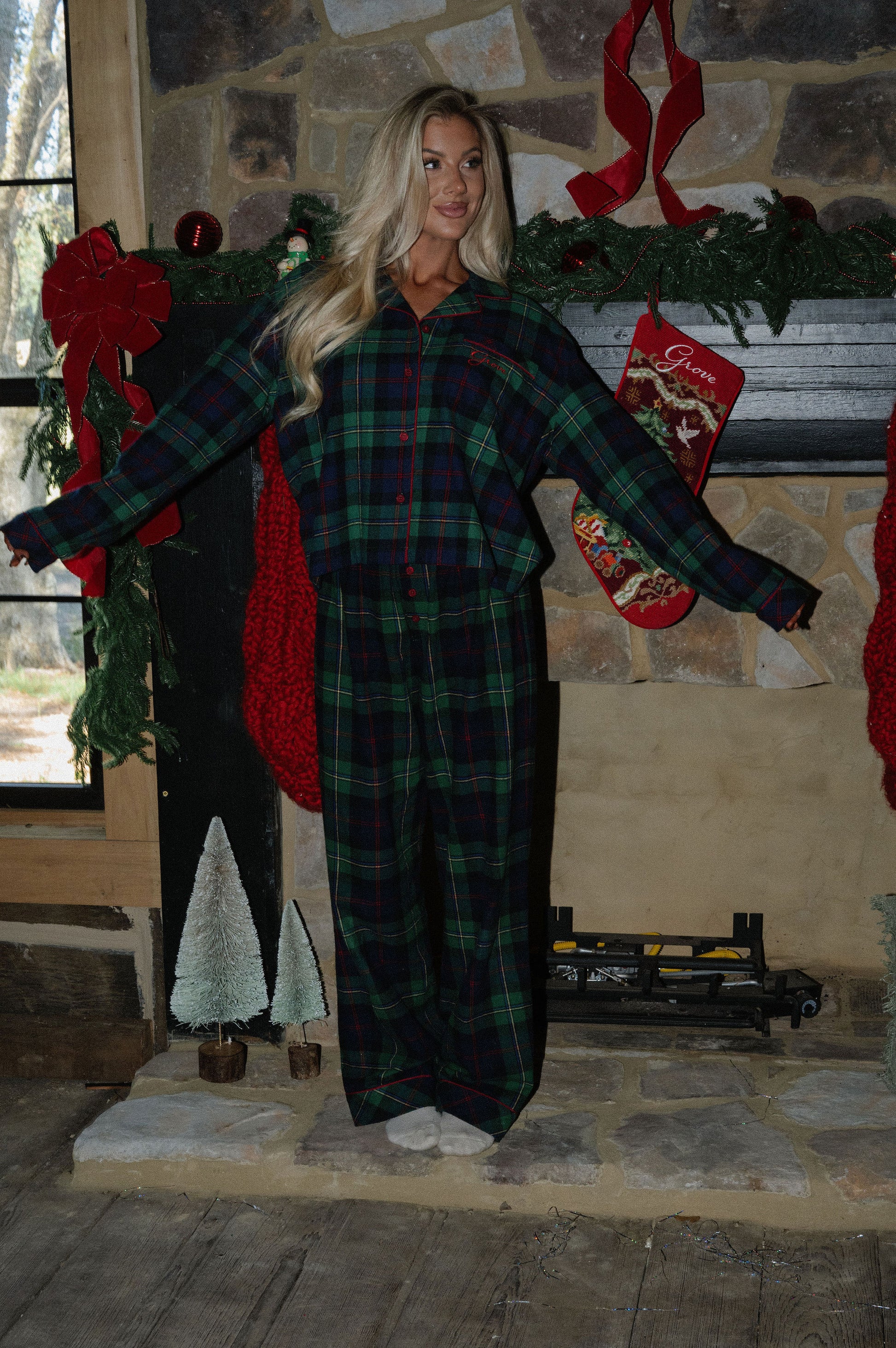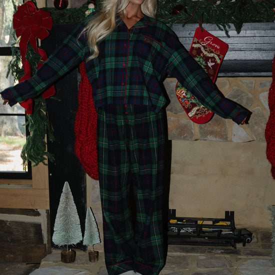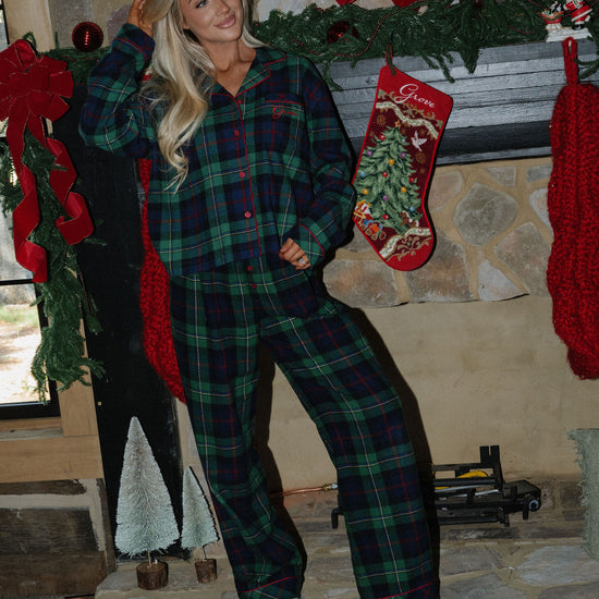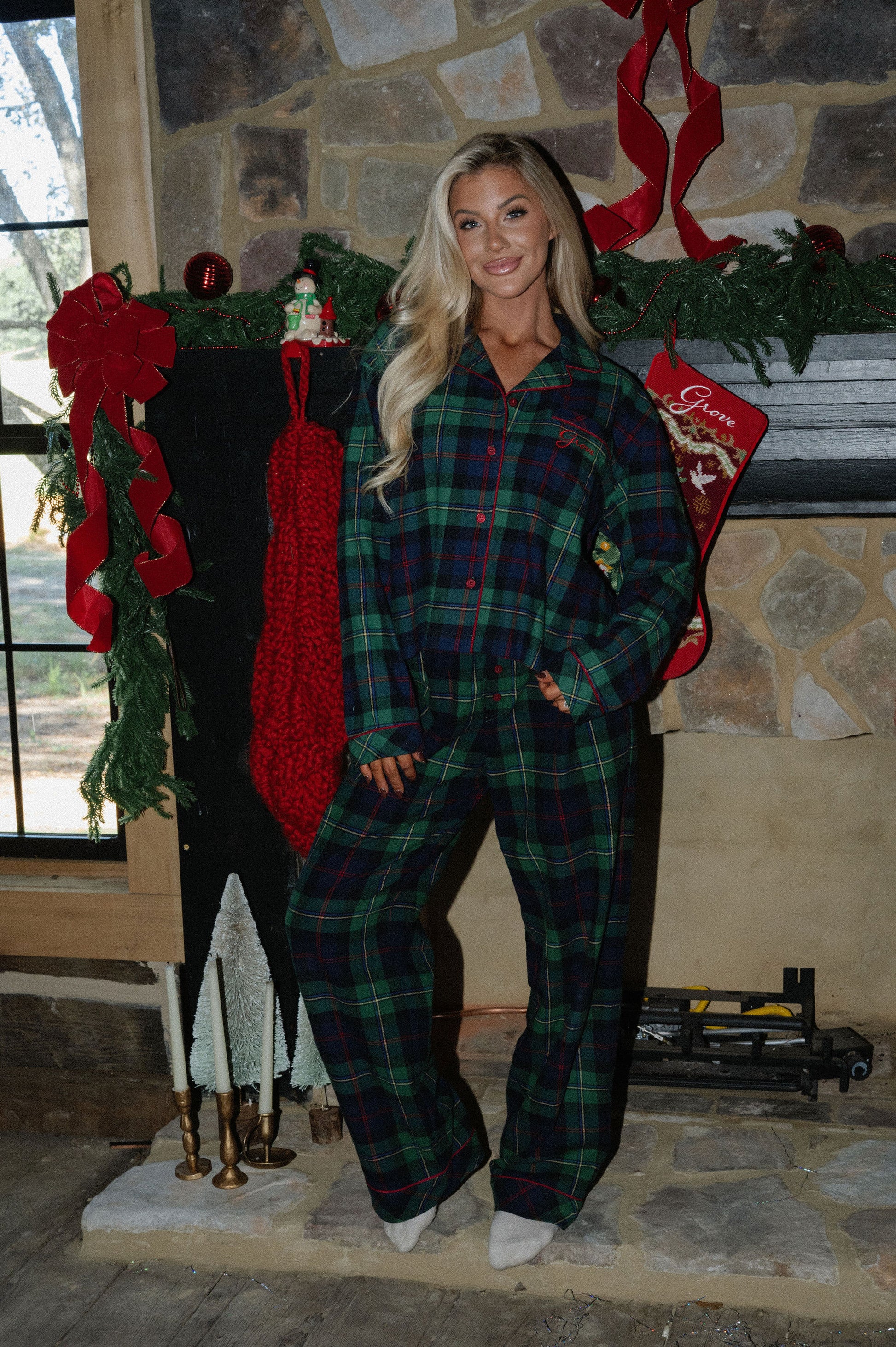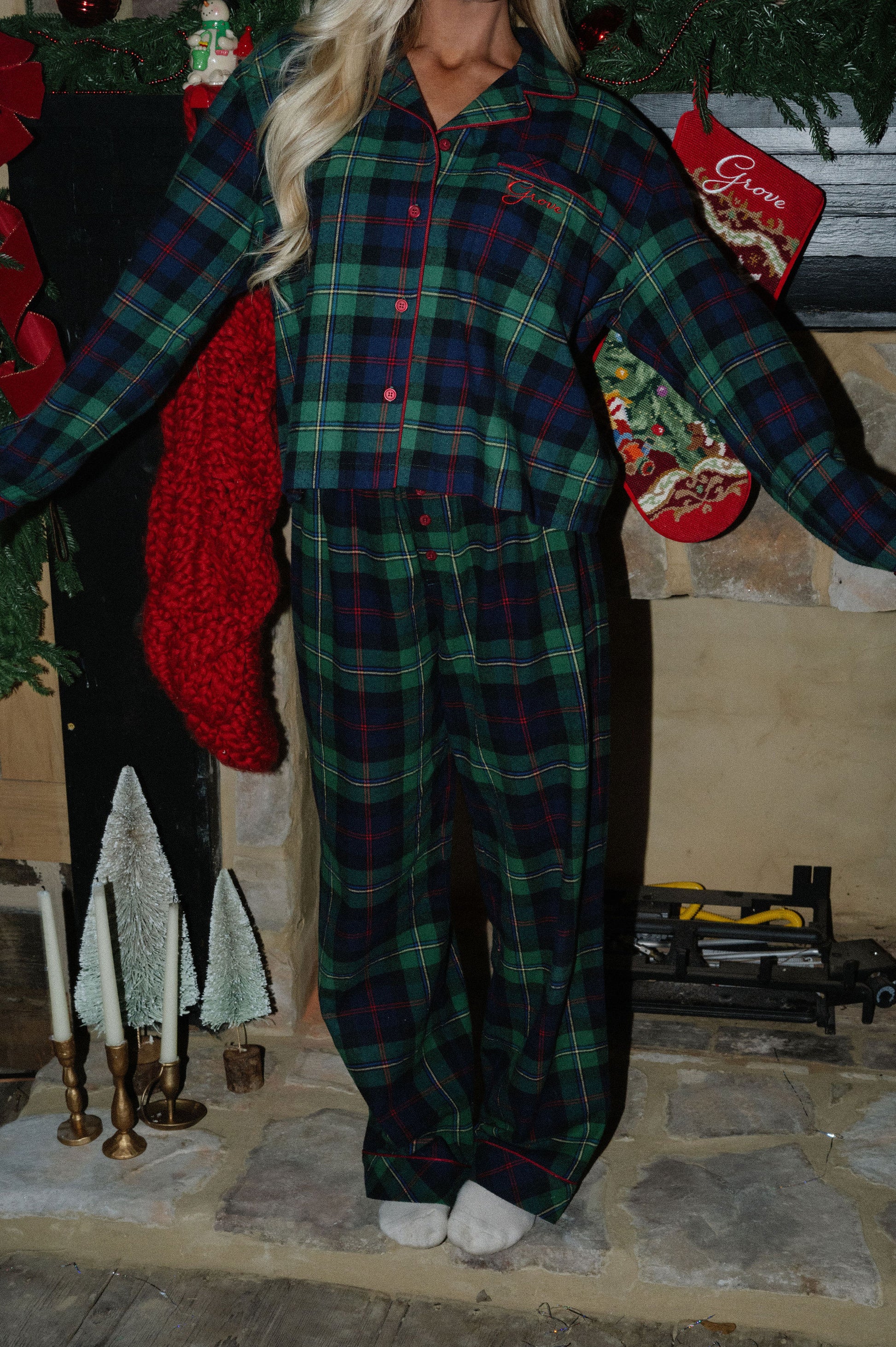 features a button up front, collared neckline, a boxy fit, red piping, and a cursive embroidered Grove on the front pocket