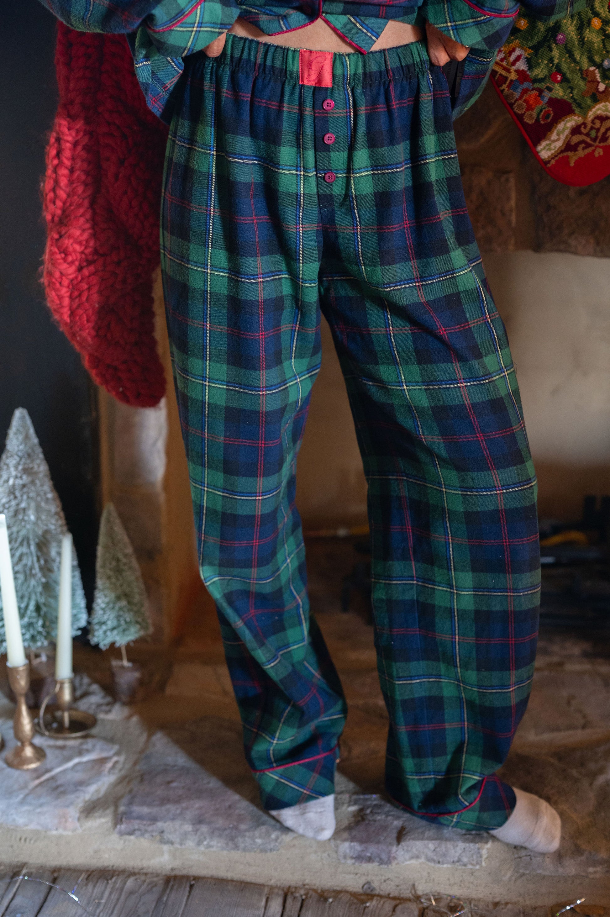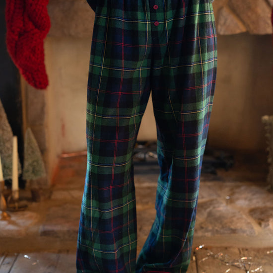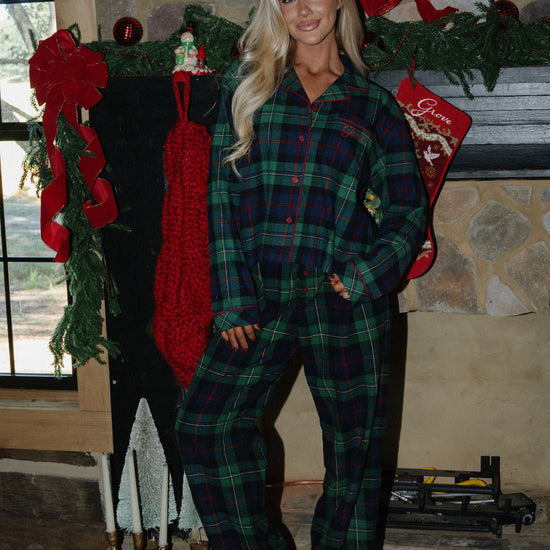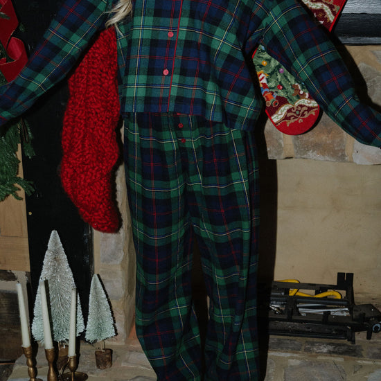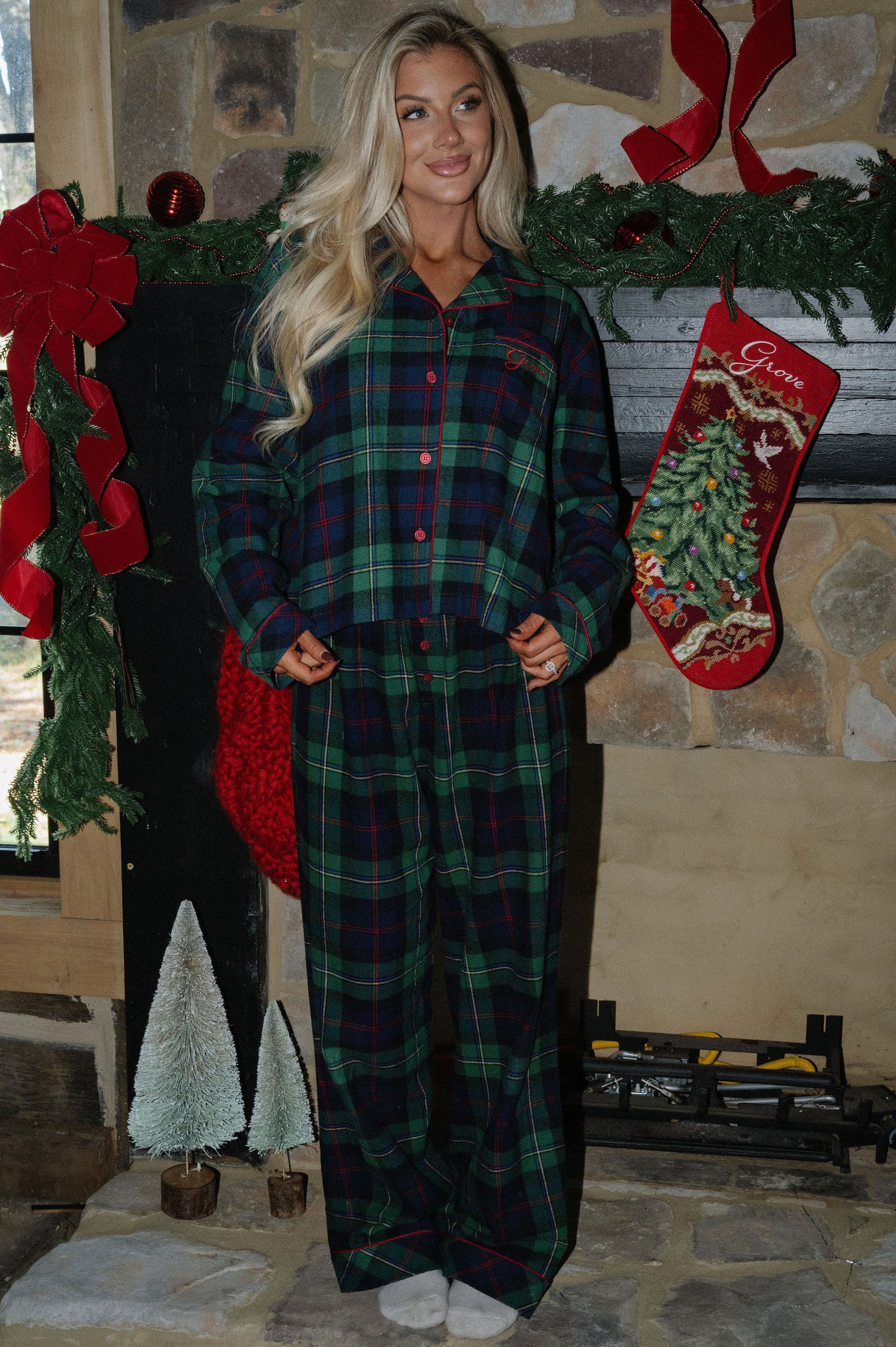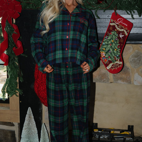 features a high waistline and wide leg fit, complete with a red centered patch with a cursive G