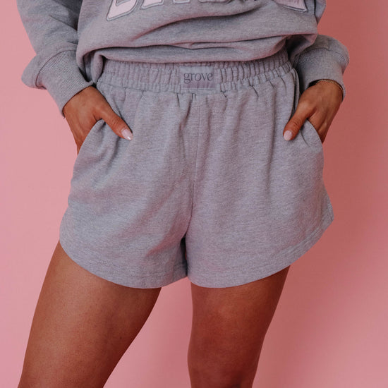 our fleece shorts are high waisted with small side slits, side pockets, and curved bottom hem