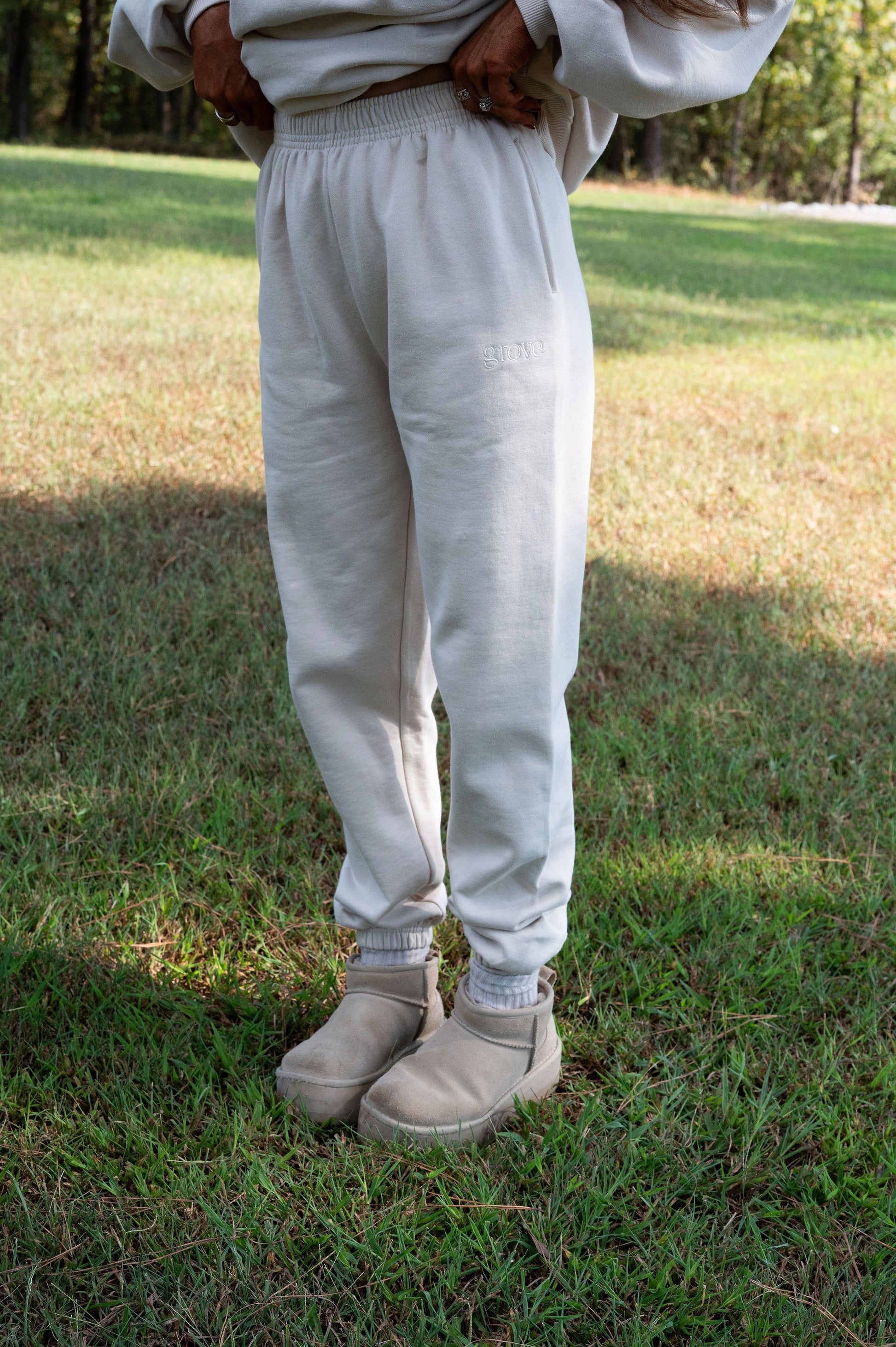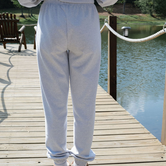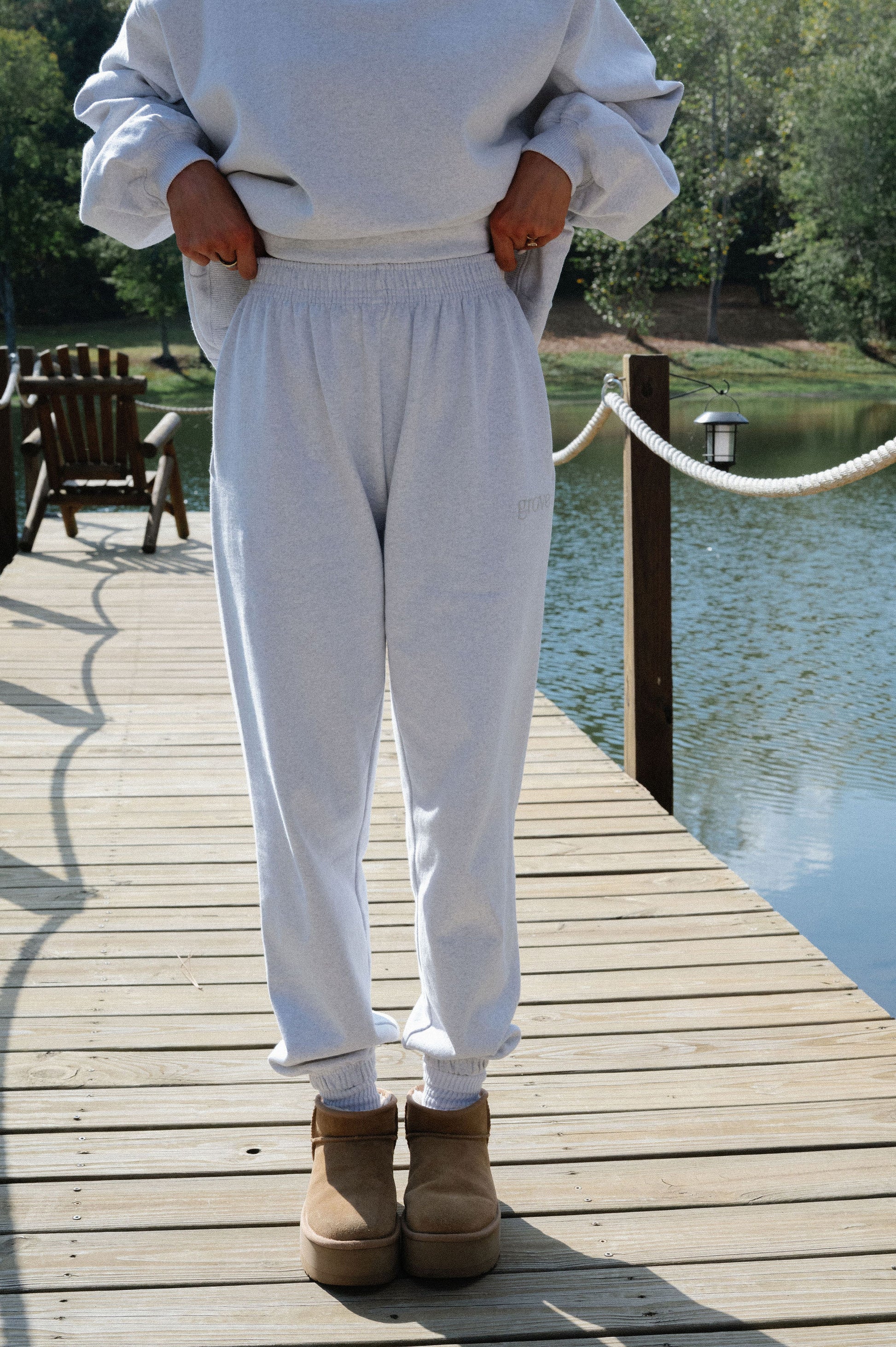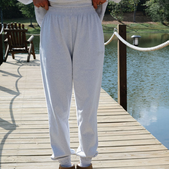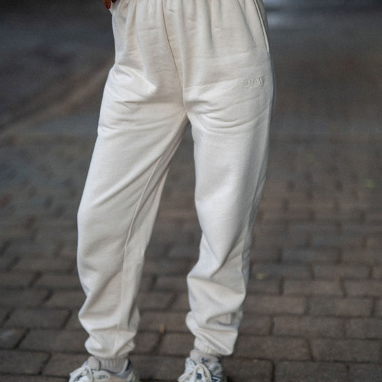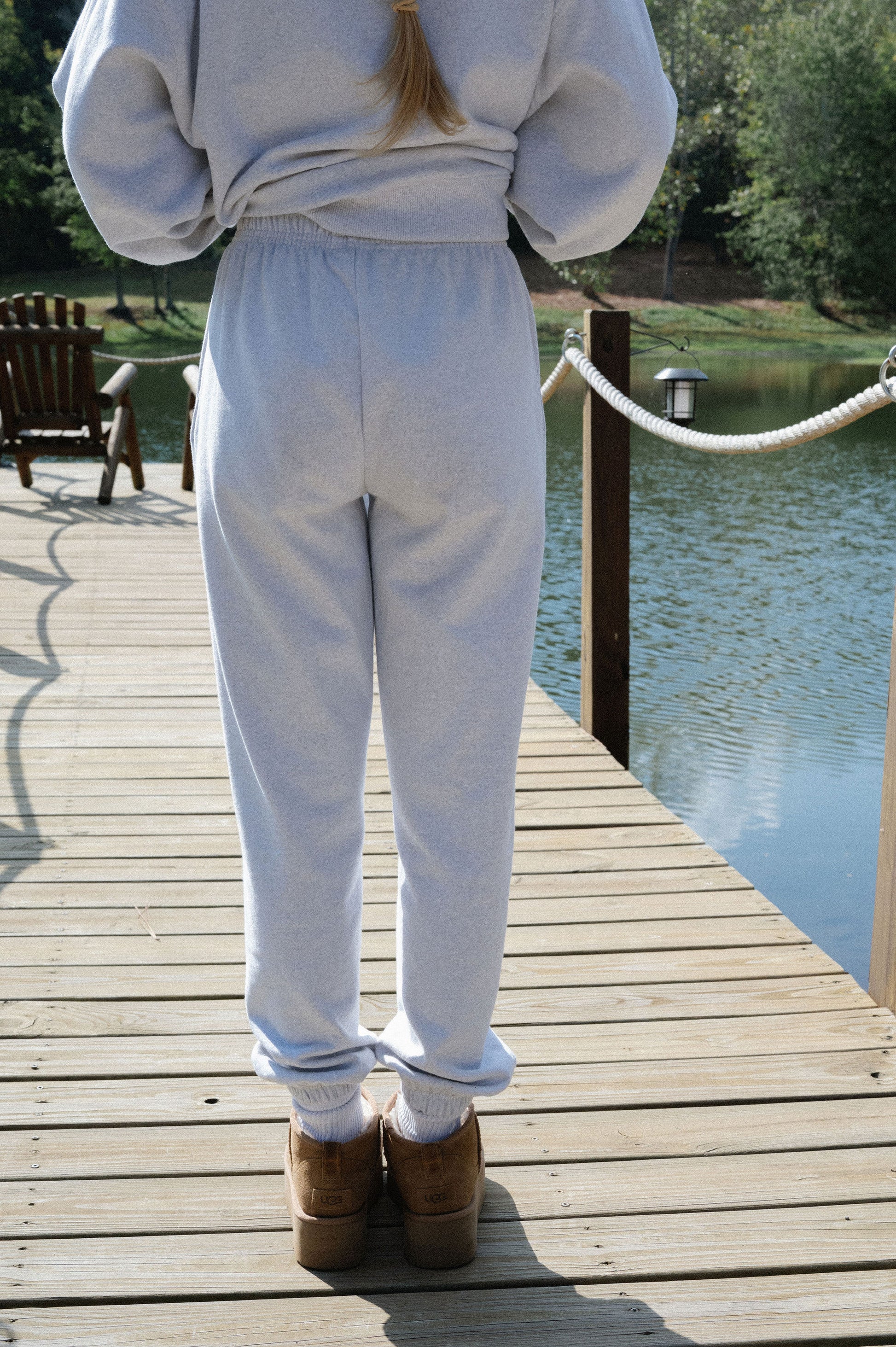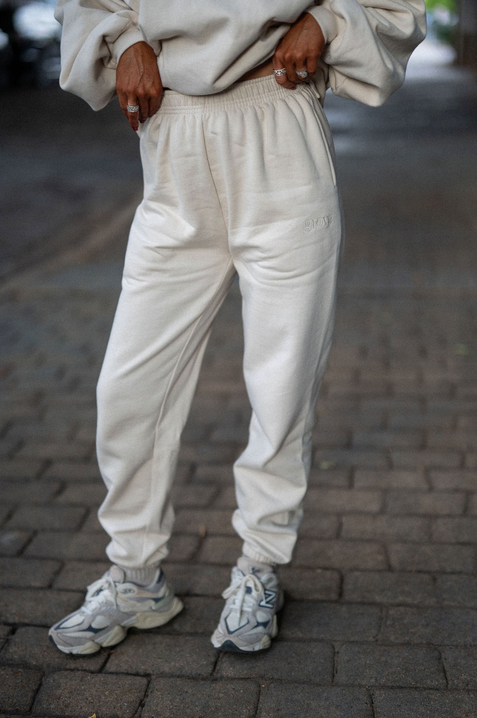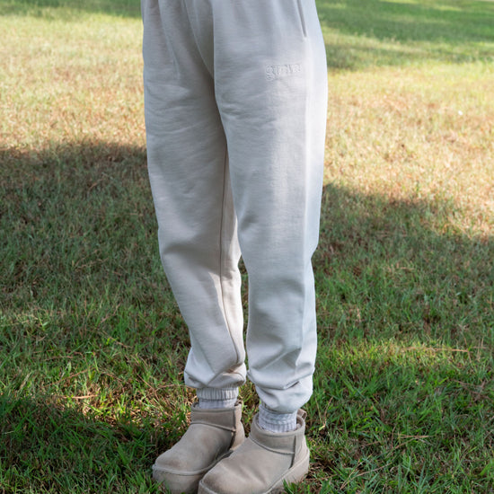 cotton jogger sweatpant, high waisted, side pockets, tonal embroidery below the pocket