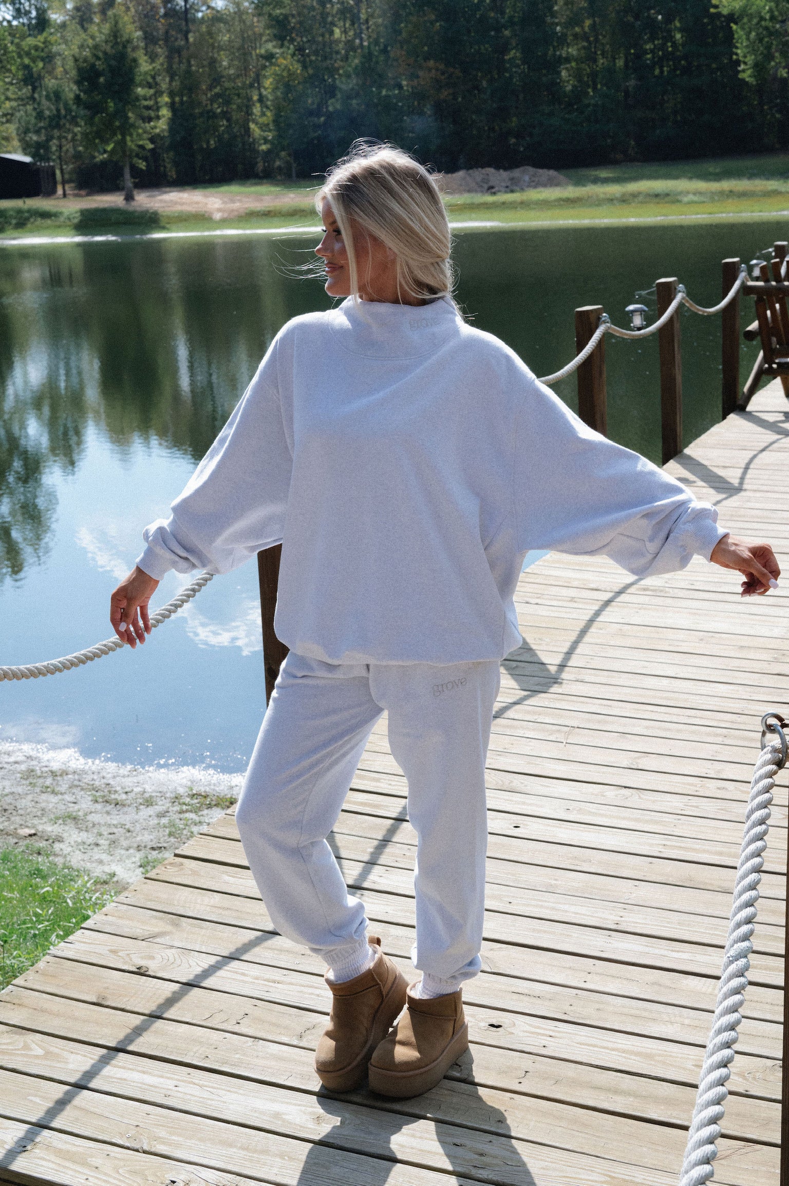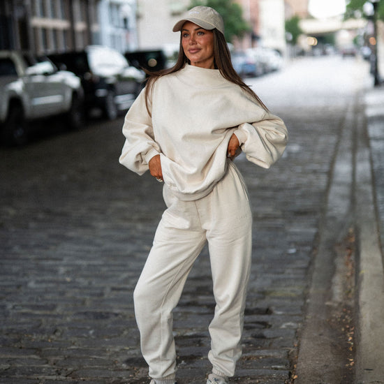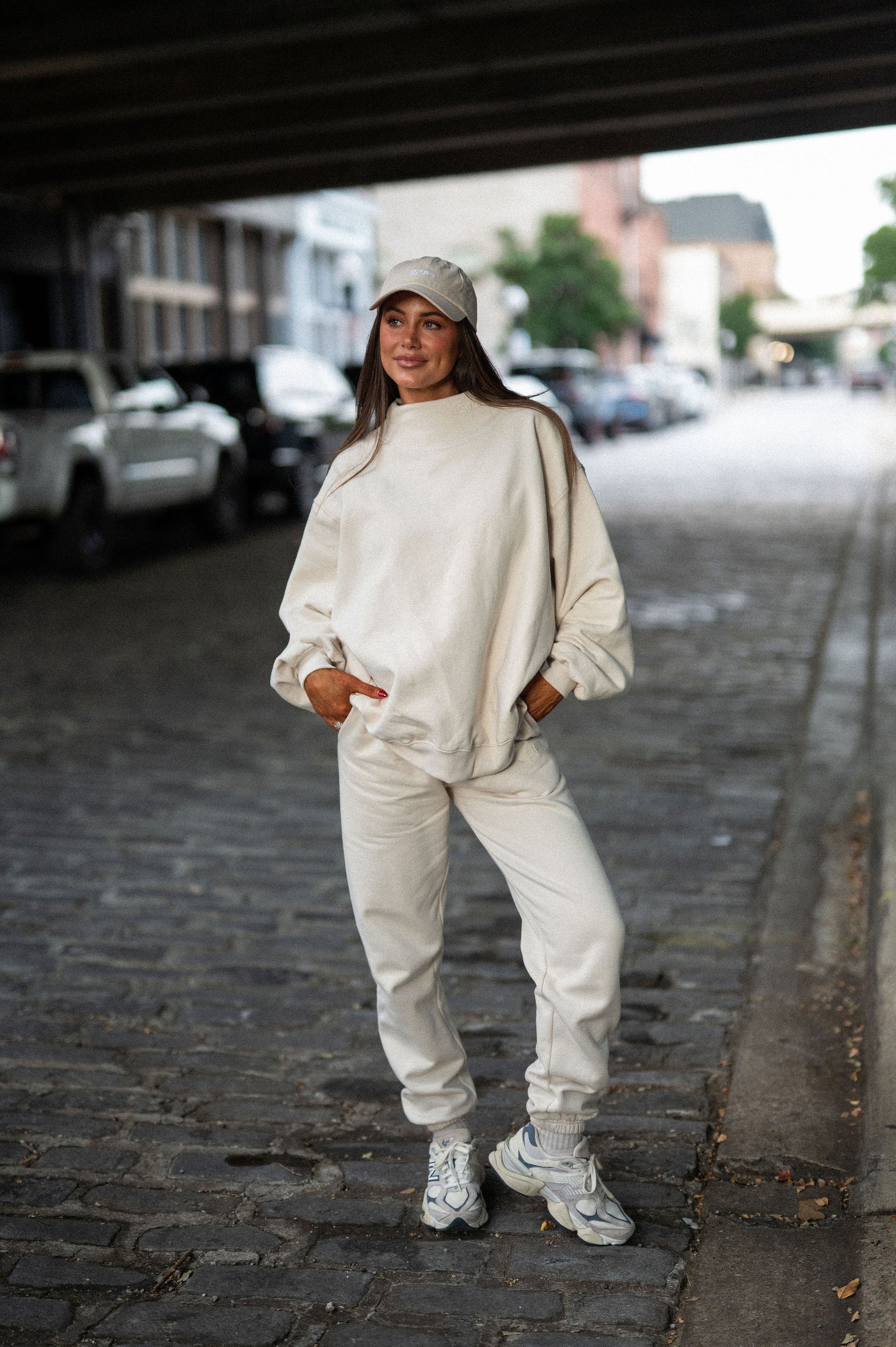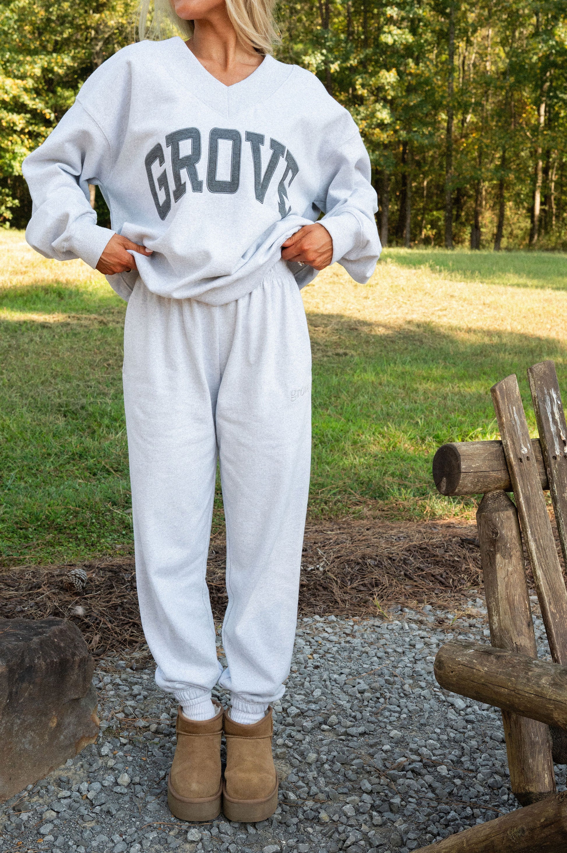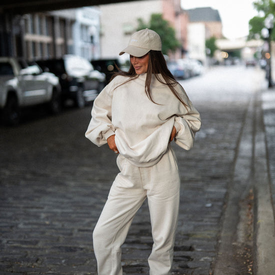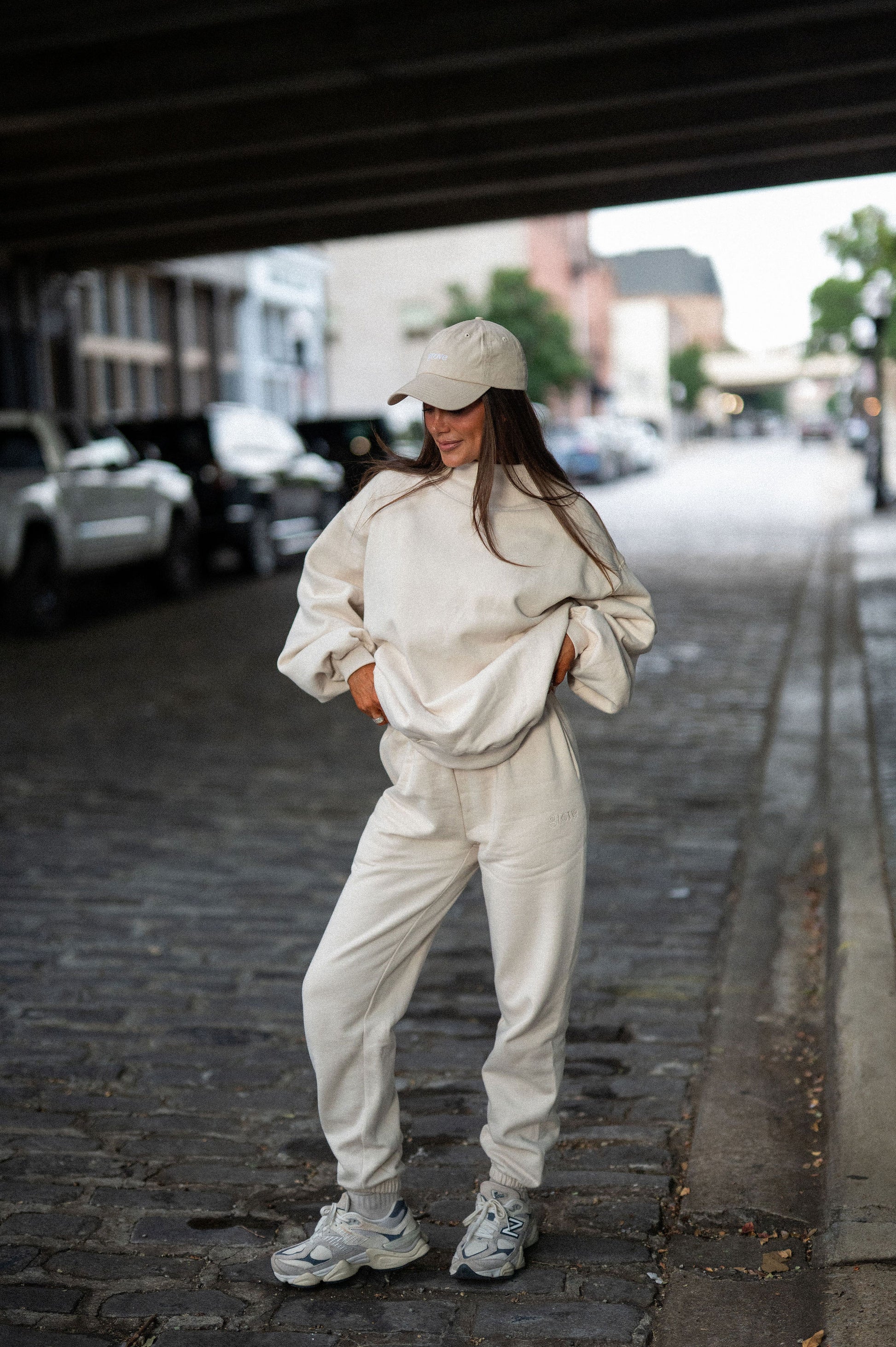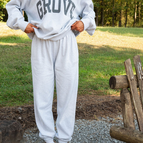 cotton jogger sweatpant, high waisted, side pockets, tonal embroidery below the pocket