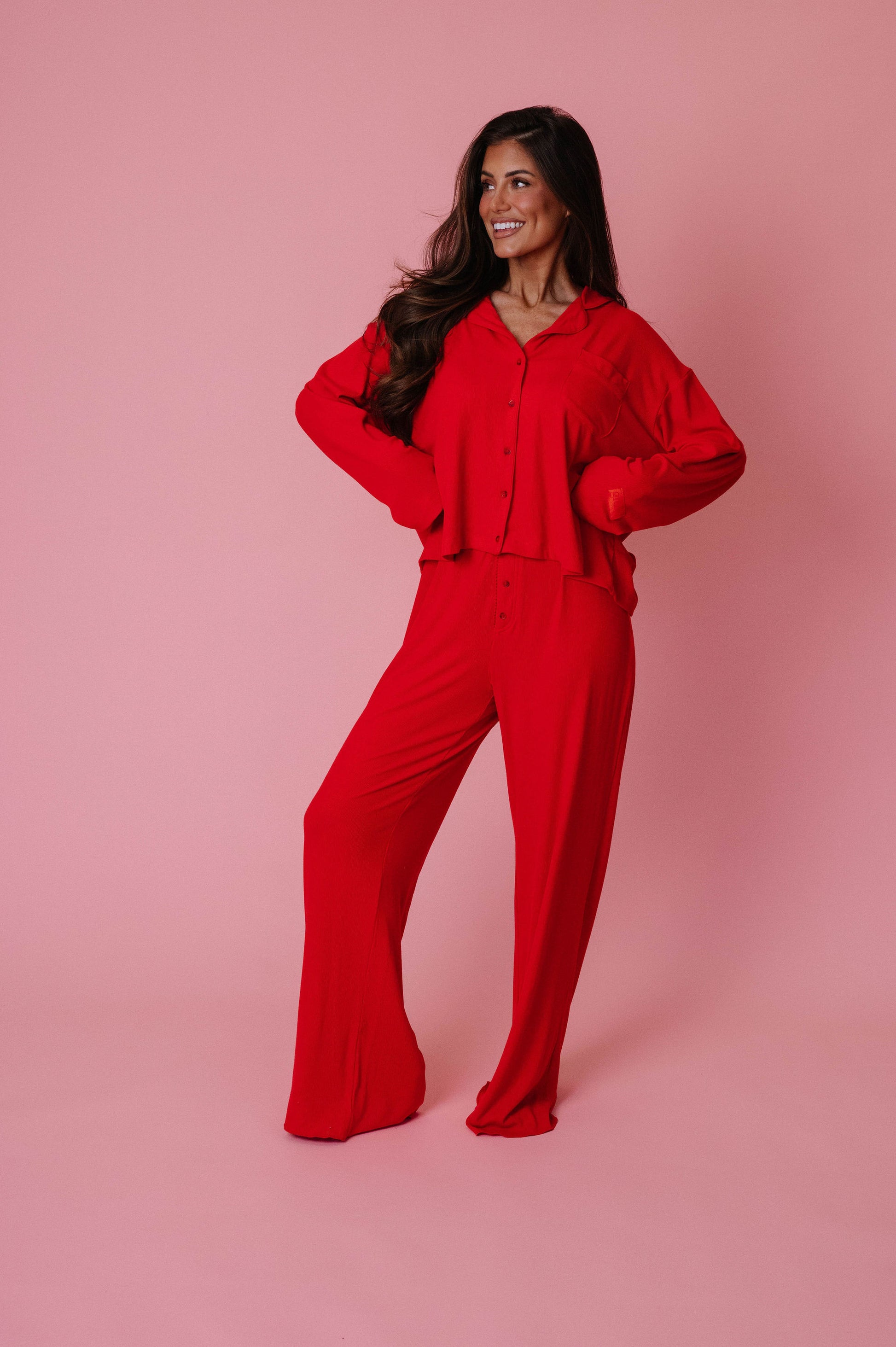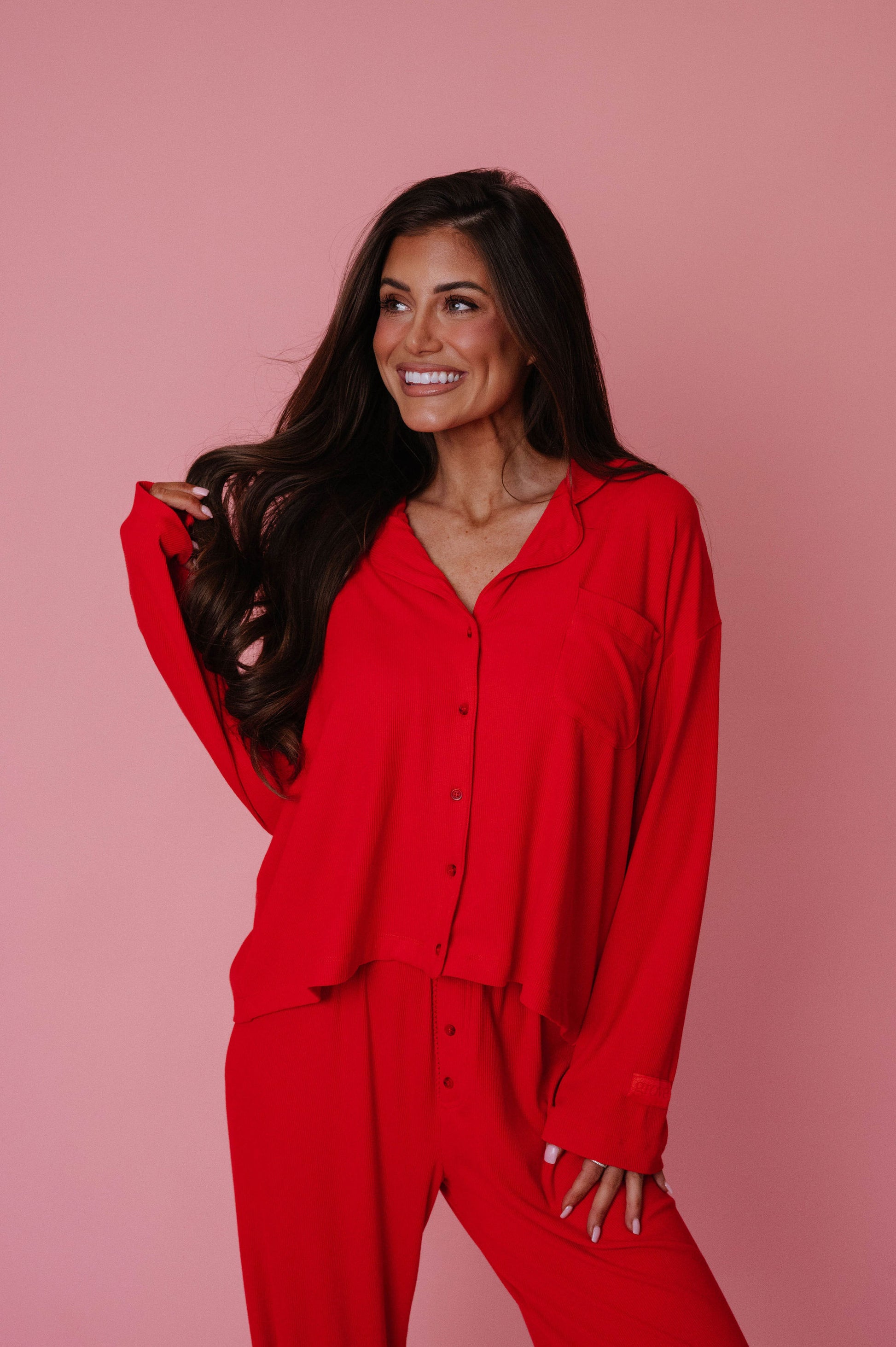 loose button up pajama top in ribbed cotton with a tonal sleeve patch