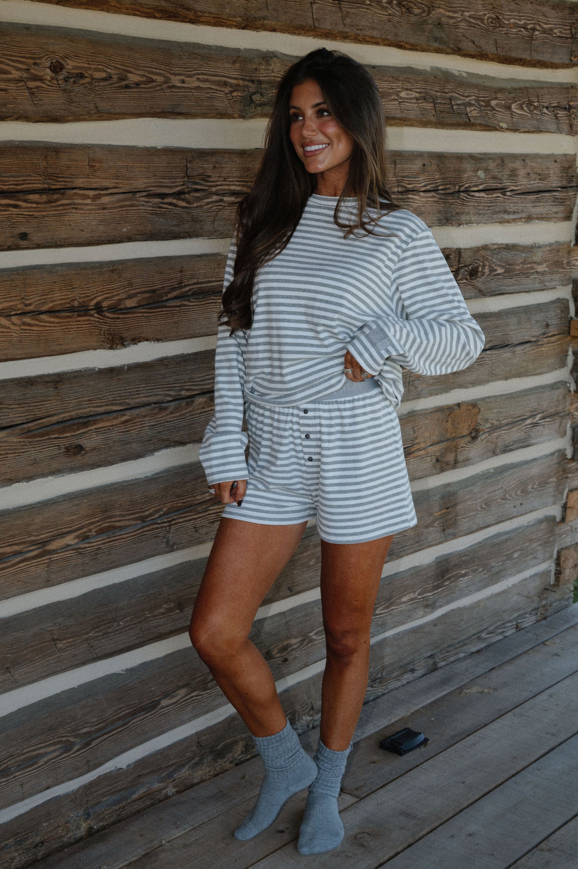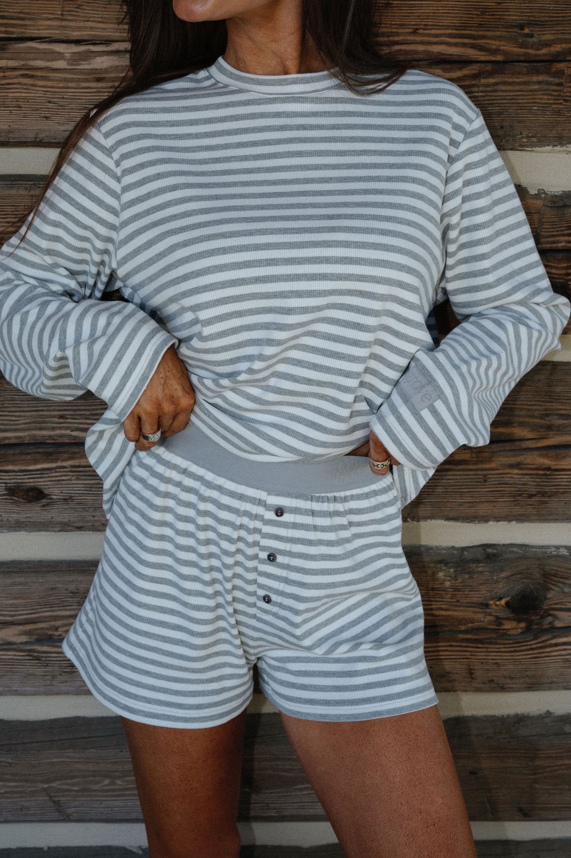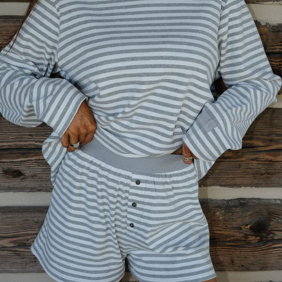 our oversized long sleeve pajama top in our new white/grey stripe colorway