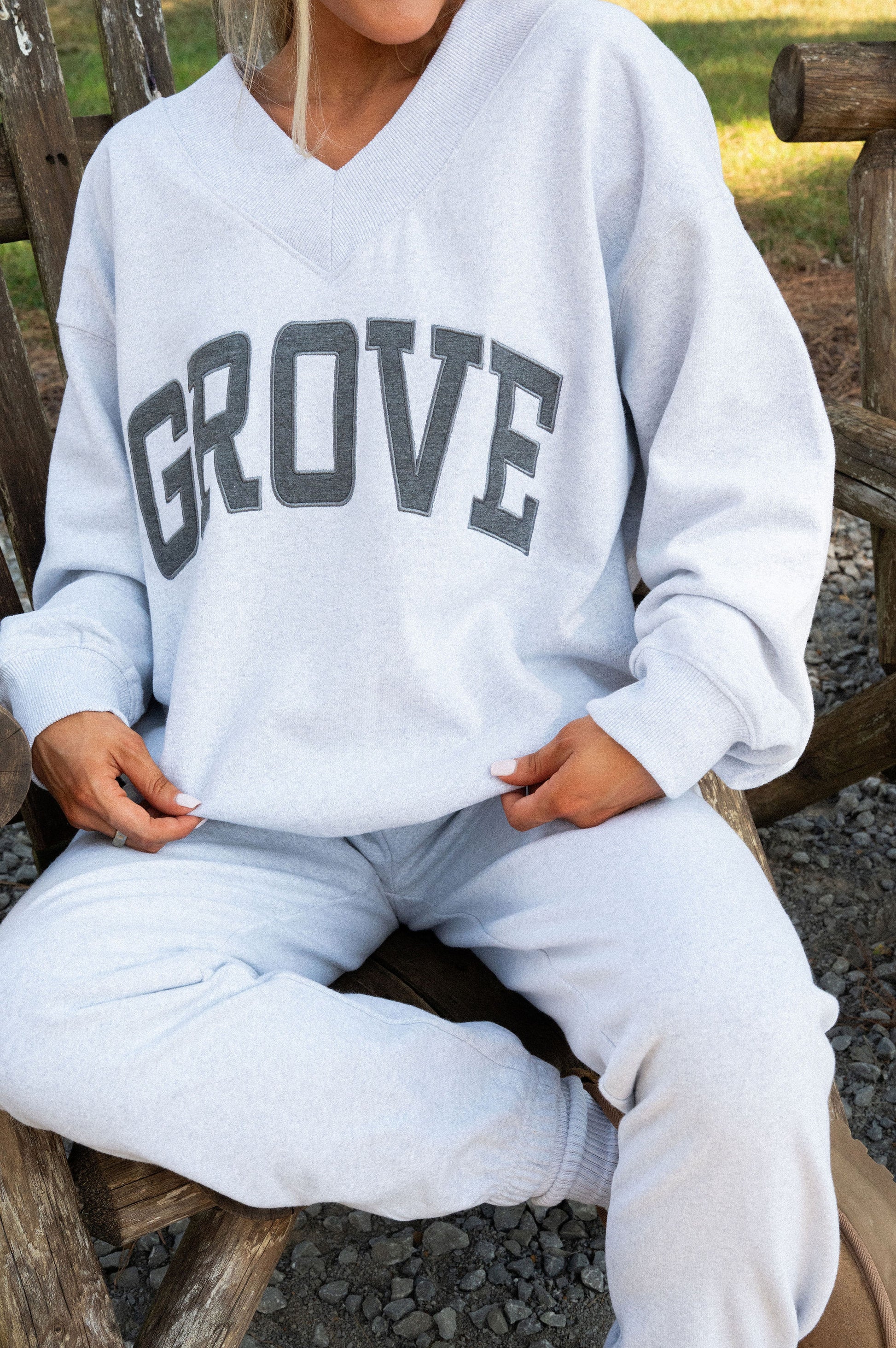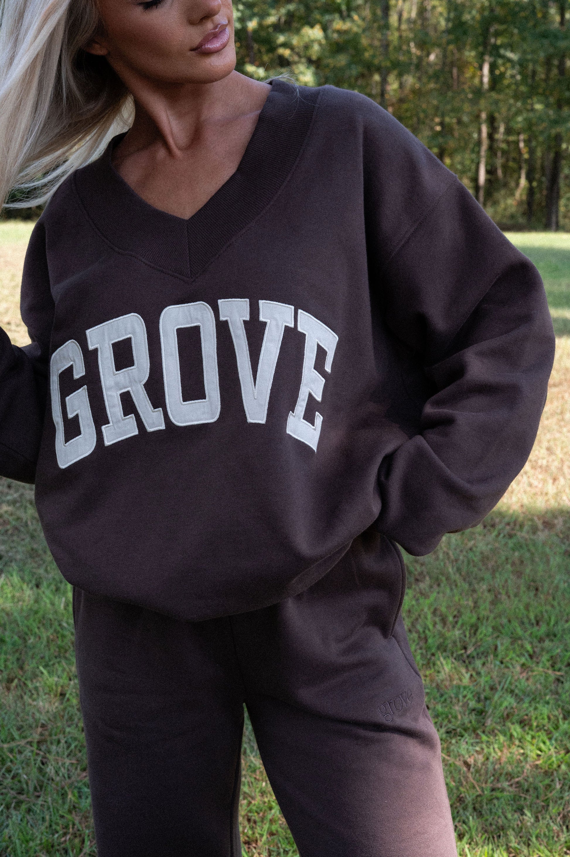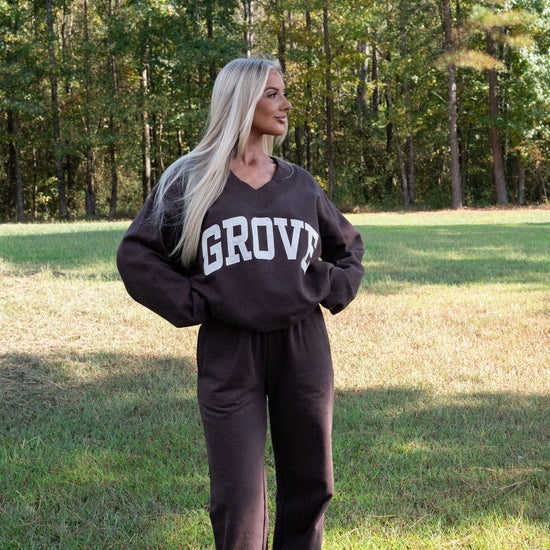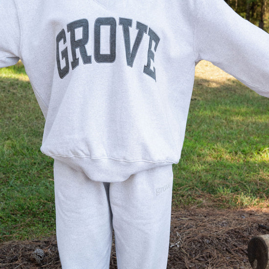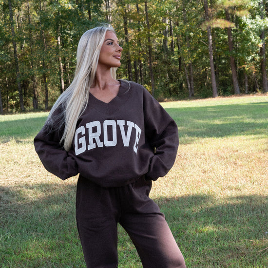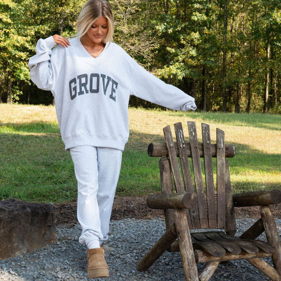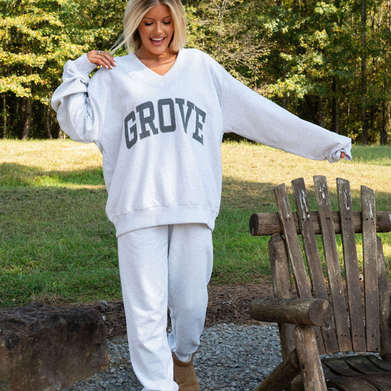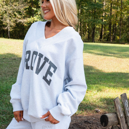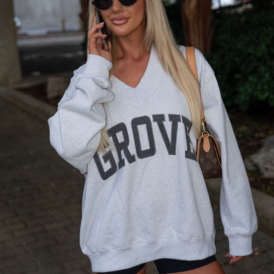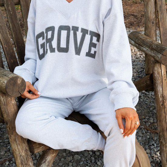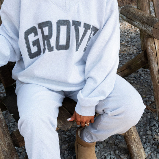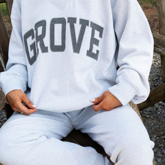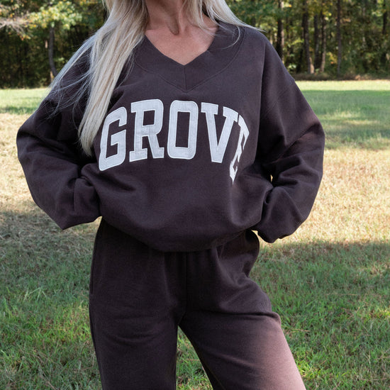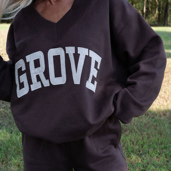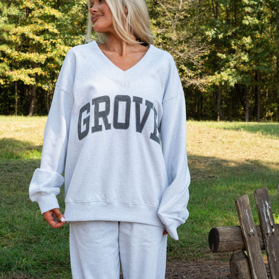 our signature V neck features ribbed trim and varsity patch Grove across the front