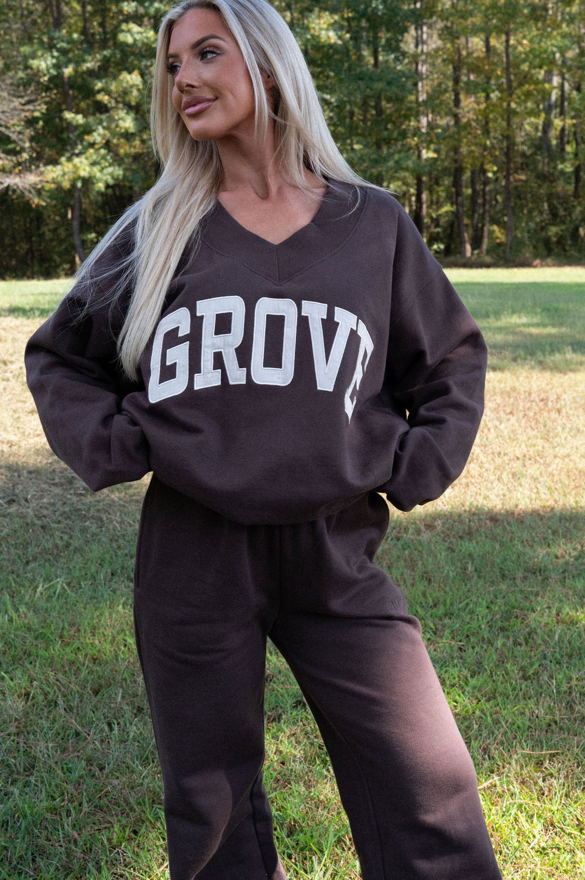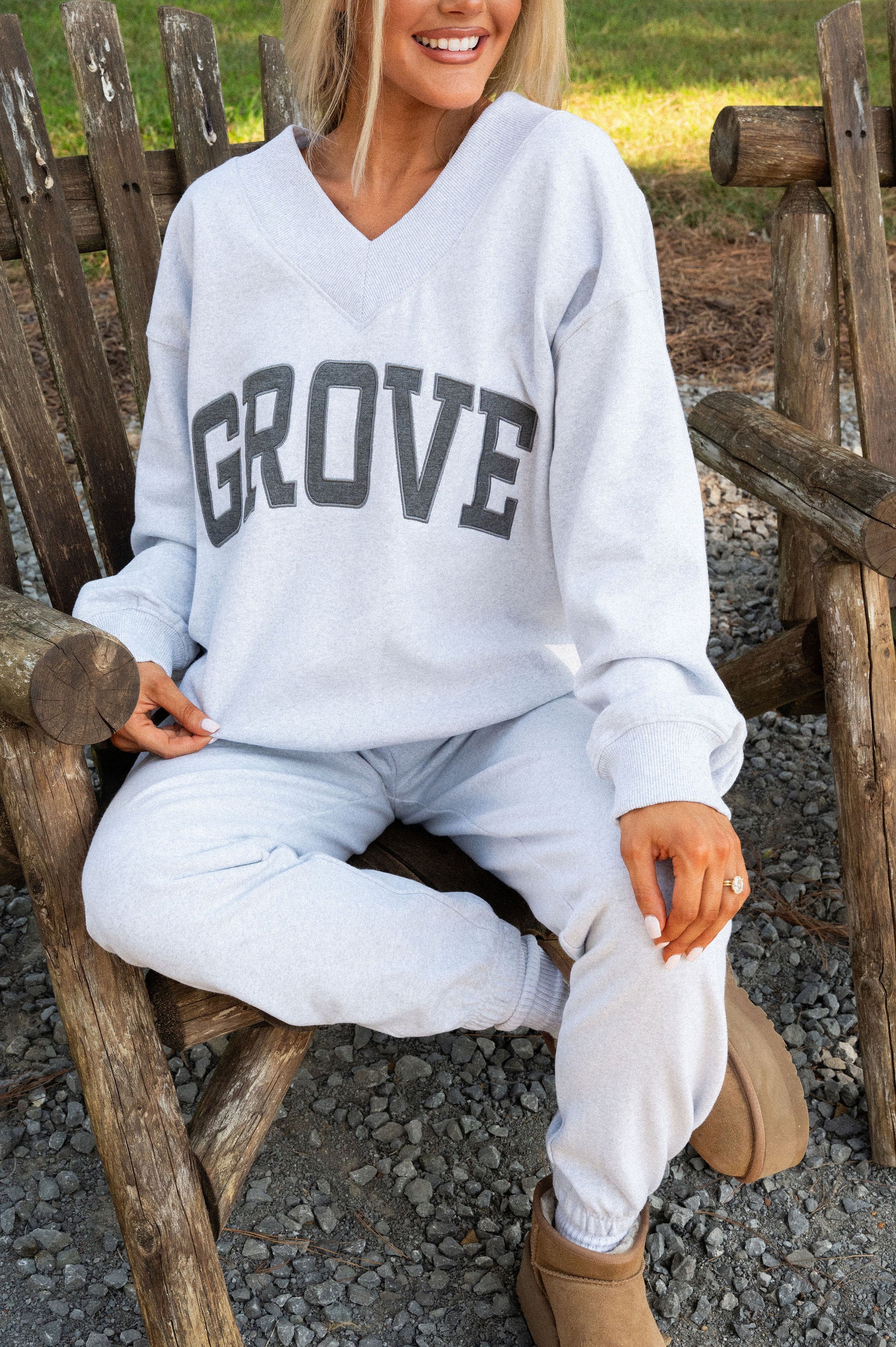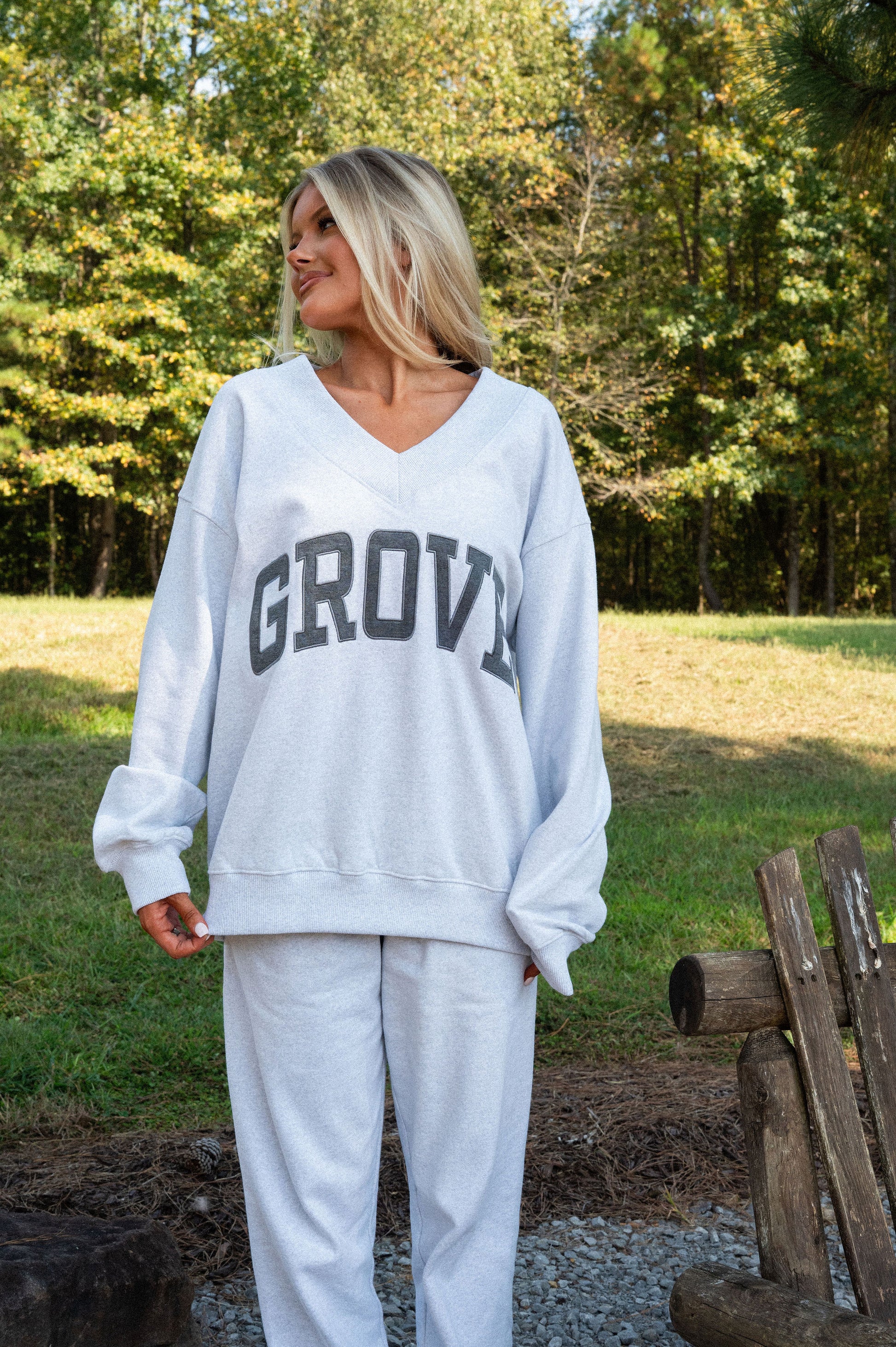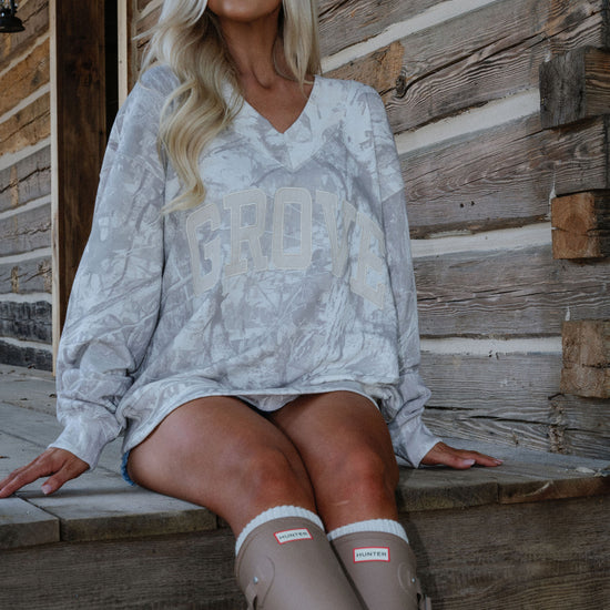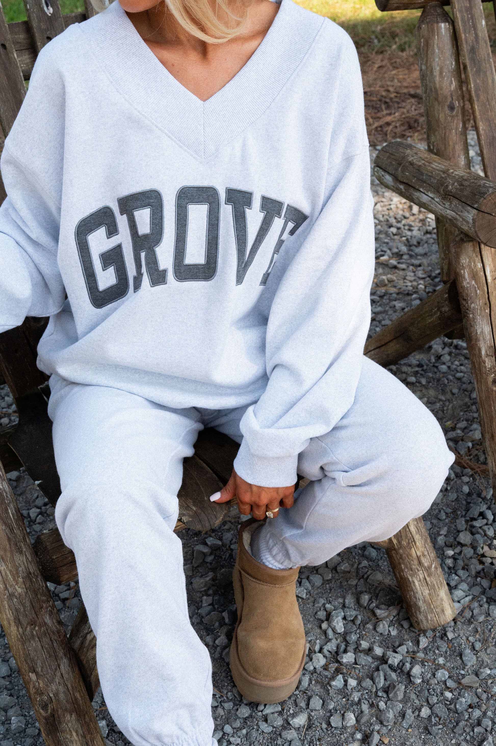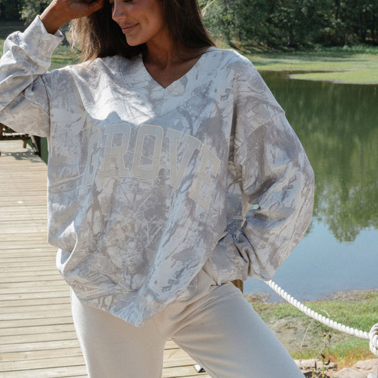 our signature V neck features ribbed trim and varsity patch Grove across the front
