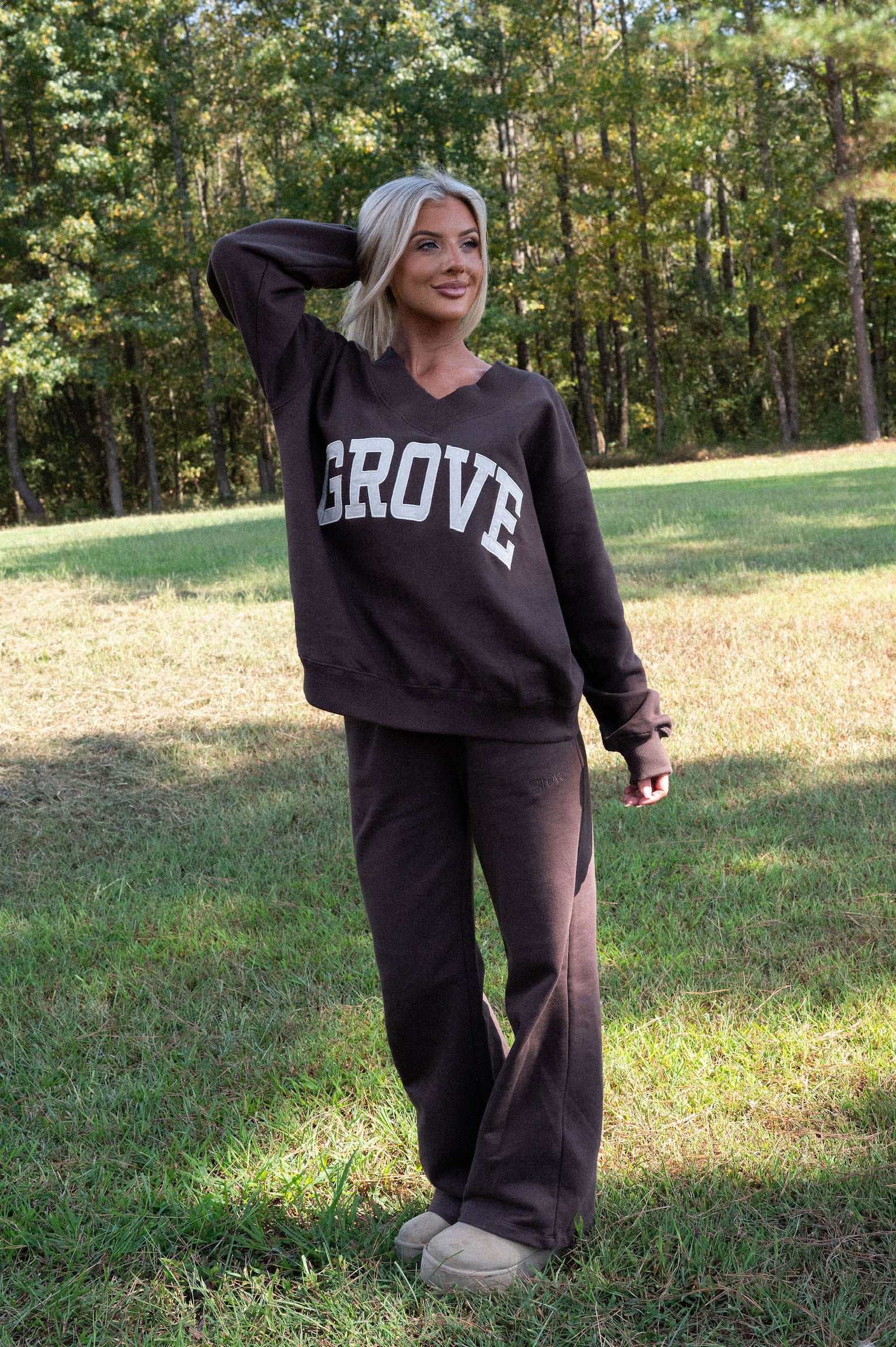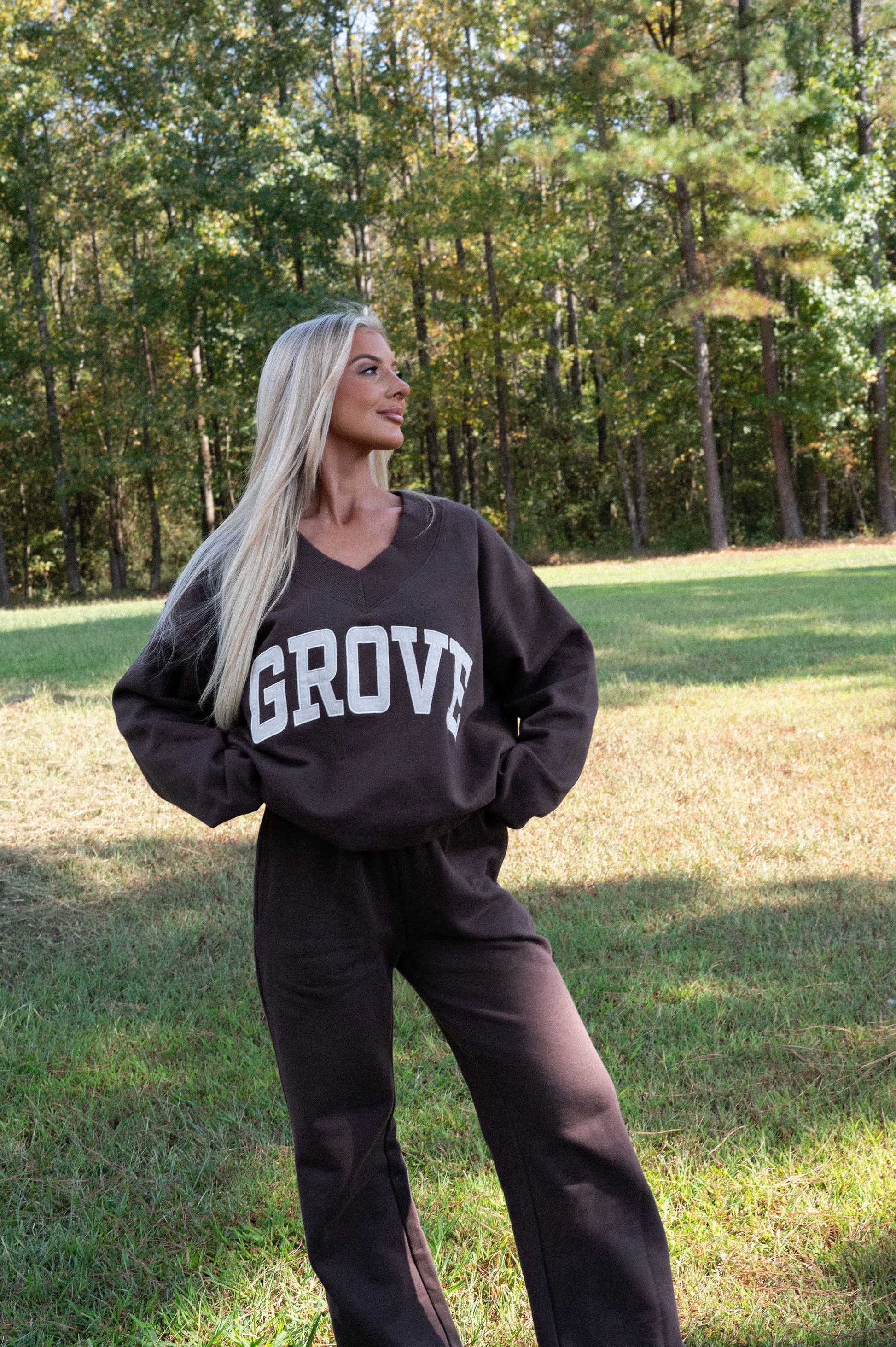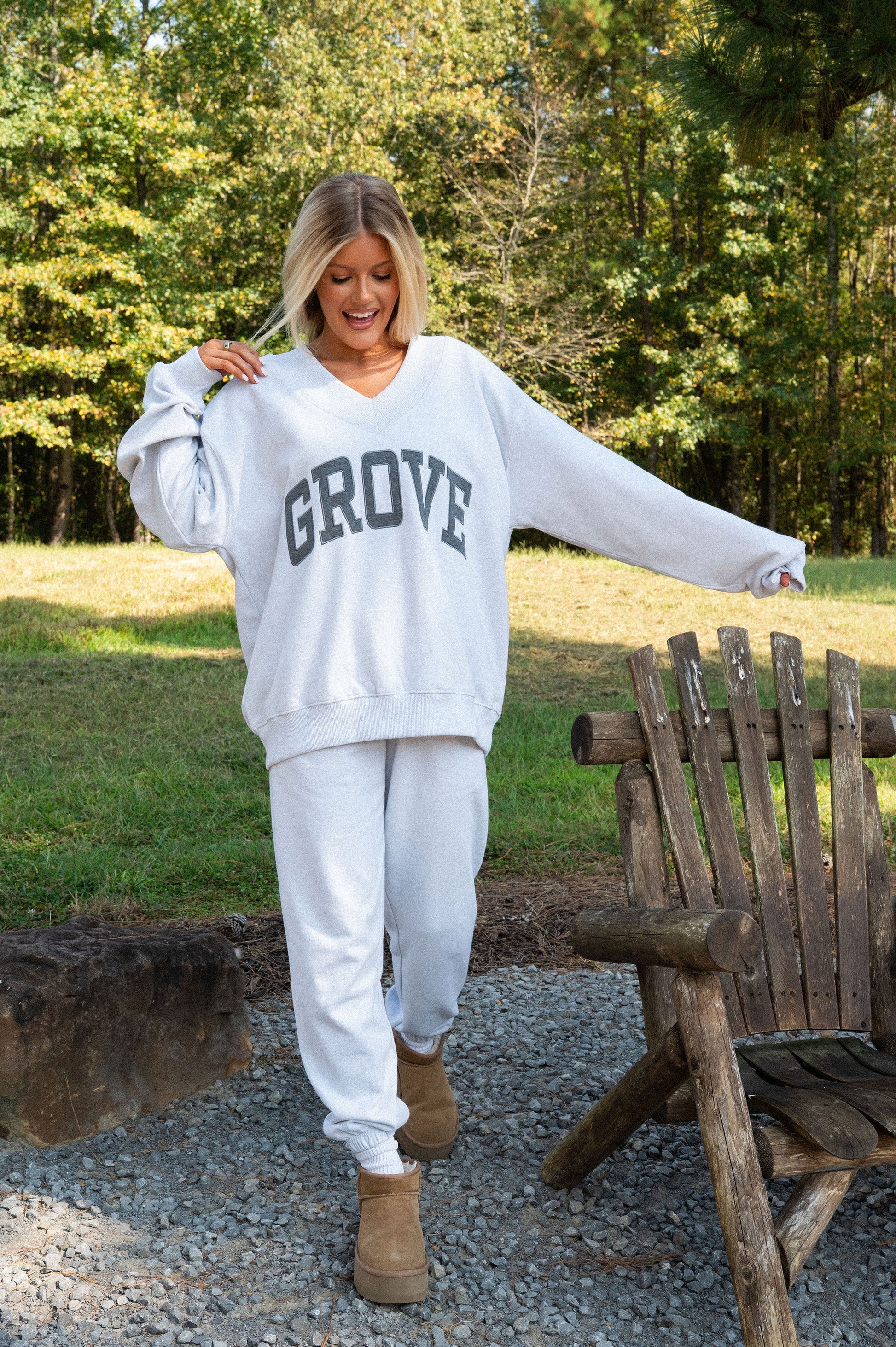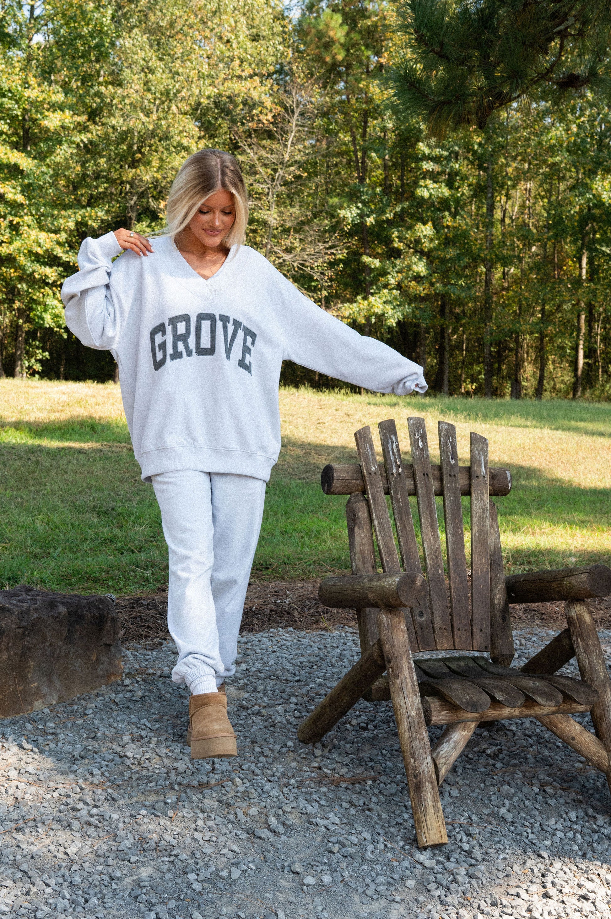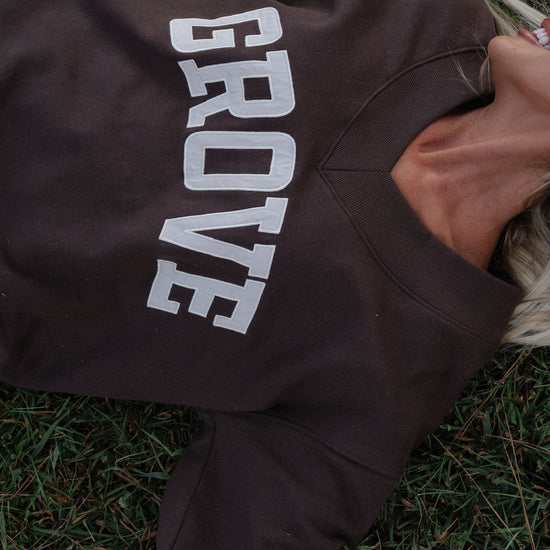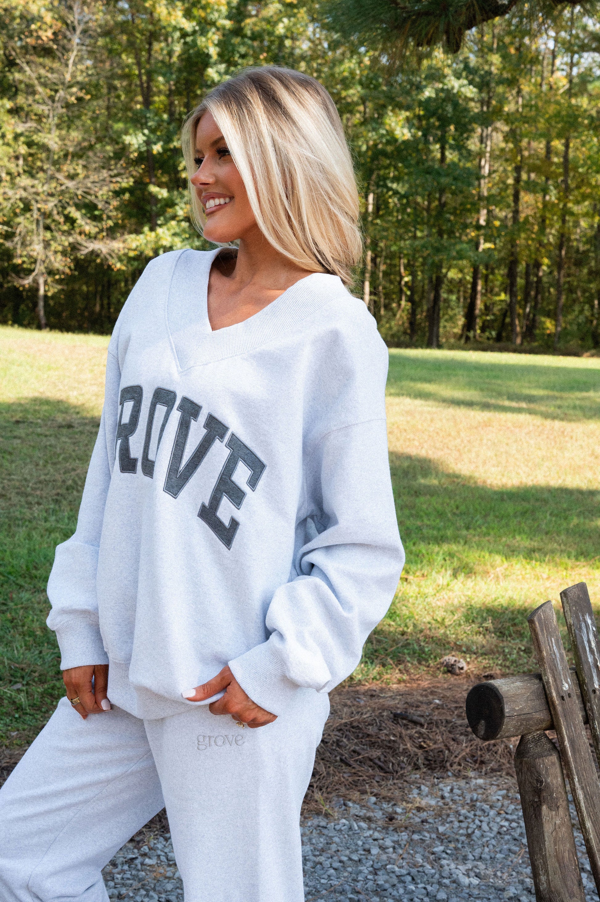 our signature V neck features ribbed trim and varsity patch Grove across the front