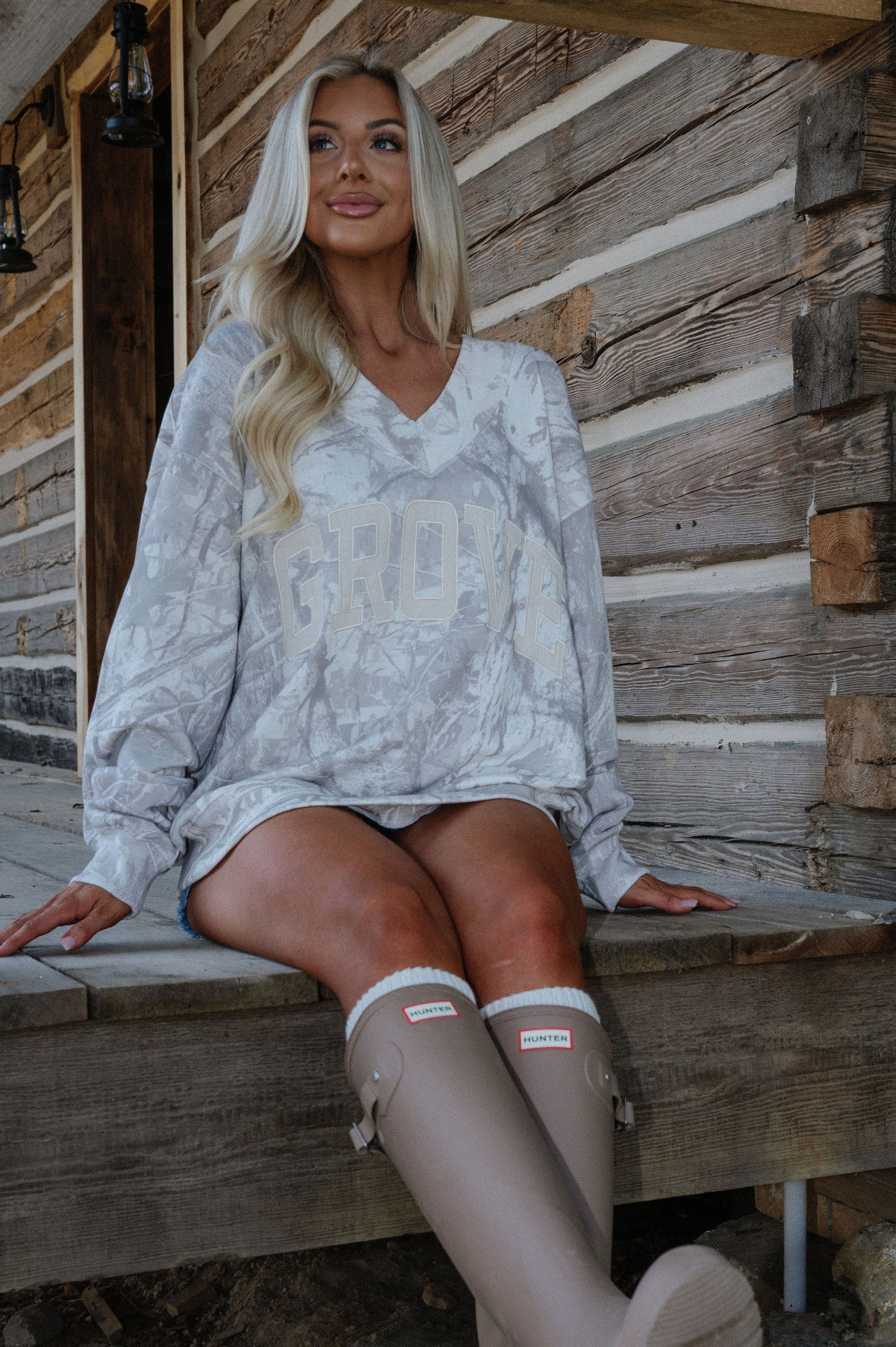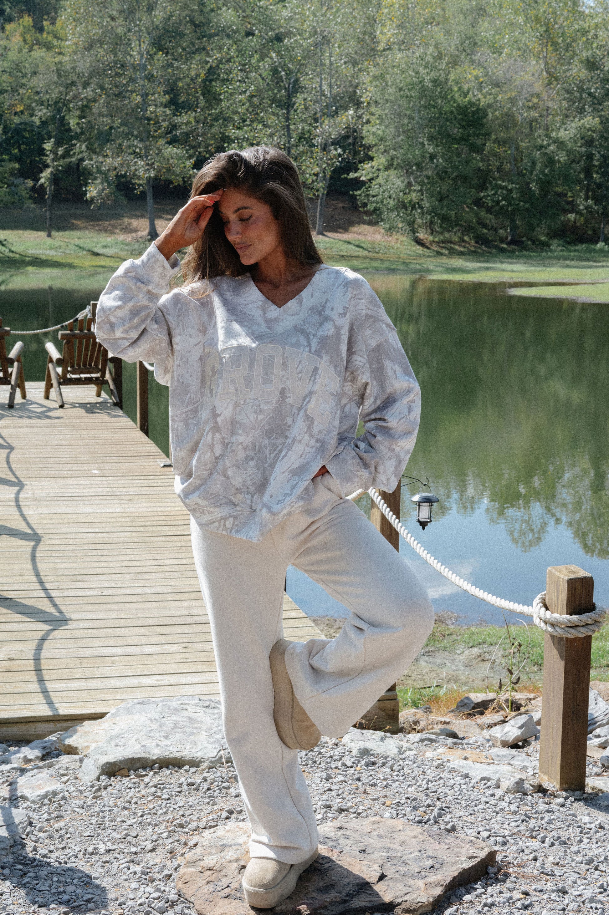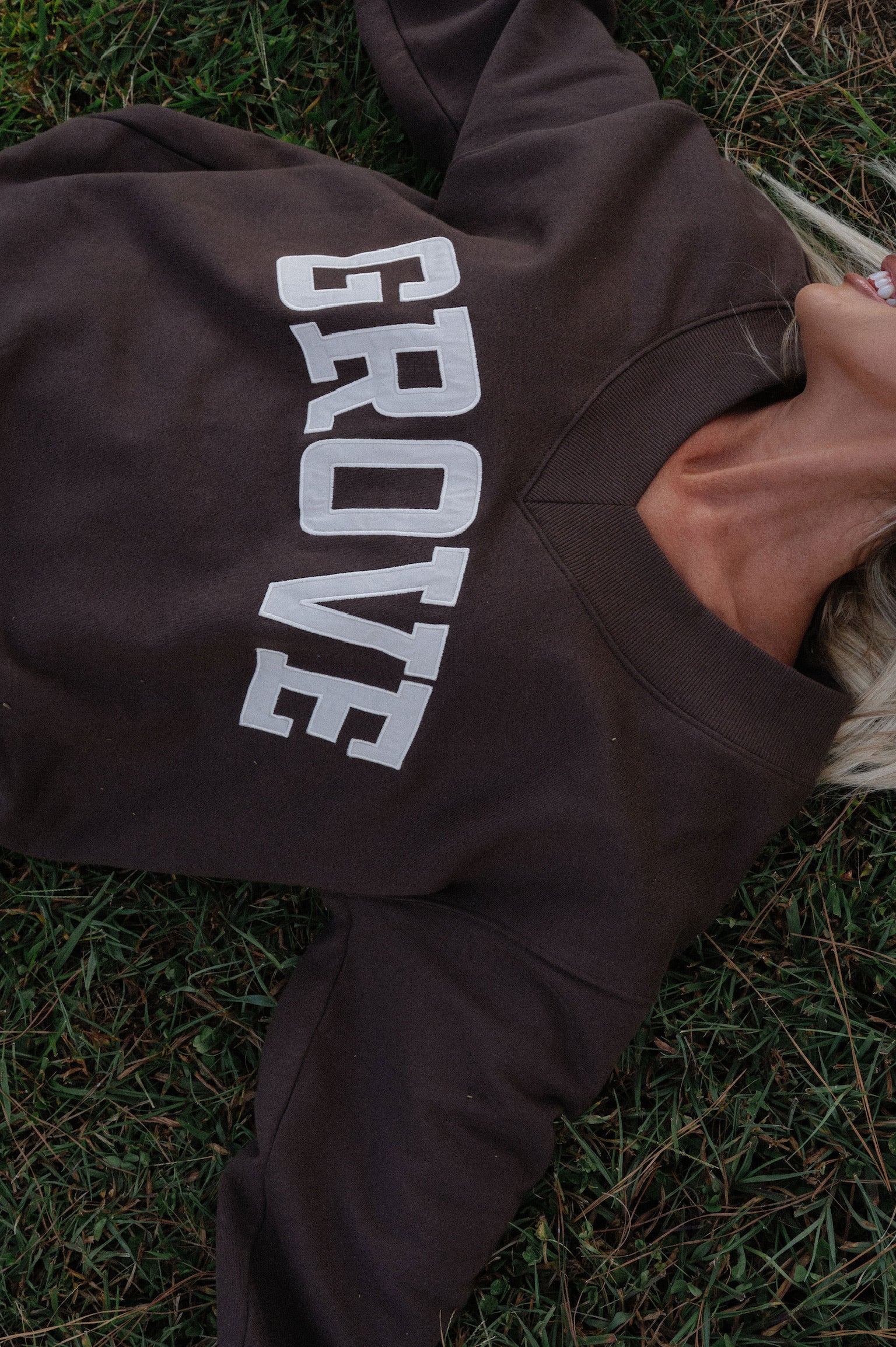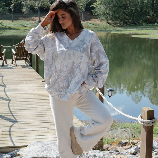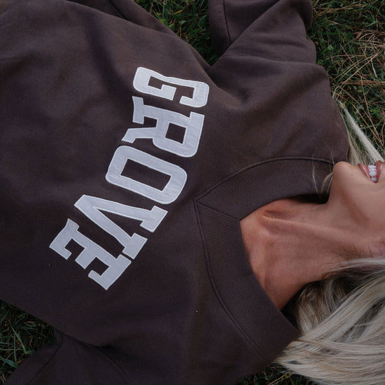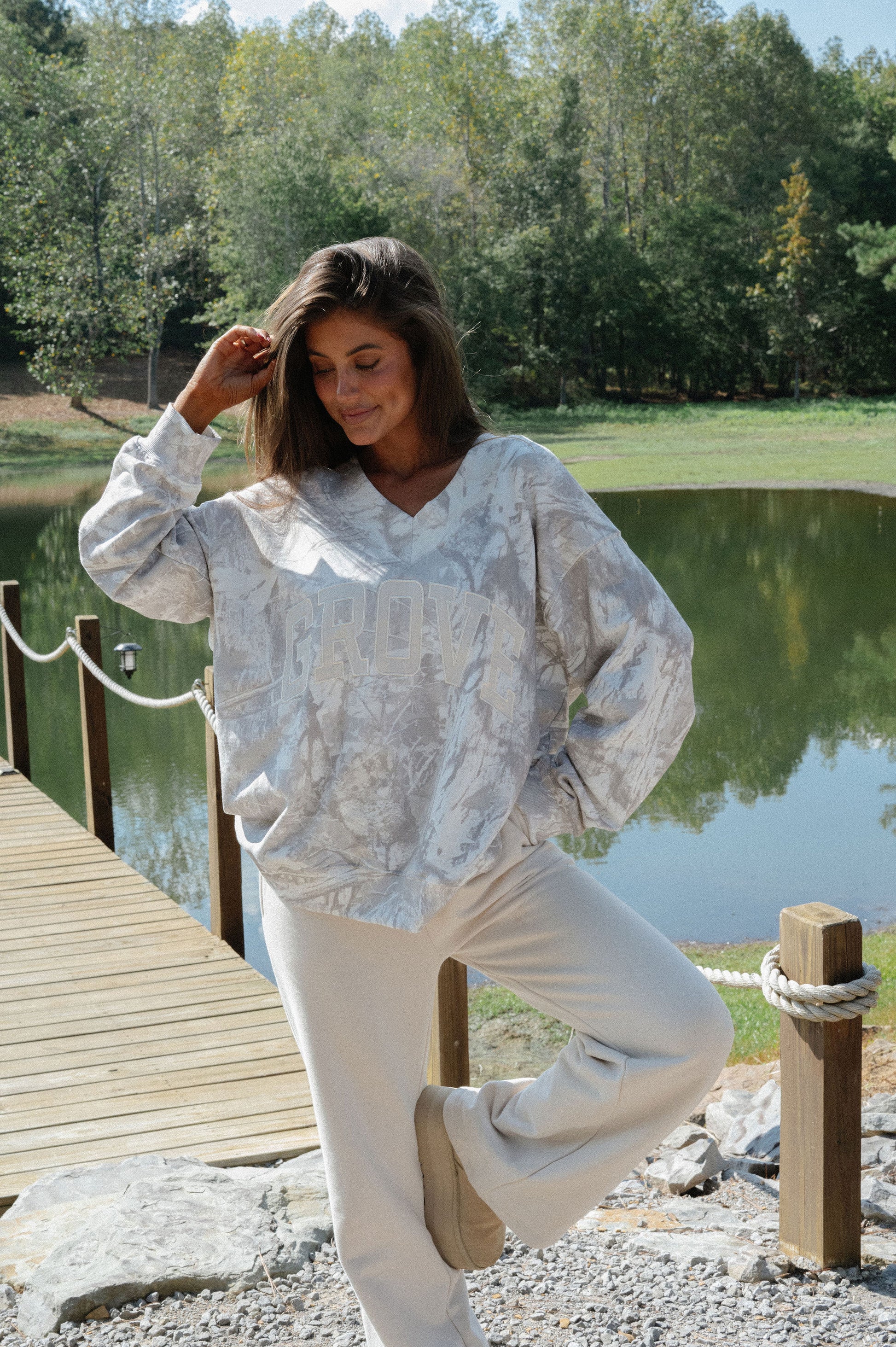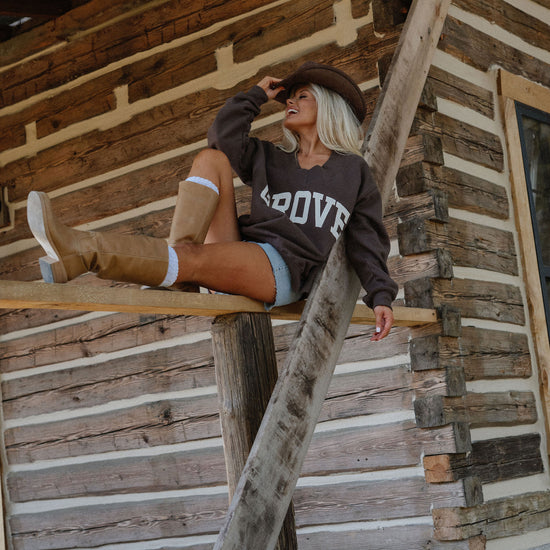 our signature V neck features ribbed trim and varsity patch Grove across the front