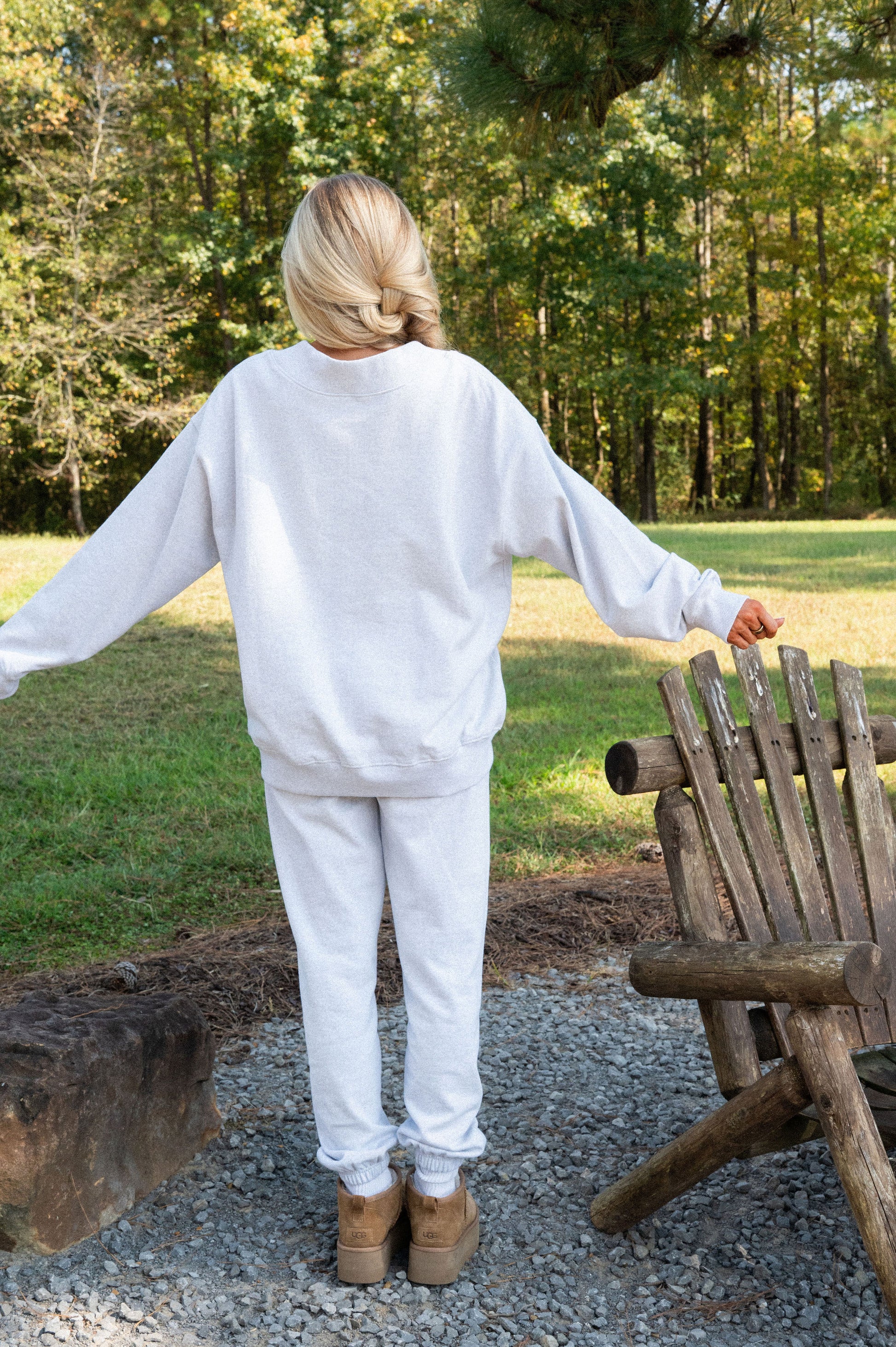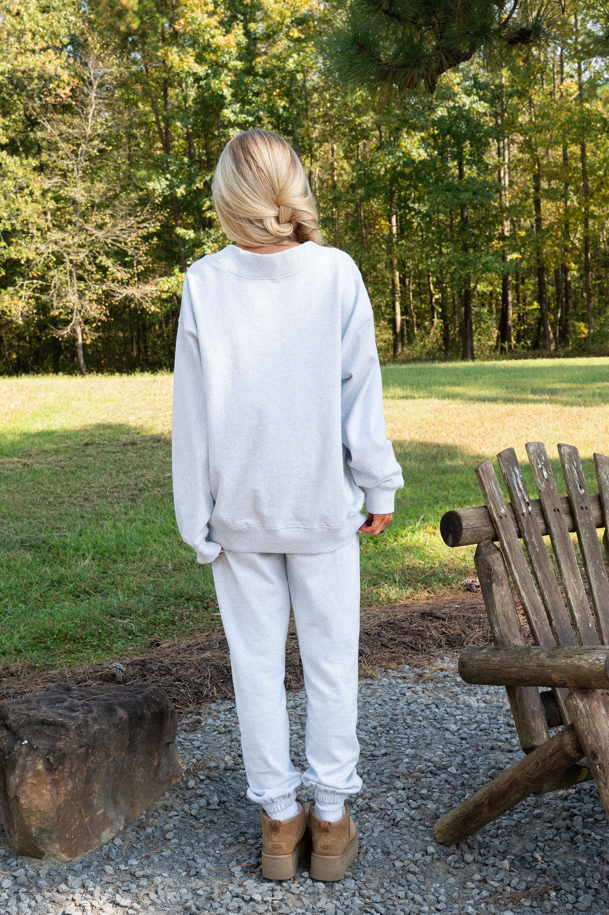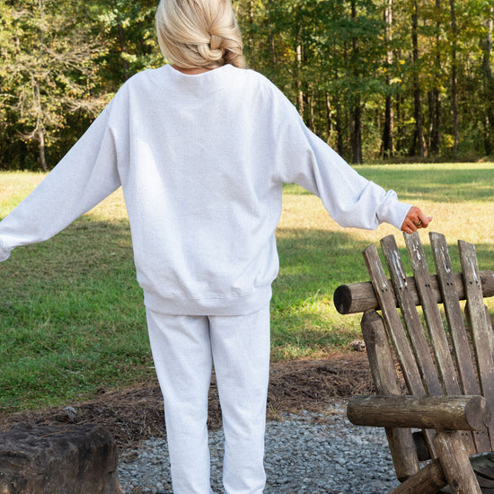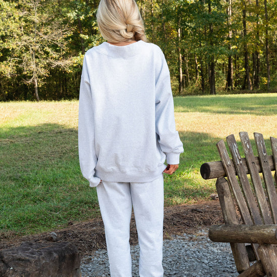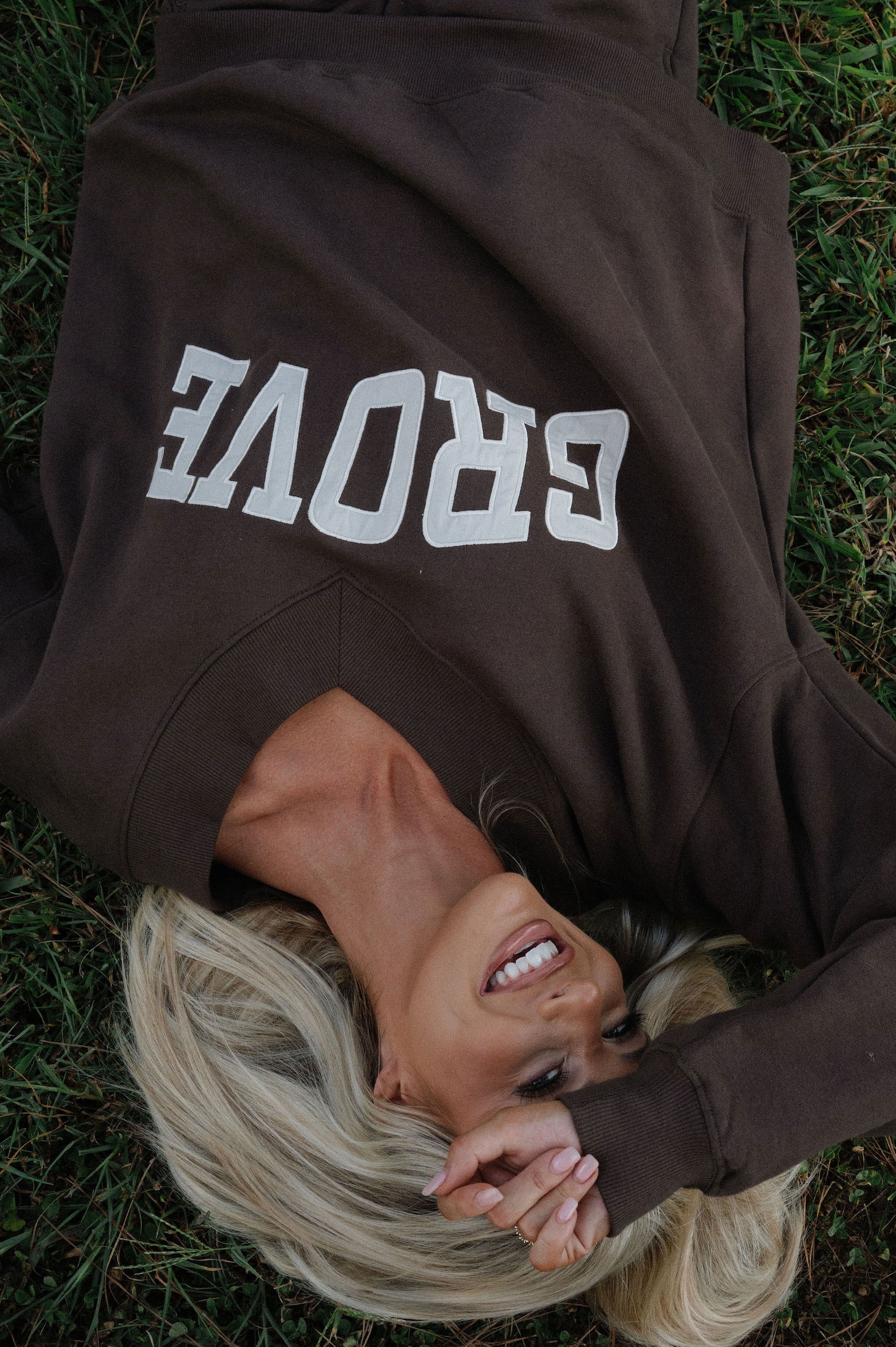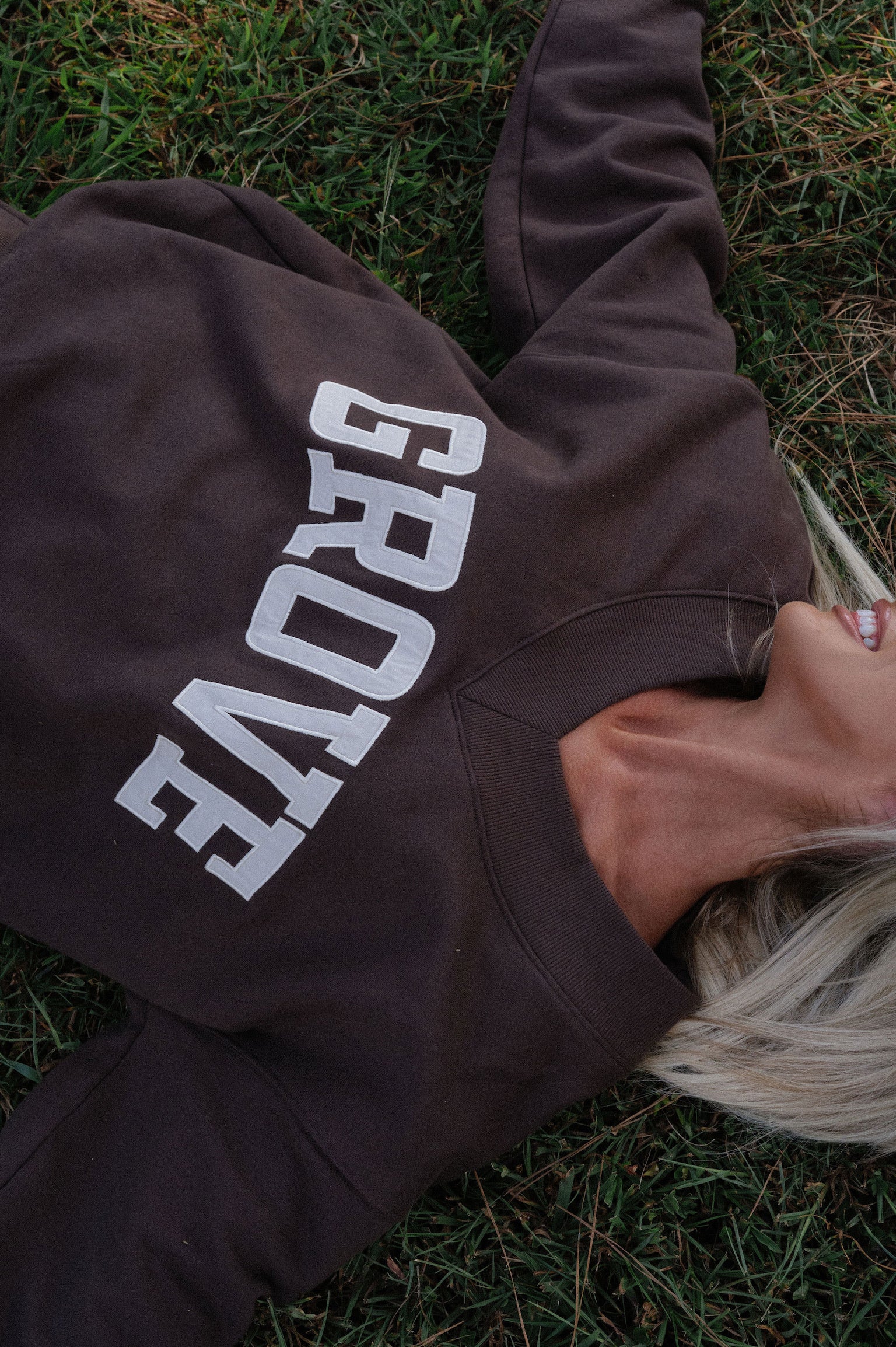 our signature V neck features ribbed trim and varsity patch Grove across the front