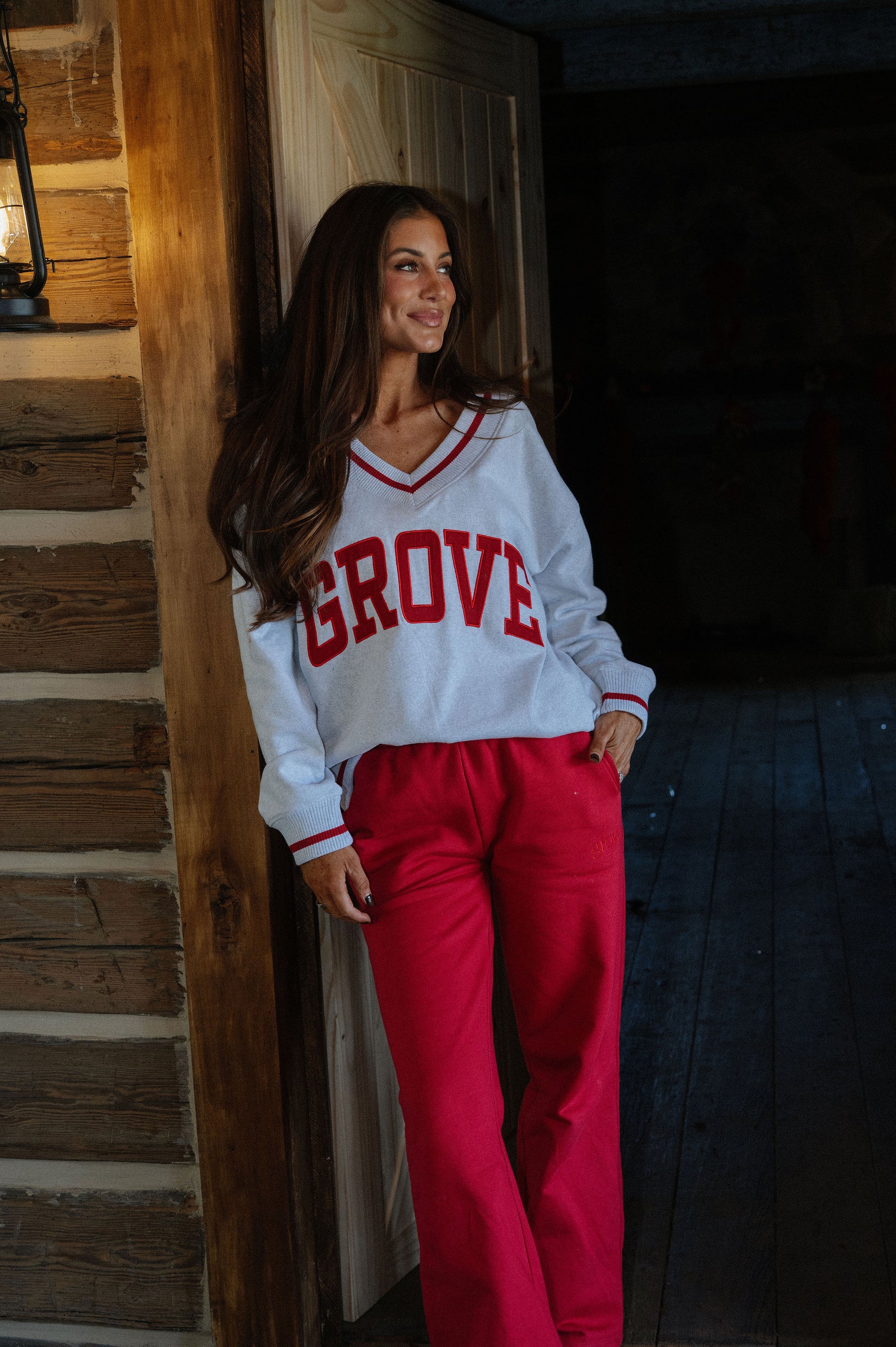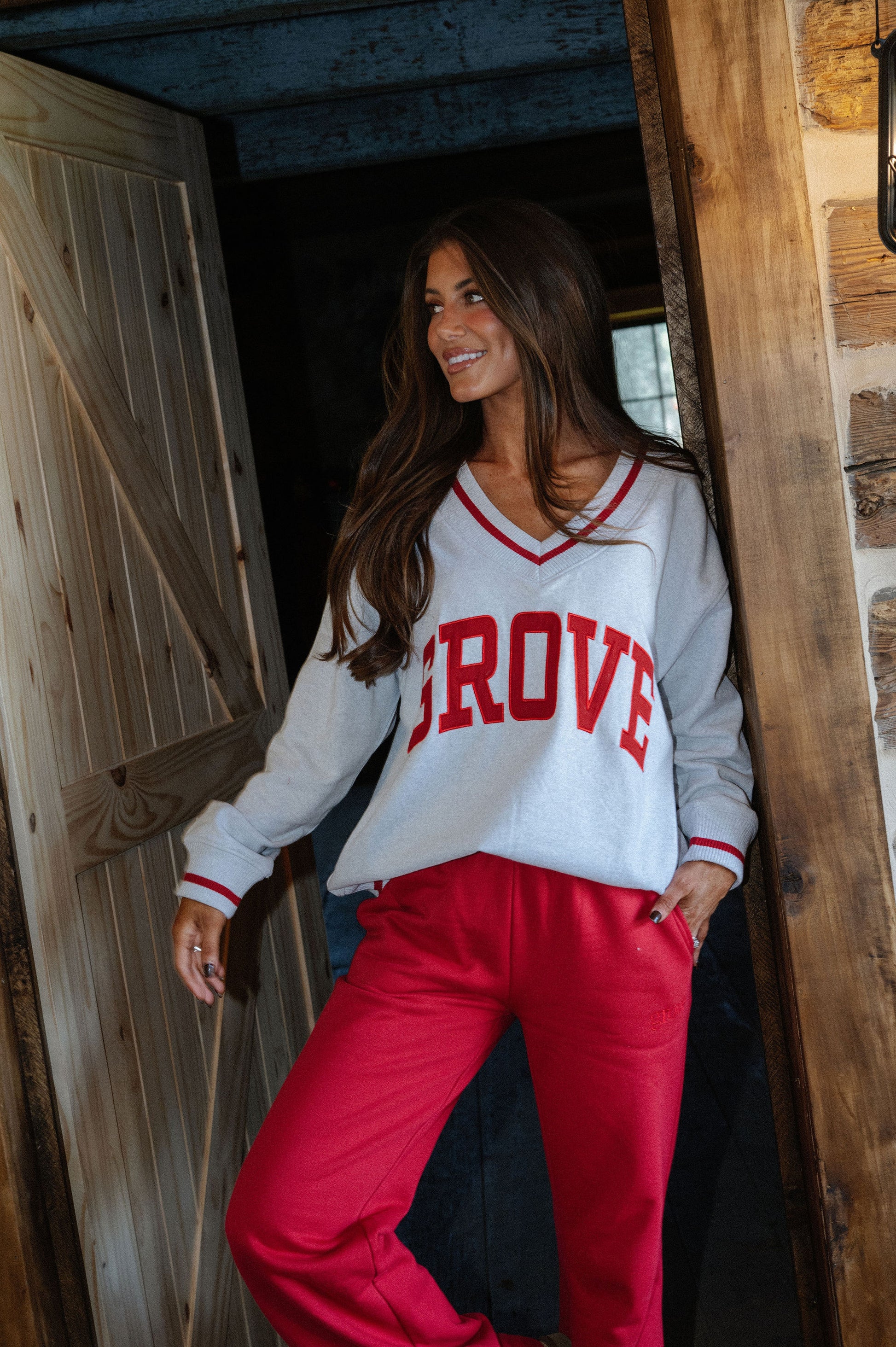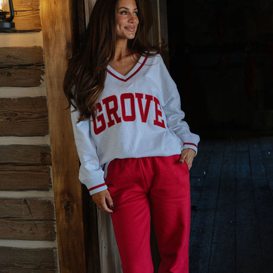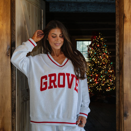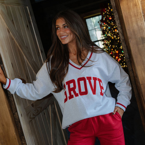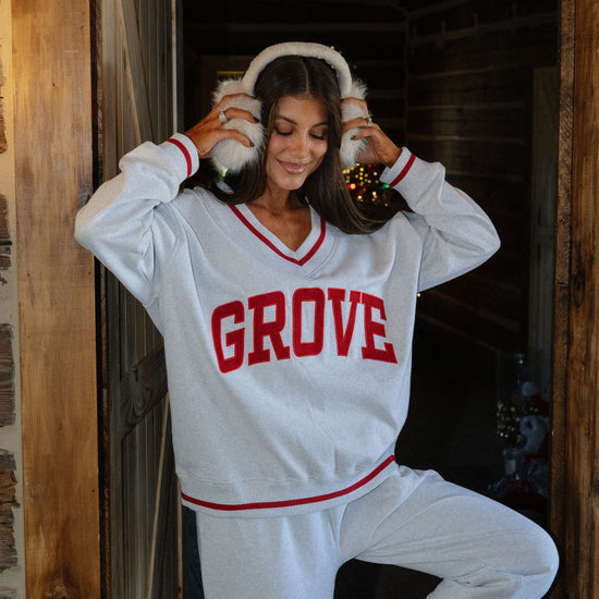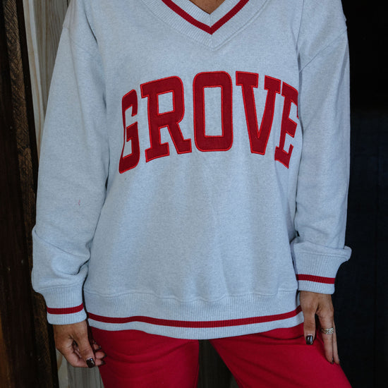 our signature V neck features ribbed trim and varsity patch Grove across the front