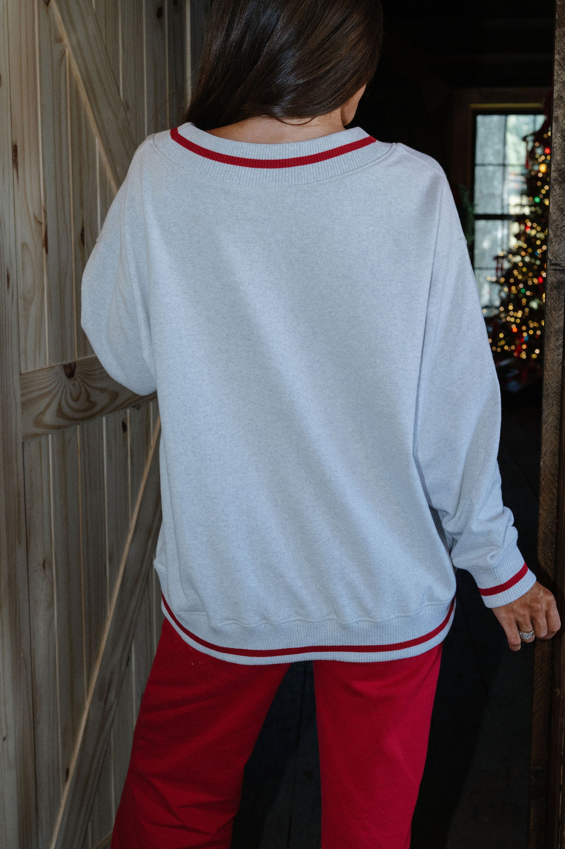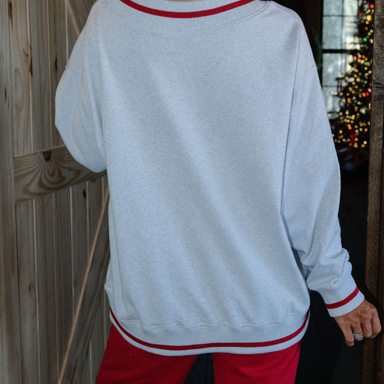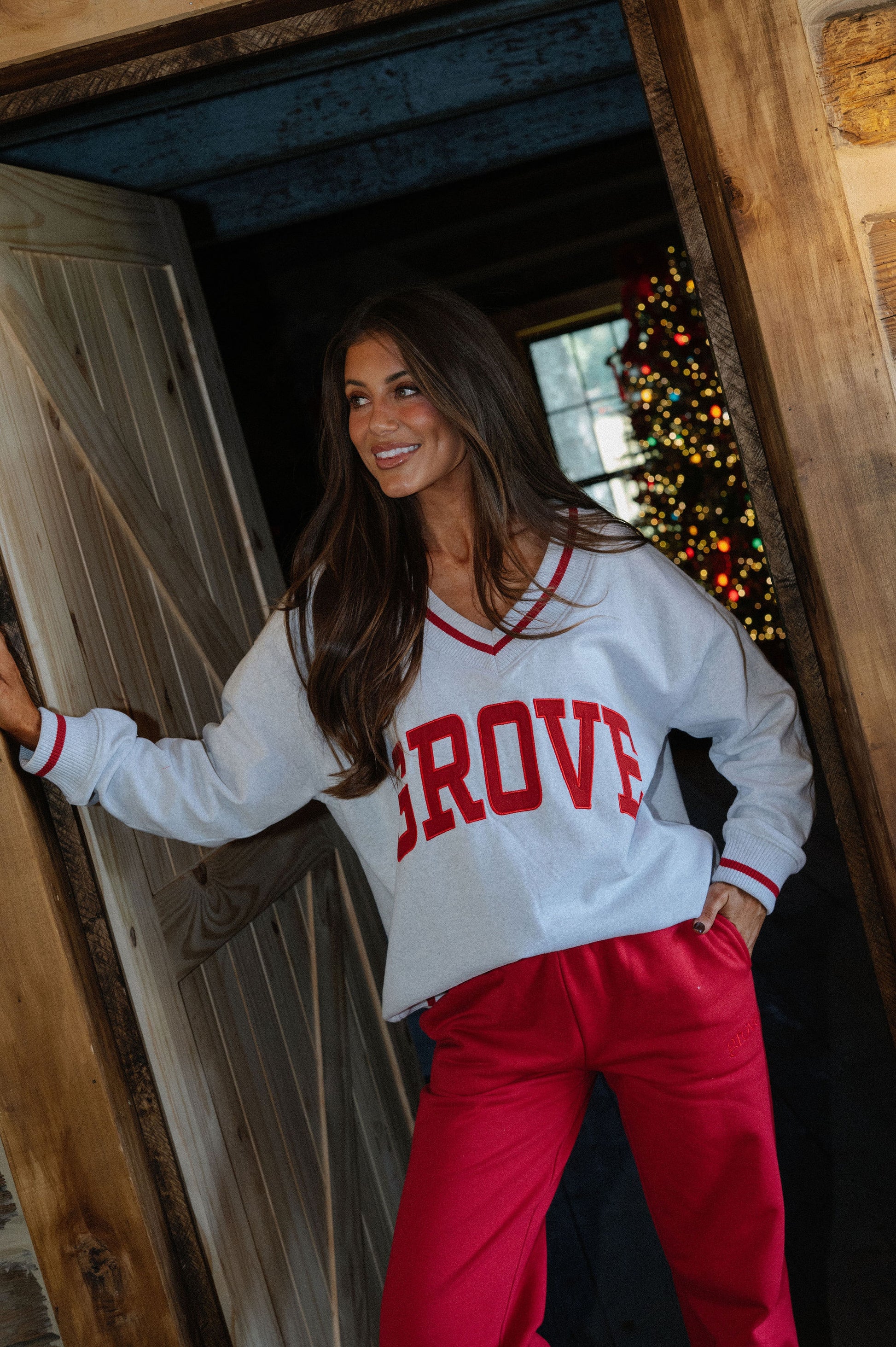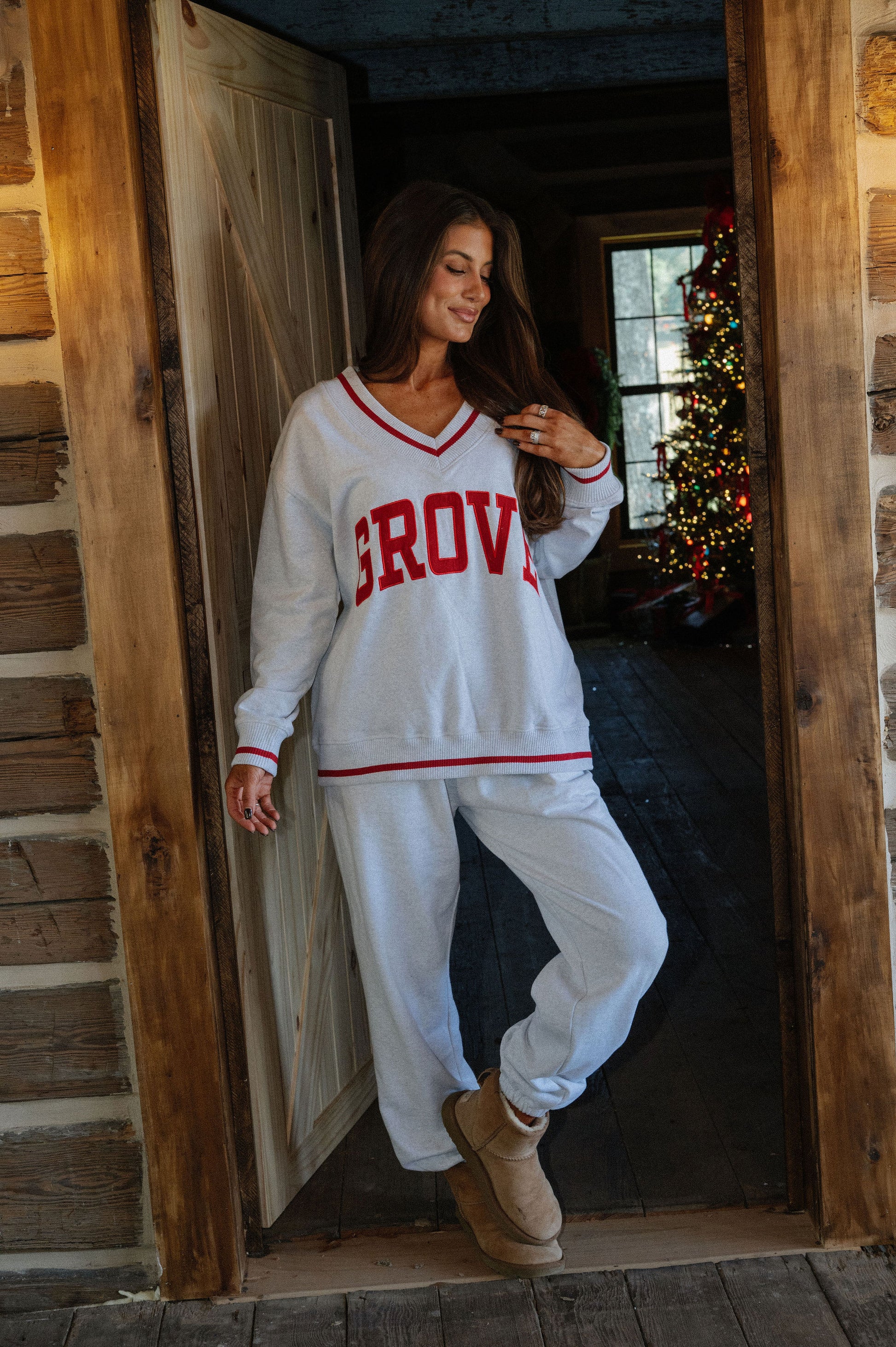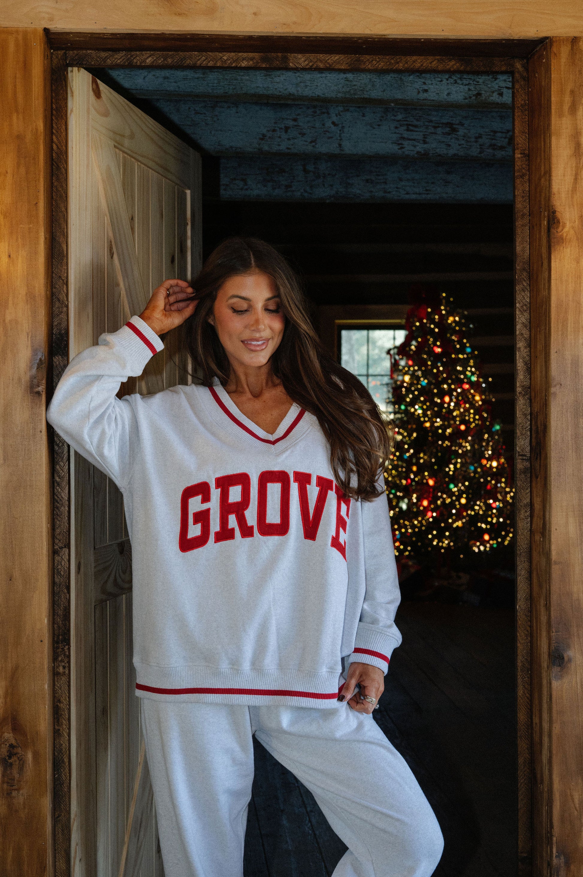 our signature V neck features ribbed trim and varsity patch Grove across the front
