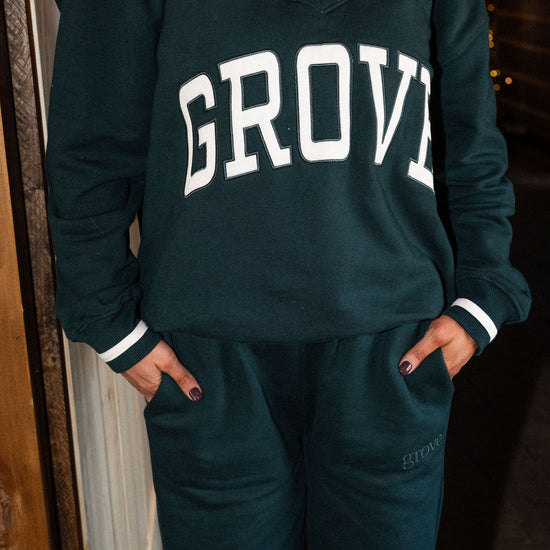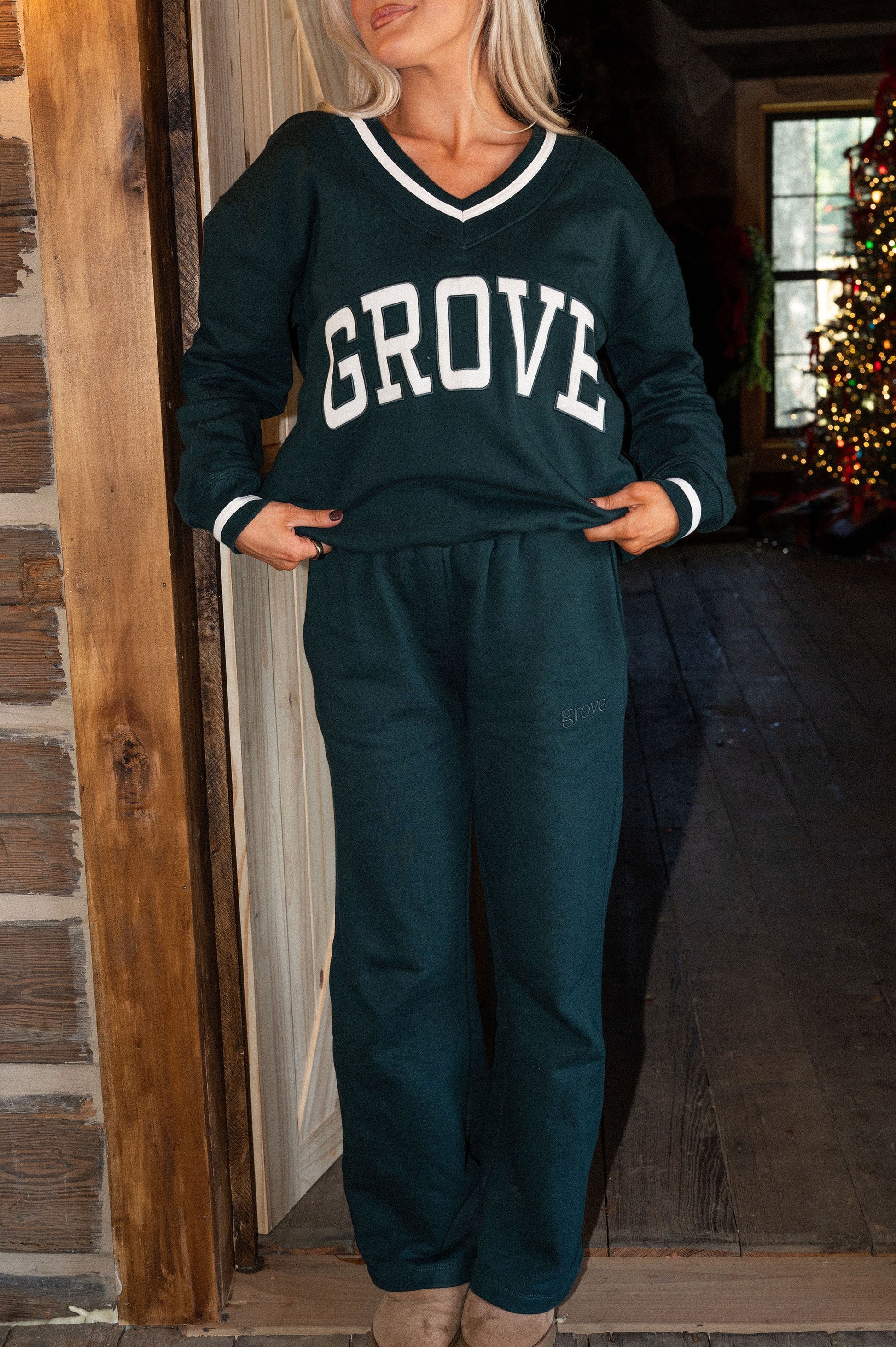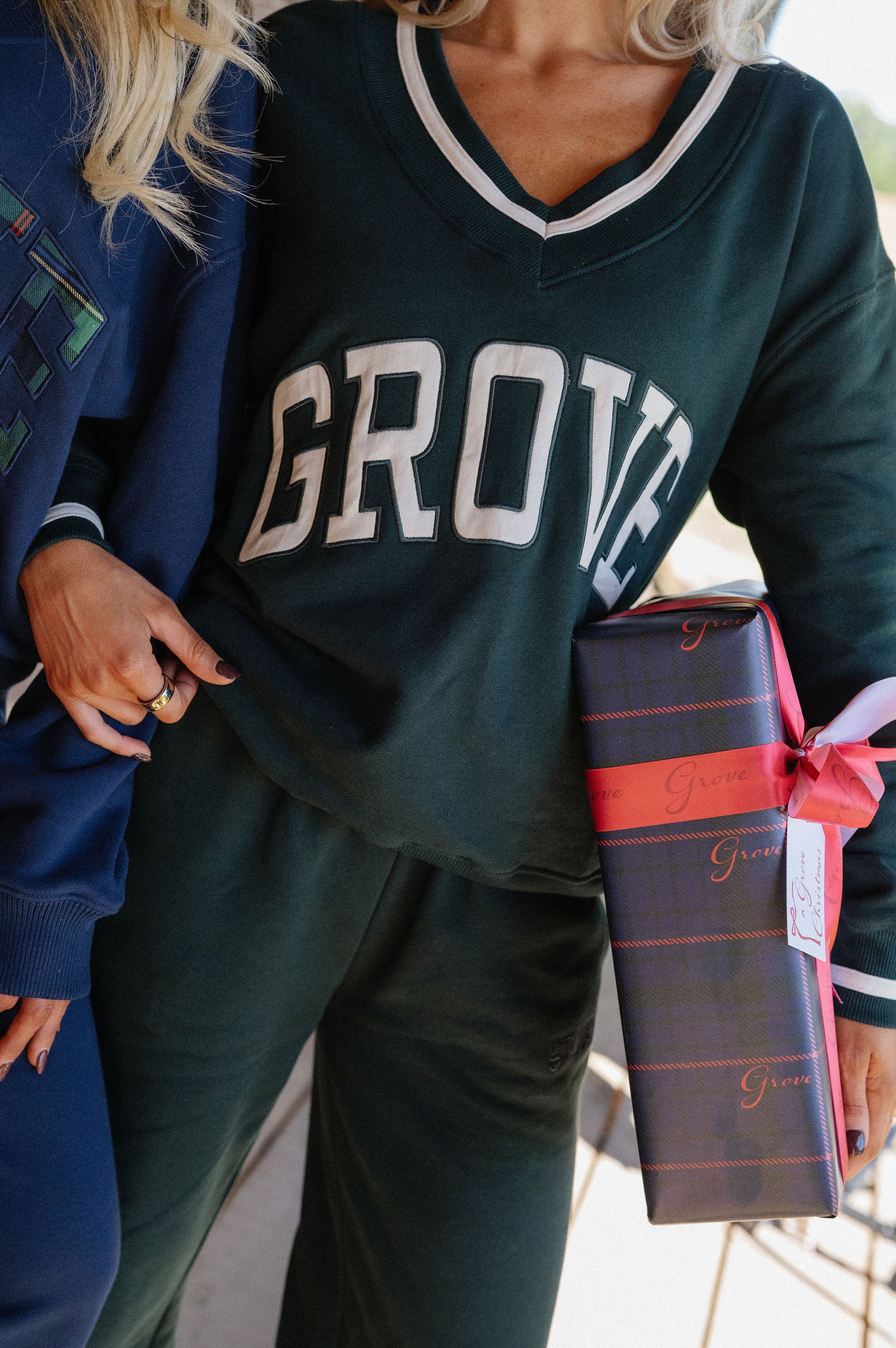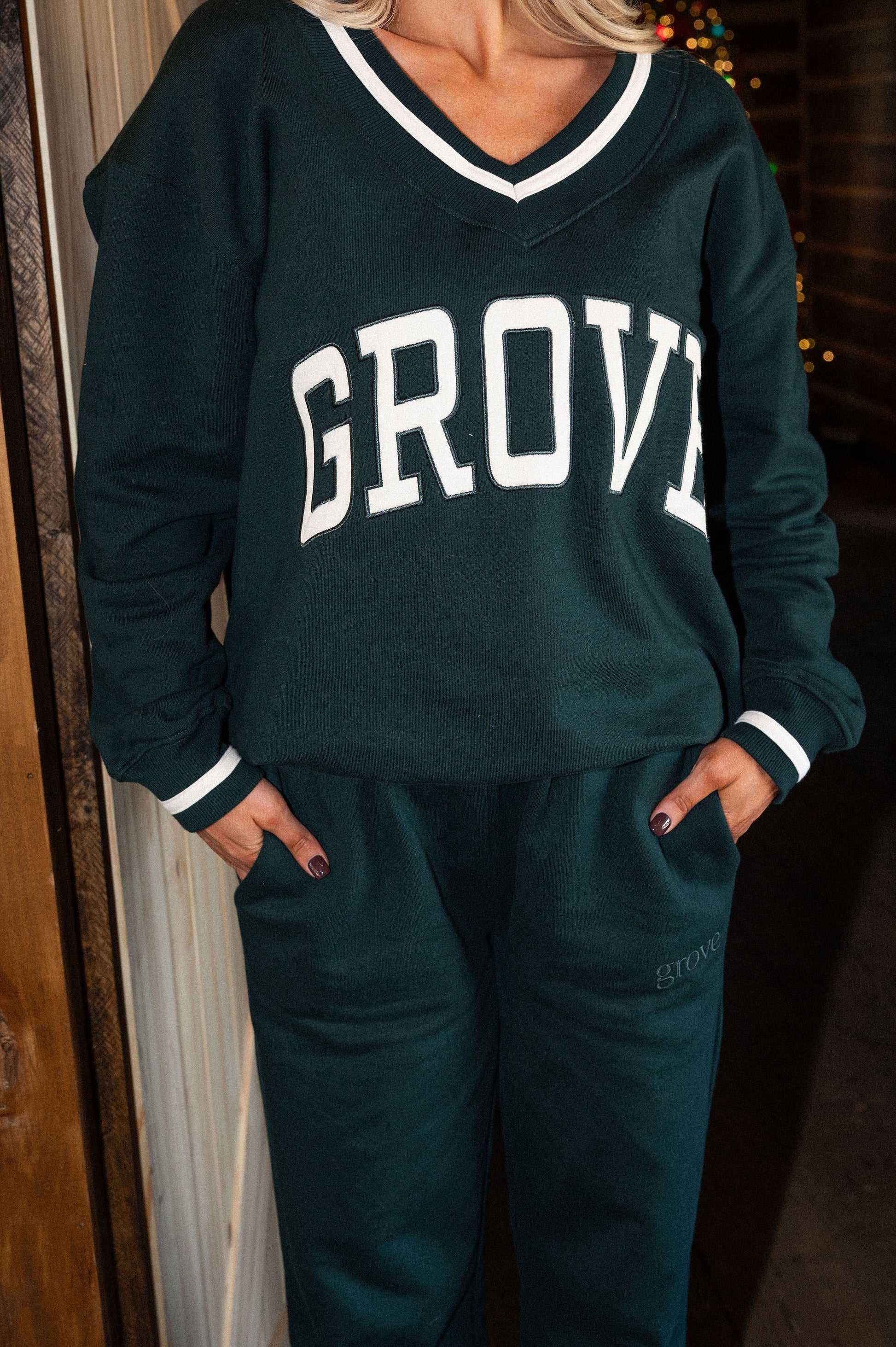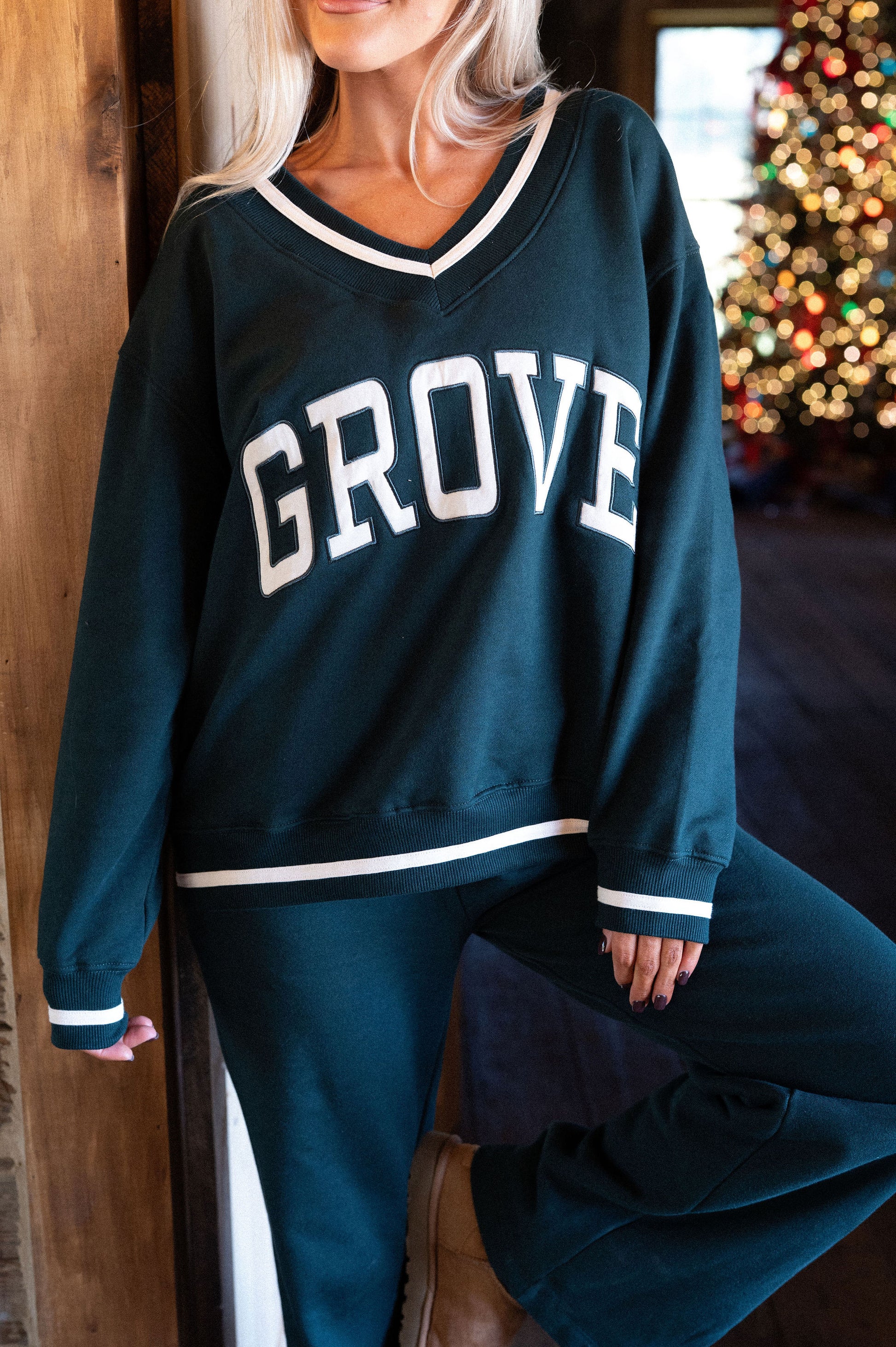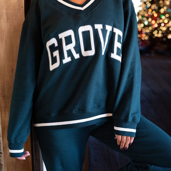 our signature V neck features ribbed trim and varsity patch Grove across the front