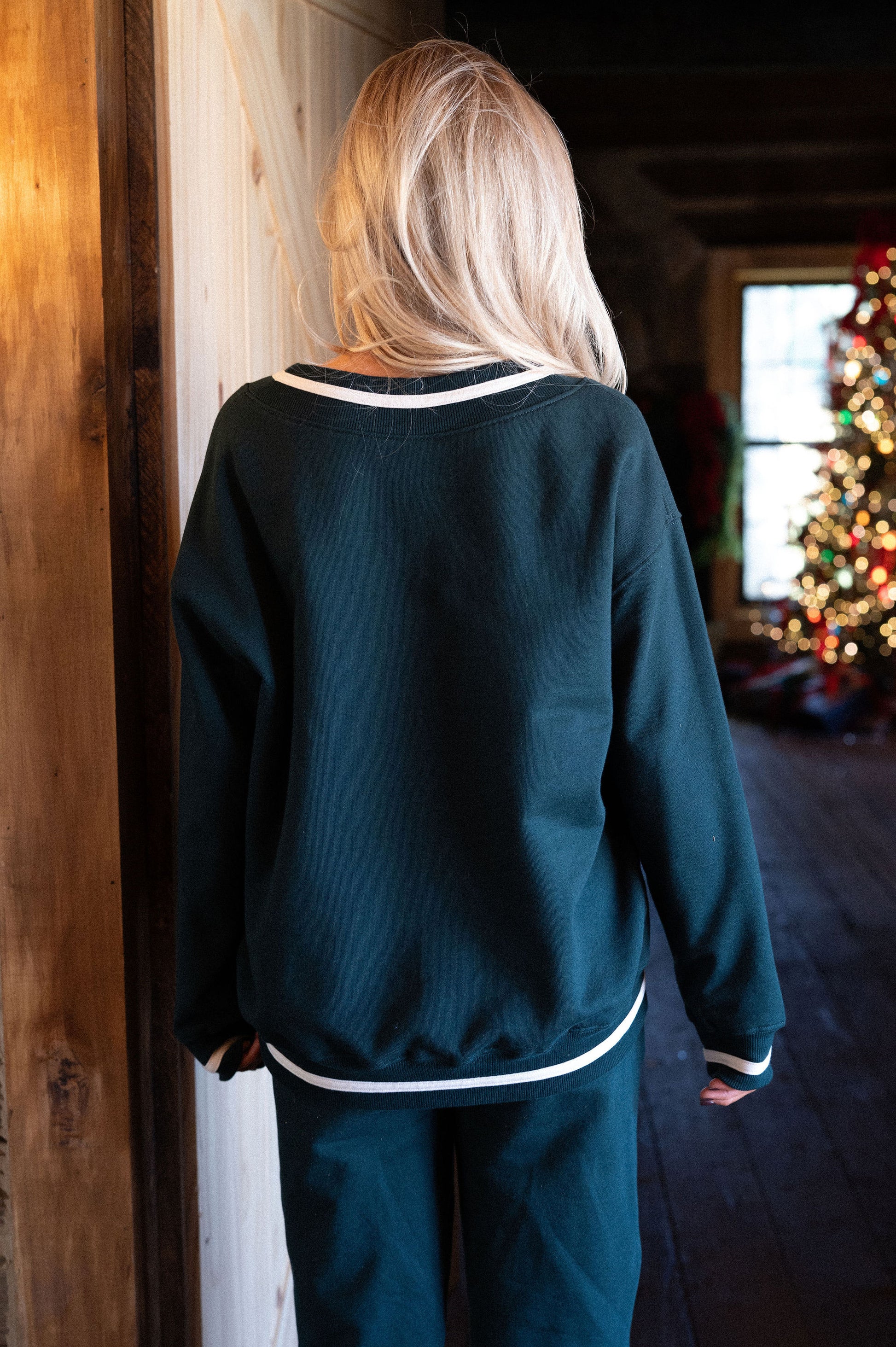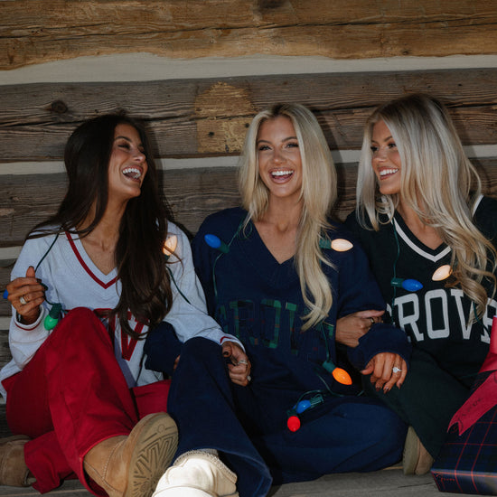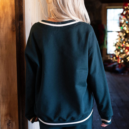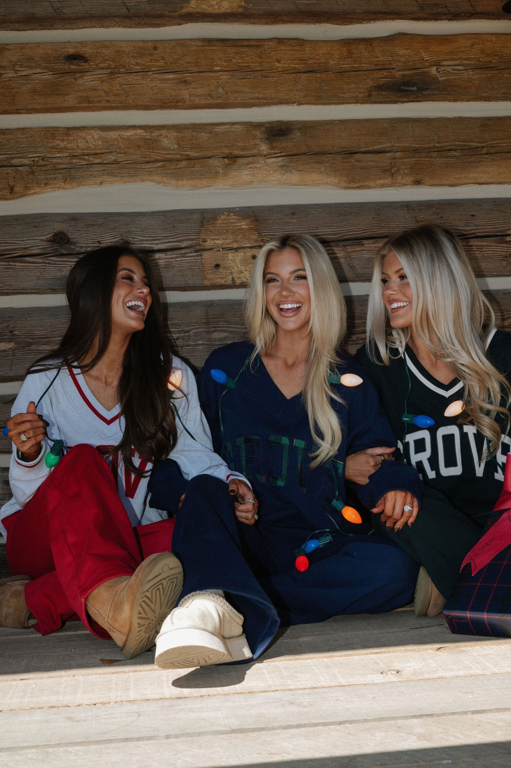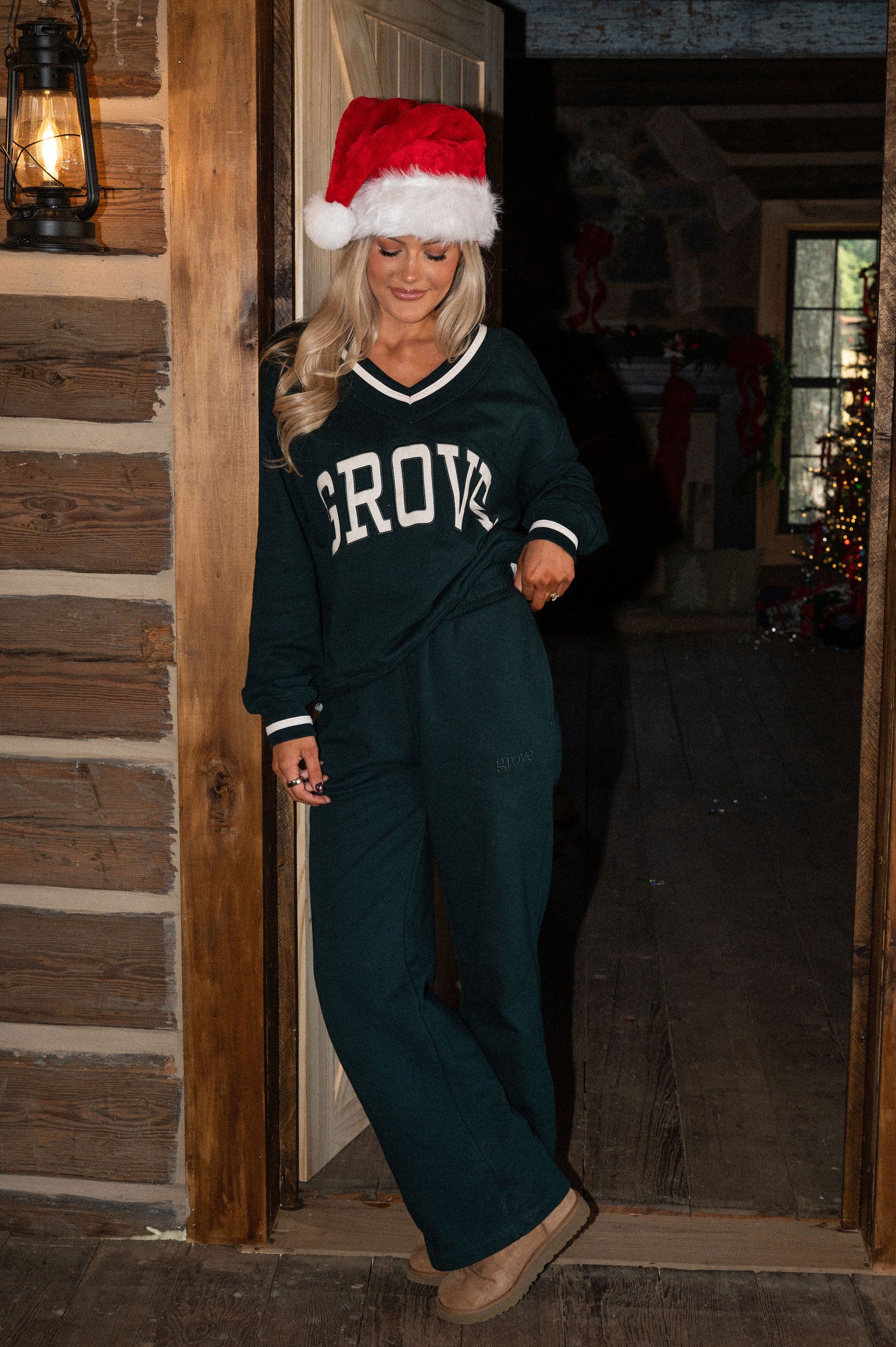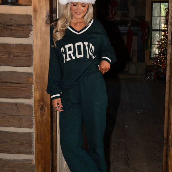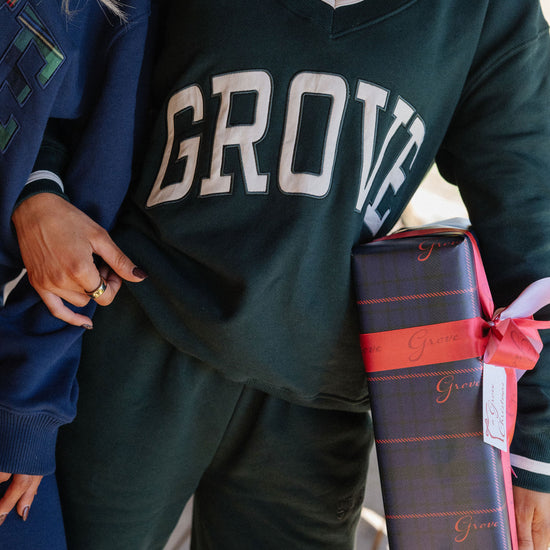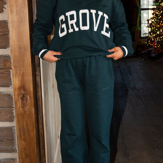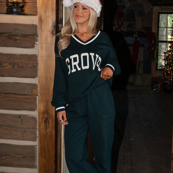 our signature V neck features ribbed trim and varsity patch Grove across the front