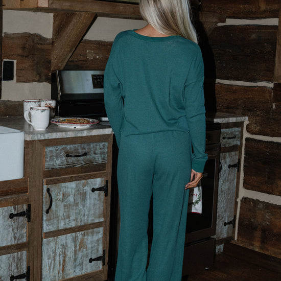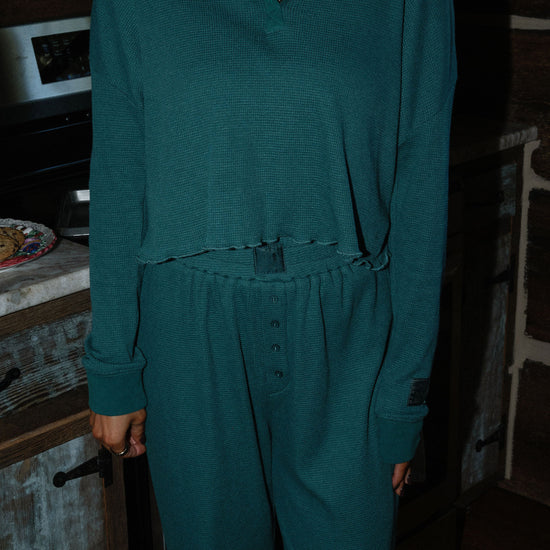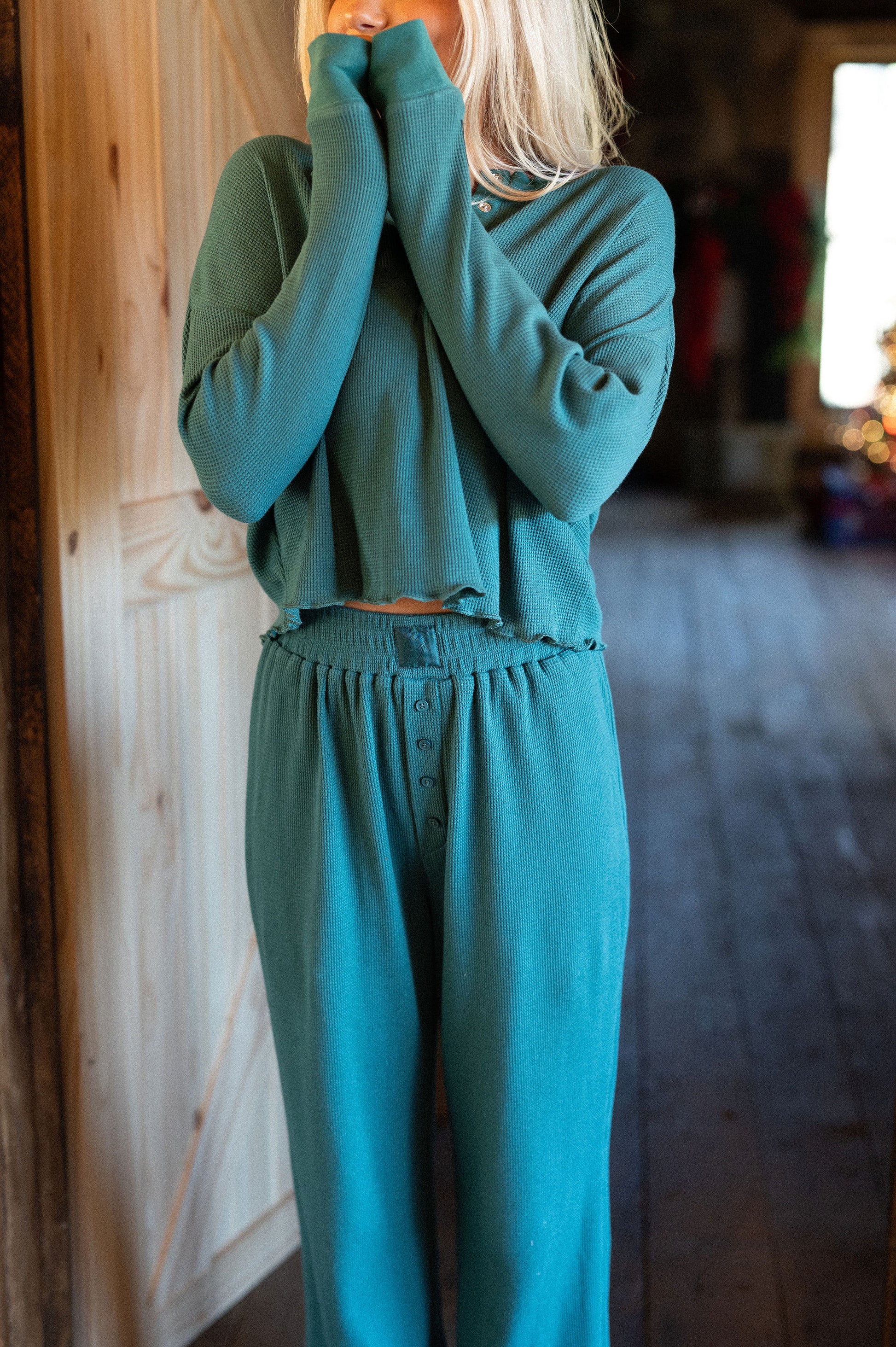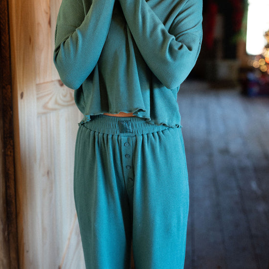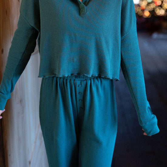 our waffle pajama top comes in colorway mistletoe and has clasp closure on the neckline