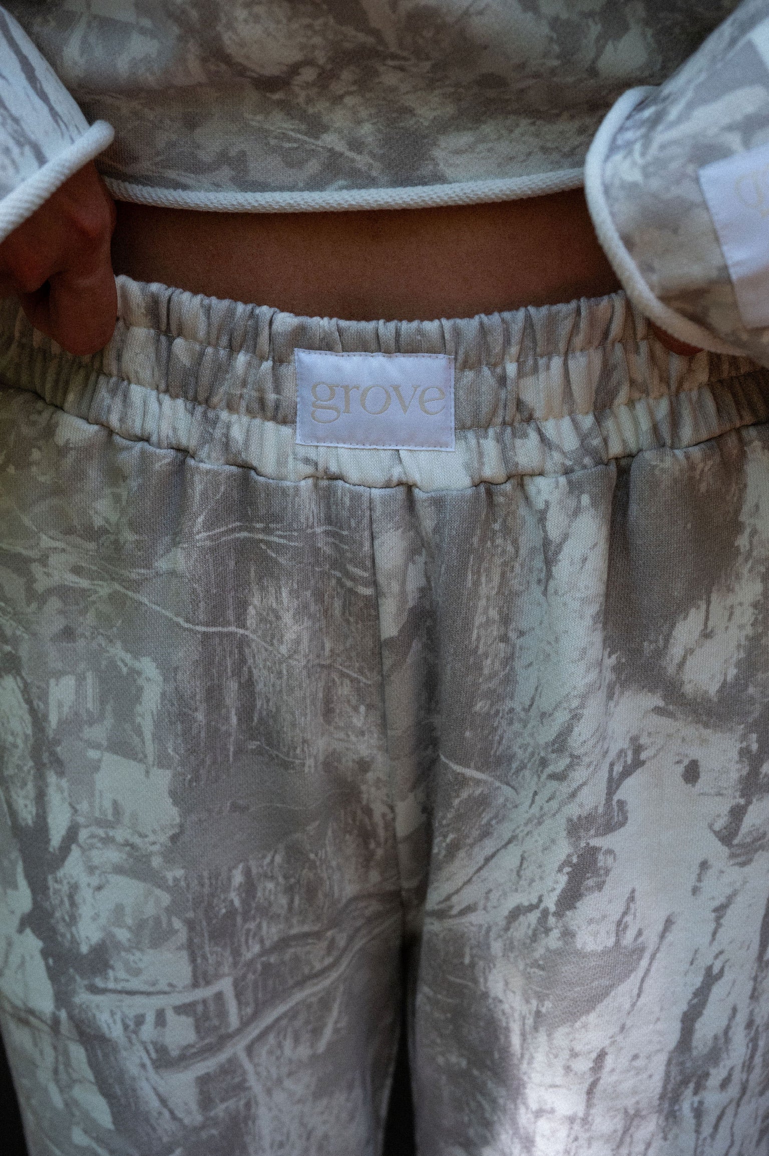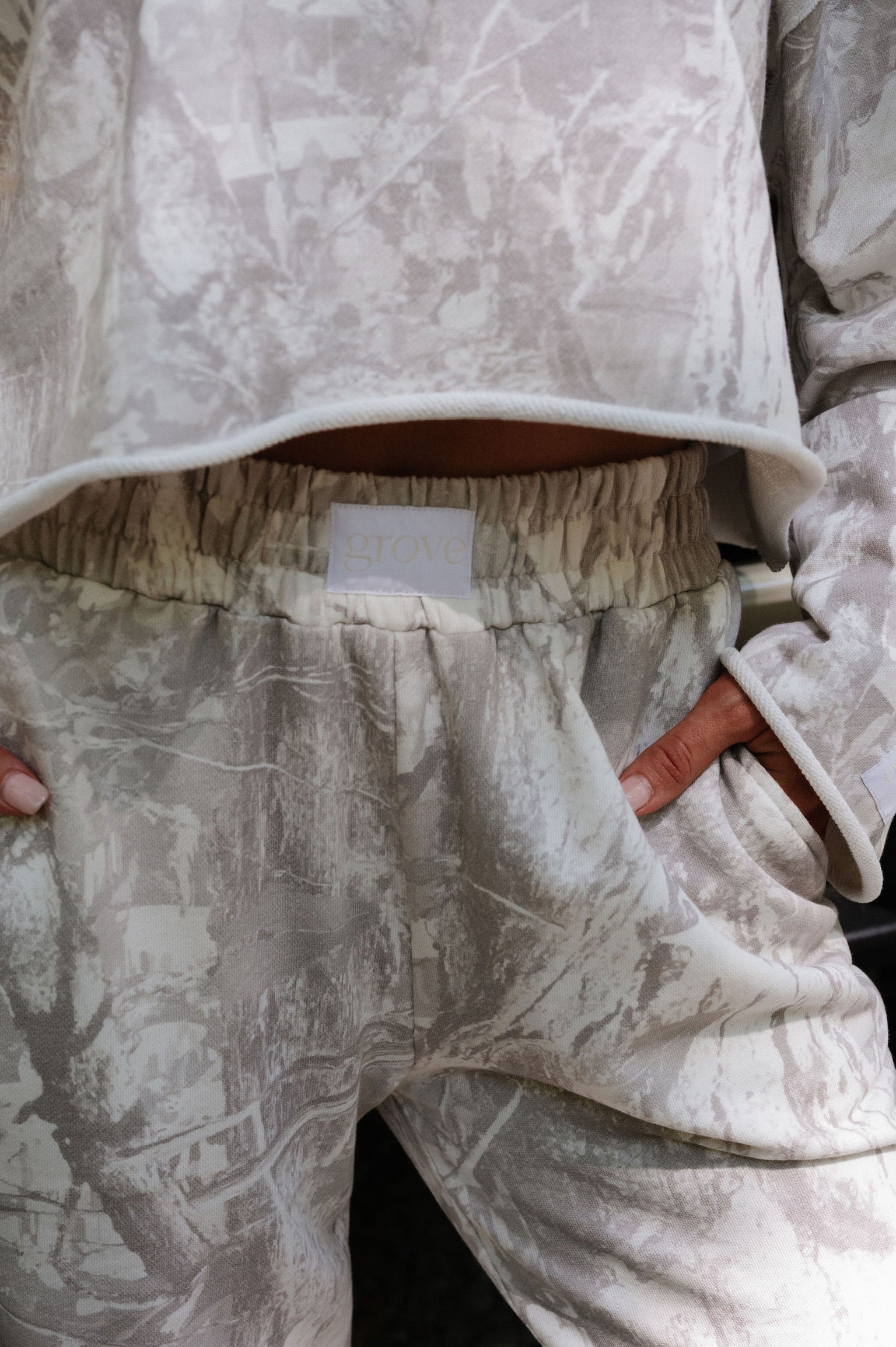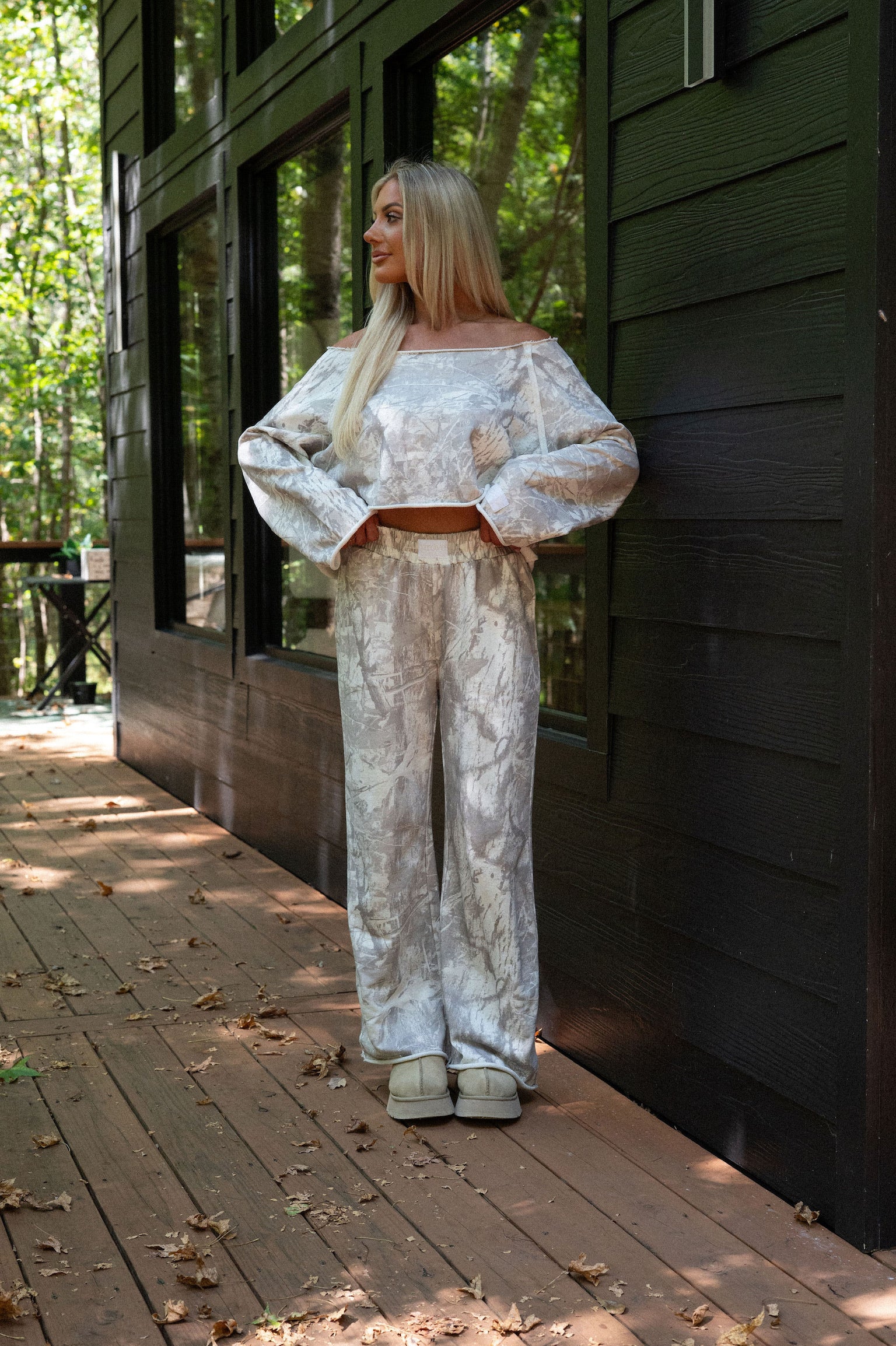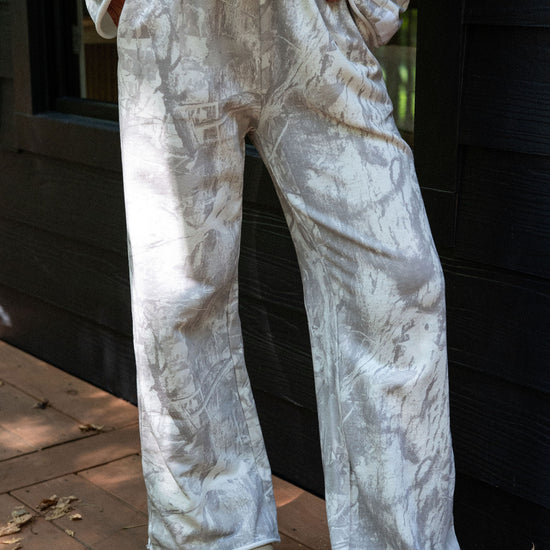 french terry camo wide leg sweatpant with a high waist, raw edge bottom hem, and patch on the waistband