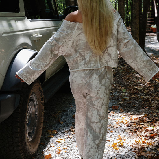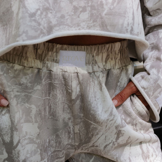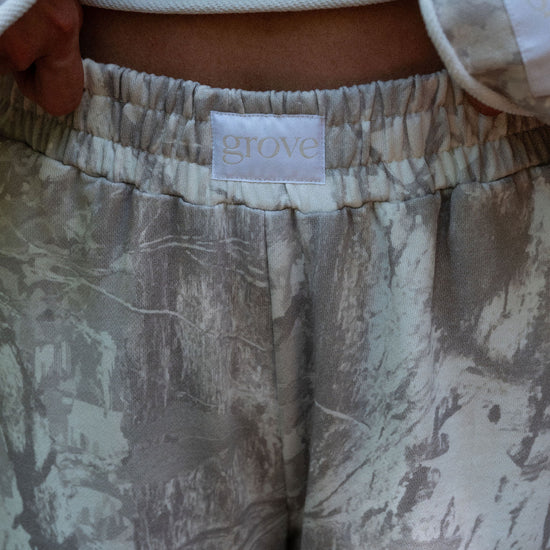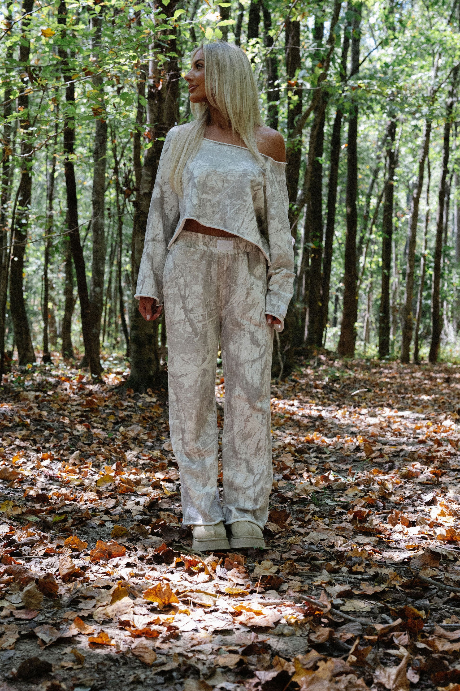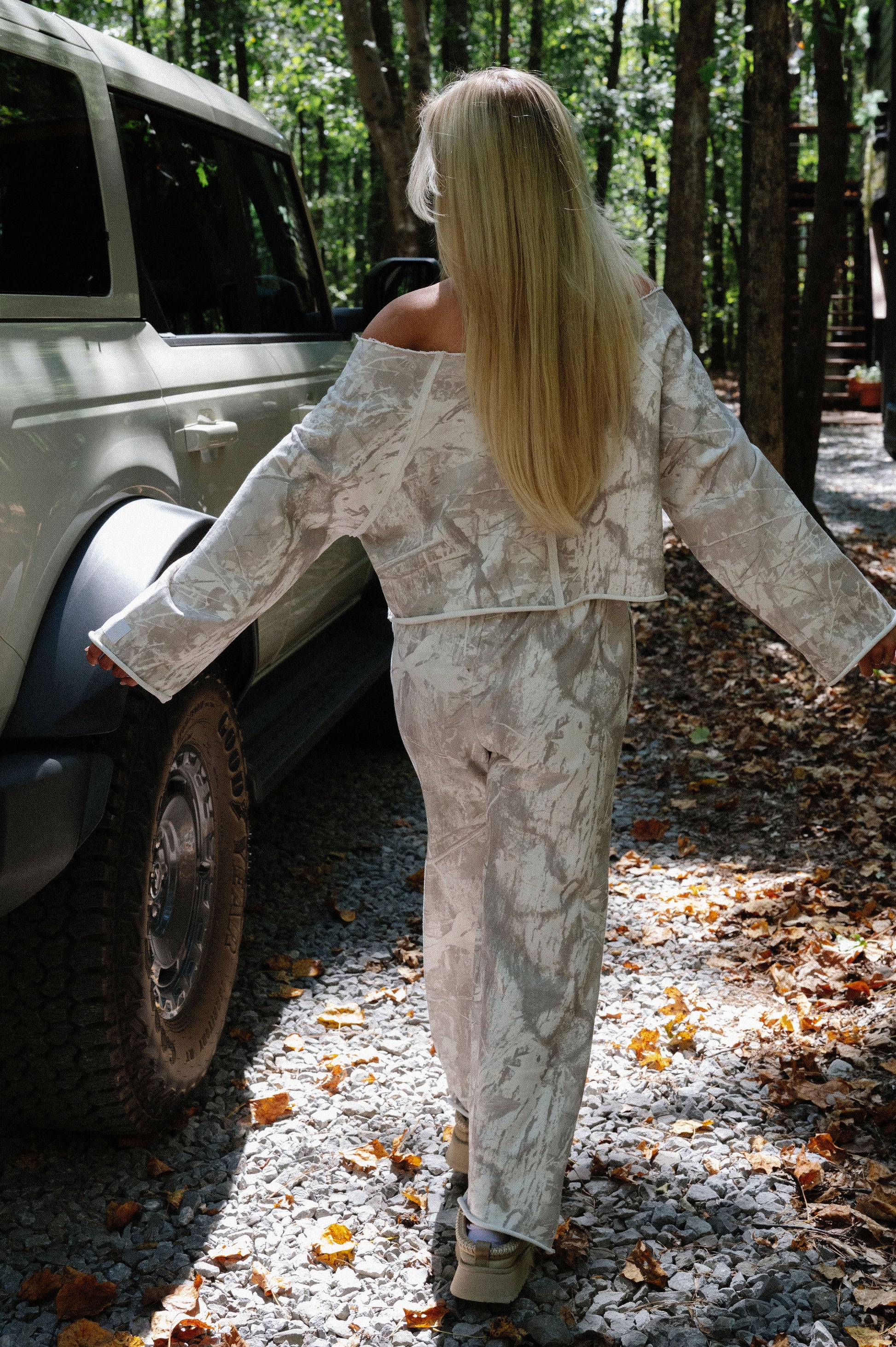 french terry camo wide leg sweatpant with a high waist, raw edge bottom hem, and patch on the waistband