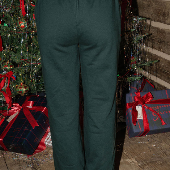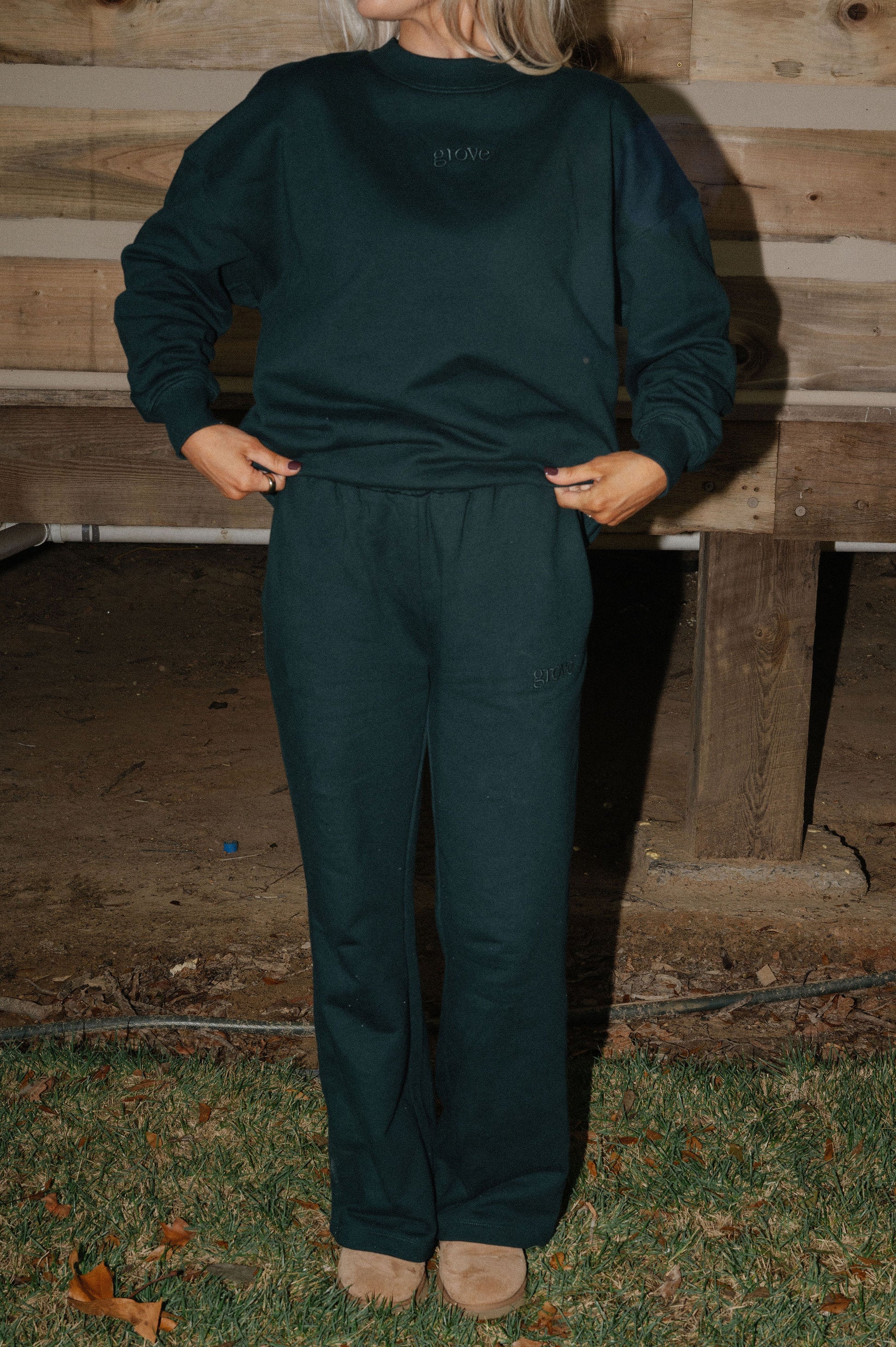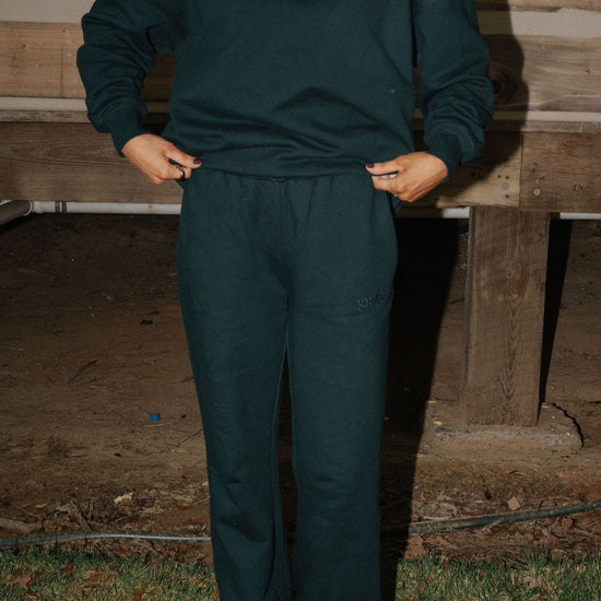 wide leg cotton sweatpant with a high waist, side pockets, and tonal embroidery below the pocket