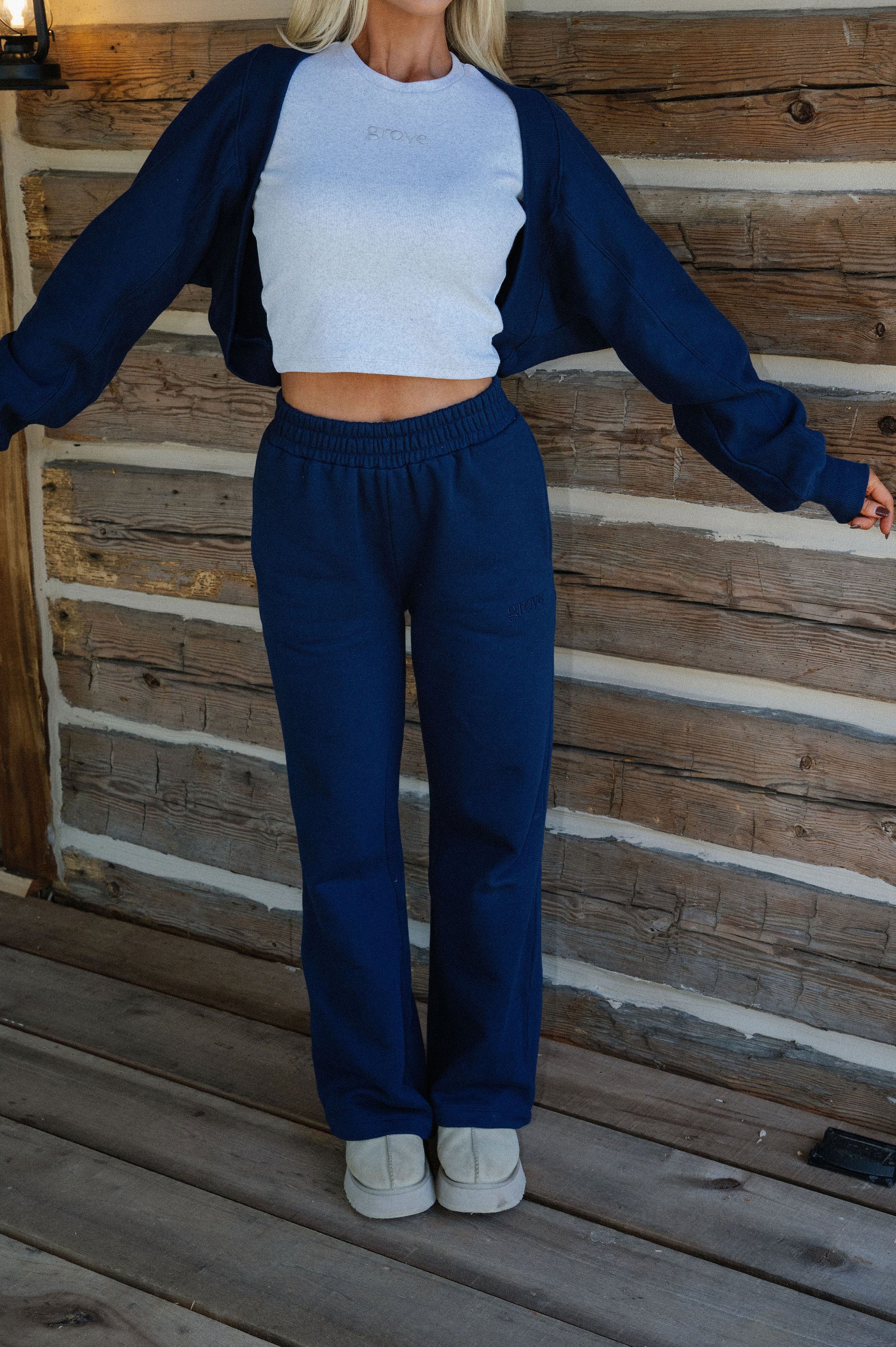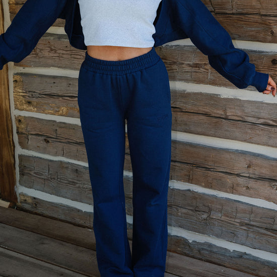 wide leg cotton sweatpant with a high waist, side pockets, and tonal embroidery below the pocket